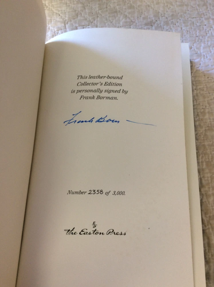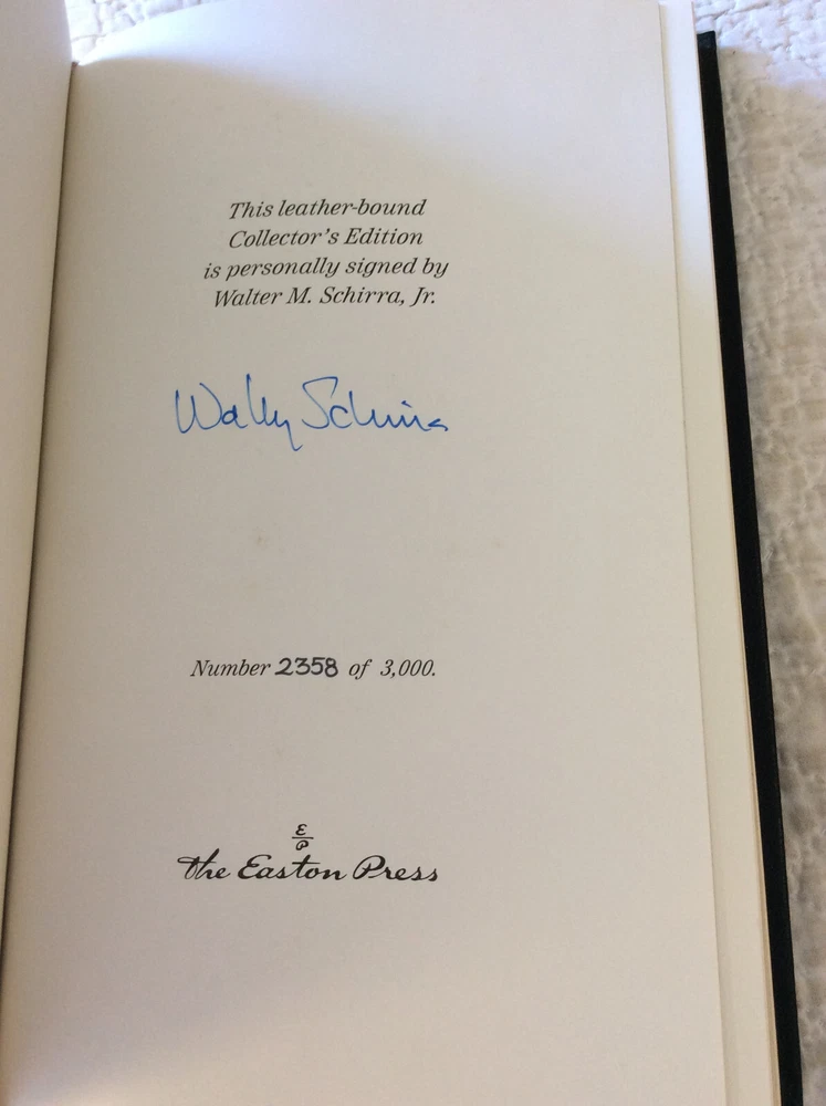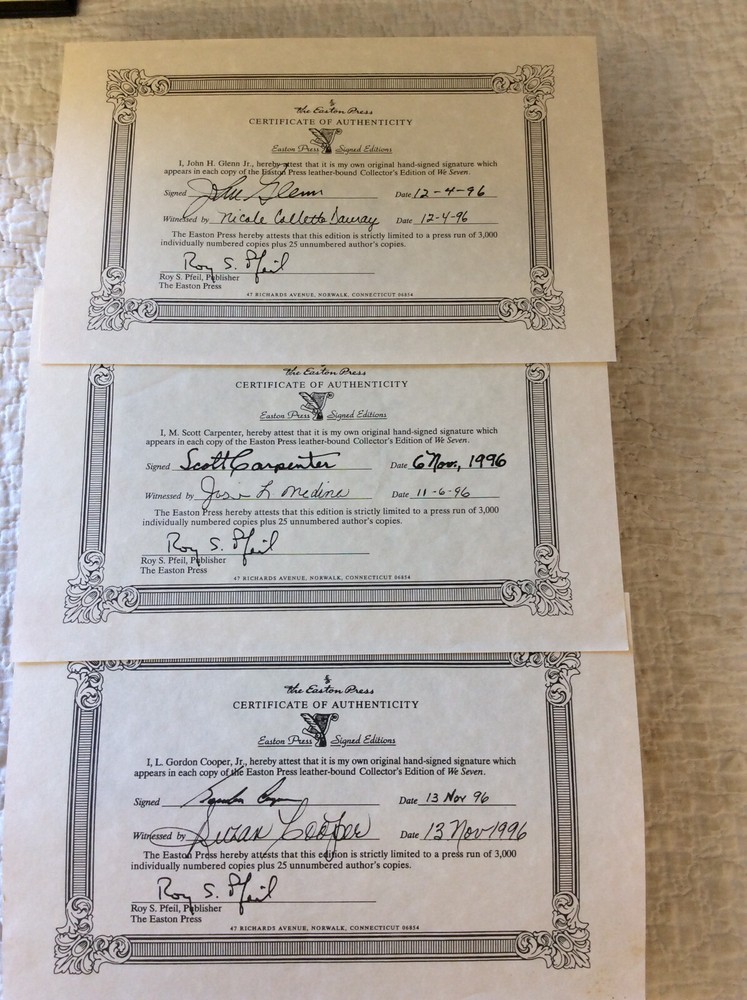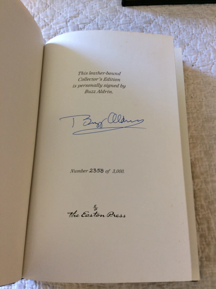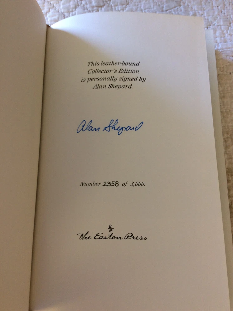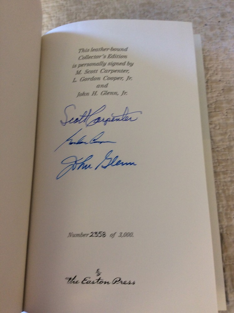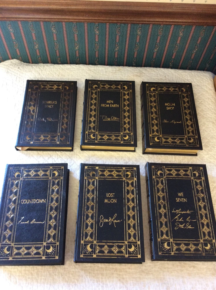 Buzz Aldrin and Malcolm Mcconnell Alan B Shepard and Deke Slayton James Lovell and Jeffrey Kluger Frank Borman with Robert J Serling Walter Schirra with Richard Billings Scott Carpenter, Gordon Cooper, and John Glenn THE ASTRONAUT'S LIBRARY: complete set: Men From Earth, Moon Shot, Lost Moon, Countdown, Schirra's Space, We Seven Norwalk CT: Easton Press, 1997. Collector's Edition. Leather bound. COMPLETE SIX VOLUME SET, SIGNED BY THE ASTRONAUTS . Bound in matching blue cloth decorated in gilt; gilt edges, moire endpapers, silk ribbon bookmarks. Near fine condition; some gilt on covers is lightly rubbed. The gilt edges on MOON SHOT are scratched; the other volumes have unscratched gilt edges. The original Easton Press Certificates of Authenticity are included with LOST MOON, COUNTDOWN, and WE SEVEN.