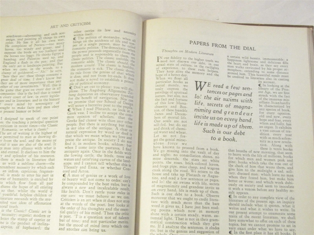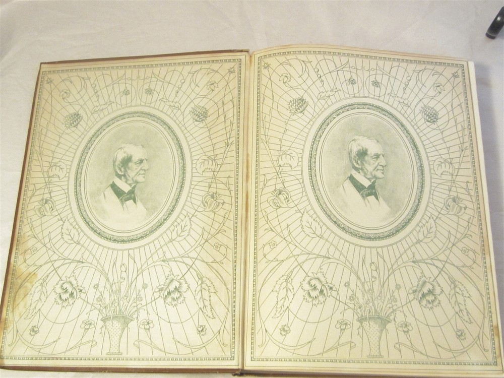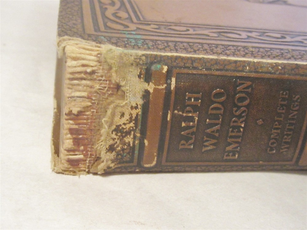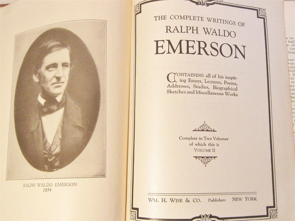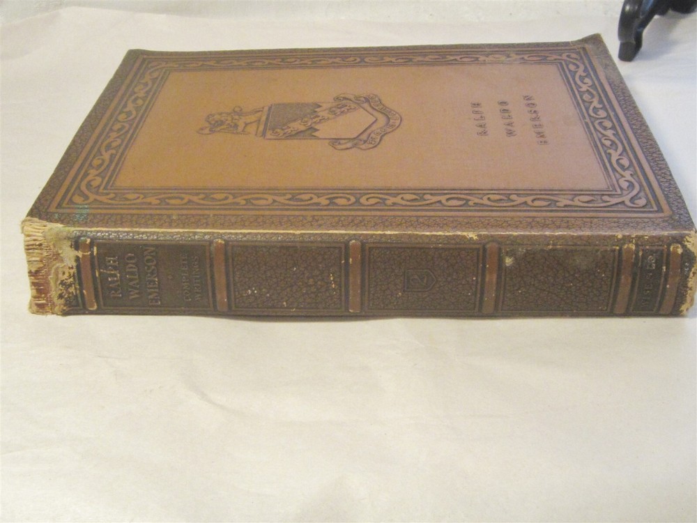 THE COMPLETE WRITINGS OF RALPH WALDO EMERSON . VOLUME 2. WM. H WISE & CO PUBLISHERS NEW YORK. COPYRIGHT 1929. CONTAINING ALL OF HIS INSPIRATIONAL ESSAYS, LECTURES, POEMS, ADDRESSES, STUDIES, BIOGRAPHICAL SKETCHES AND MISC WORKS. PAGES HAVE FADING . TOP AND BOTTOM BACK BINDING IS DAMAGED. TOP MORE SO. FEELS LIKE THE COVER IS LEATHER ??. USED VINTAGE CONDITION. SEE PICTURES FOR DETAILS AND CONDITION. Powered by SixBit's eCommerce Solution