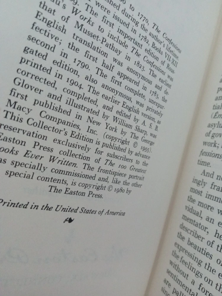 he Confessions Of Jean-Jacques Rousseau. Beautiful illustrations by William Sharp. Copyright 1980 The Easton Press. UNSIGNED Easton Press First Edition. Collector's edition. Accented in 22kt gold. Printed on archival paper with gilded edges. The endsheets are of moire fabric with a silk ribbon page marker. Smyth sewing and concealed muslin joints. This book is in full leather with hubbed spines. Loc.....L5
