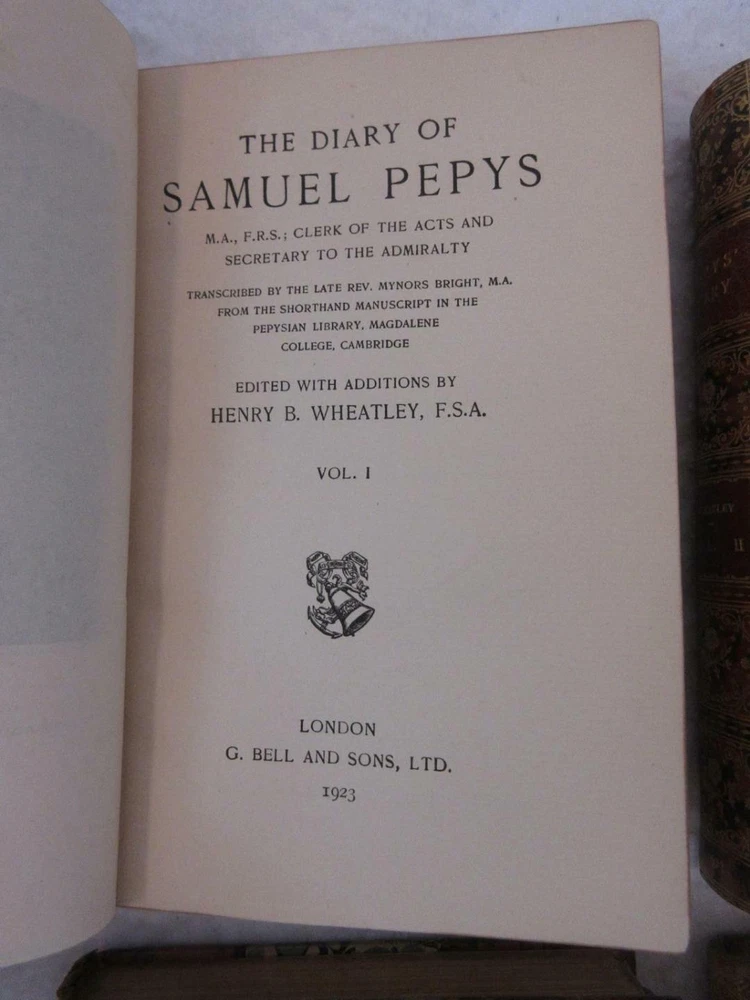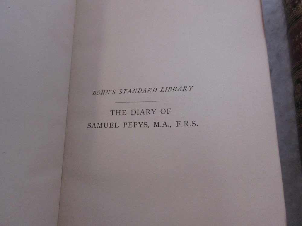 THE DIARY OF SAMUEL PEPYS 8 Vol's 1913 G. Bell & Sons BOHN'S Library Signed BAYNTUN Bindings First Bohn's Library Edition In very good condition. The front cover of Vol. 1 is cracked and holding by the cords. Please examine photos for details. Condition: We strive to describe and photograph the condition of every item as accurately as possible. Photos are of the actual item that is being sold. Please examine the photos carefully for any condition details and possible flaws. Best Offers: Items are available for offers only after being listed for 30 days. We consider all offers in relation to current market values. We try to respond almost immediately to most offers. Most of our counteroffers are firm but we are open to bargaining. Shipping: We combine shipping. When ordering multiple items from us please request a total before paying. We charge postage based on weight plus $1 for each eBay listing. All of our orders are packed carefully to prevent damage during shipment. We ship most of our items within 24 hours. Contact Us: We are available 7 days a week and are happy to answer any questions you may have. THE simple solution for eBay sellers.
