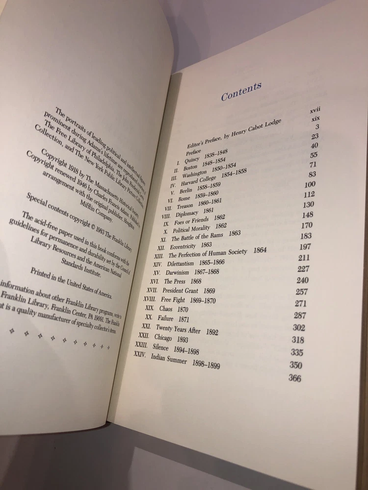 FOR SALE THE EDUCATION OF HENRY ADAMS By HENRY ADAMS Illustrated With Portaraits Of leading Figures Of The Day (THE FRANKLIN LIBRARY HC 1983) Features Includes all the classic Franklin editions *Bound in premium leatherette, *Distinctive cover design, *Hubbed spine accented in 22-karat gold *Endsheets of designed paper, *Thread sewn pages for strength and durability, *Gilded page edges for beauty and protection *Handsome readable typefaces, beautiful illustrations, archival-quality acid-neutral paper