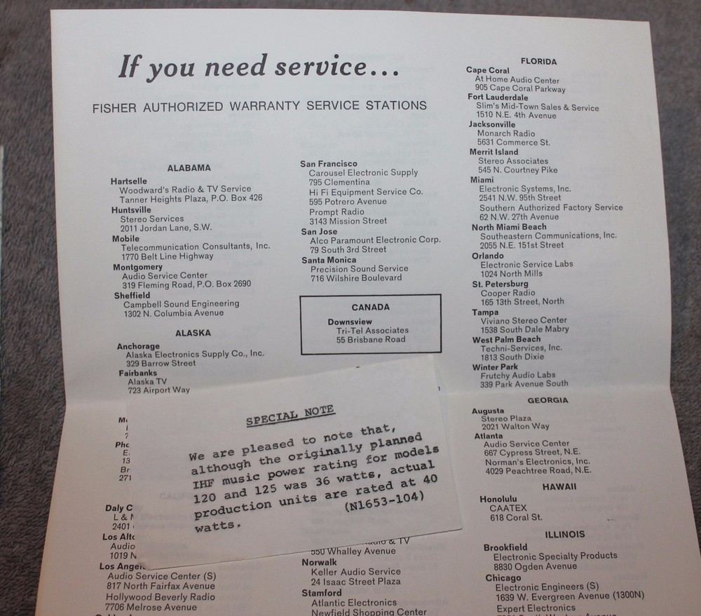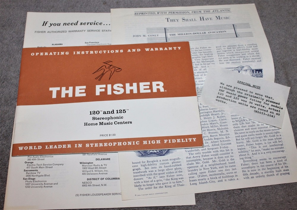 YOU ARE BIDDING ON A VINTAGE THE FISHER 120 AND 125 STEREOPHONIC HOME MUSIC CENTERS OPERATING INSTRUCTIONS 1967, FISHER OWNERS PAMPHLET & AUTHORIZED WARRANTY SERVICE STATIONS. THEY ARE IN NICE CONDITION WITH SOME LIGHT WEAR, THE WARRANTY CARD IN NOT ATTACHED TO THE INSTRUCTIONS. PLEASE LOOK AT ALL PHOTOS AND ASK ANY QUESTIONS YOU MAY HAVE. REMEMBER THAT I SELL MOSTLY ANTIQUE AND VINTAGE ITEMS AND THAT THEY ARE MOSTLY LIKELY NOT BE PERFECT DO TO THE NATURE OF THEIR AGE. IF YOU HAVE A PROBLEM PLEASE CONTACT ME BEFORE LEAVING FEEDBACK.