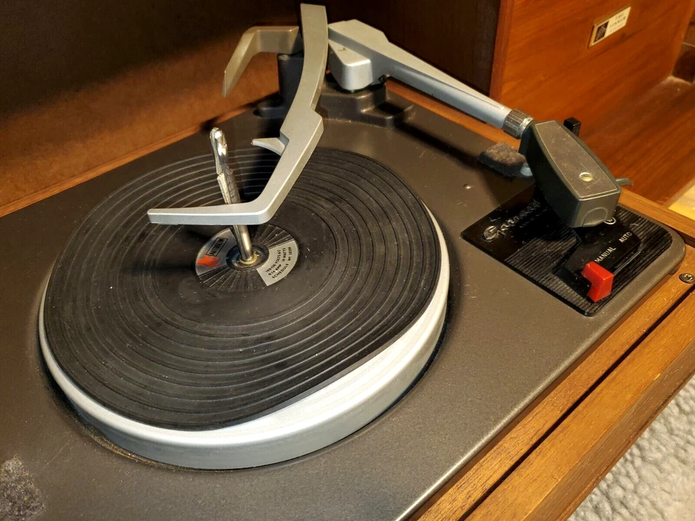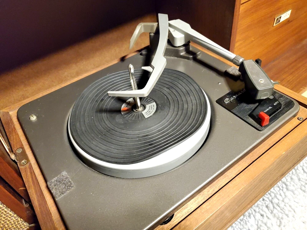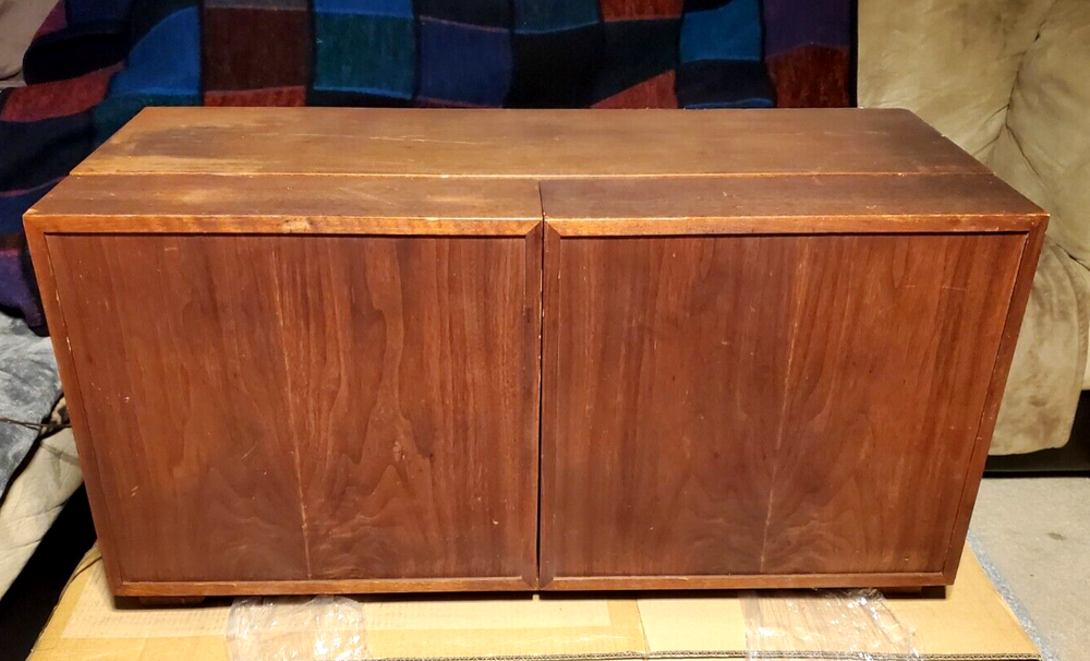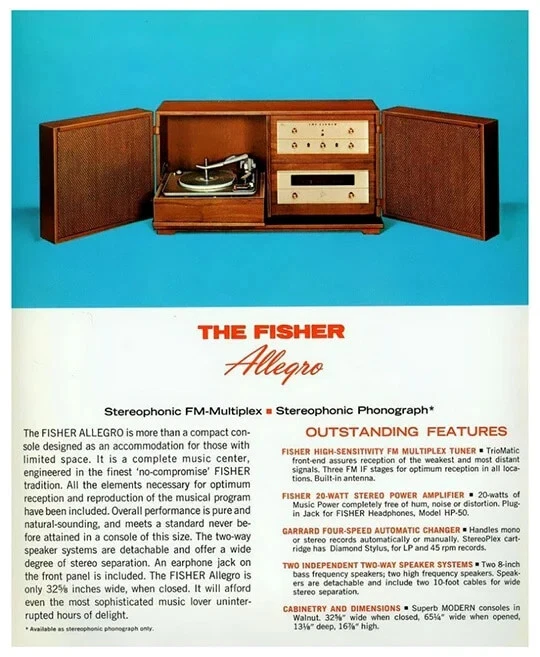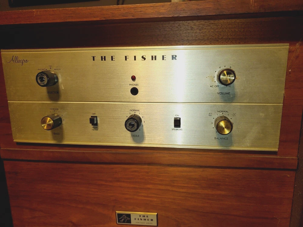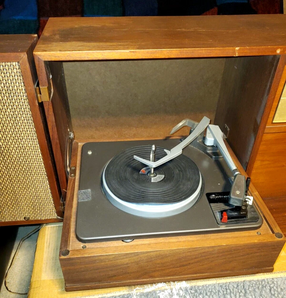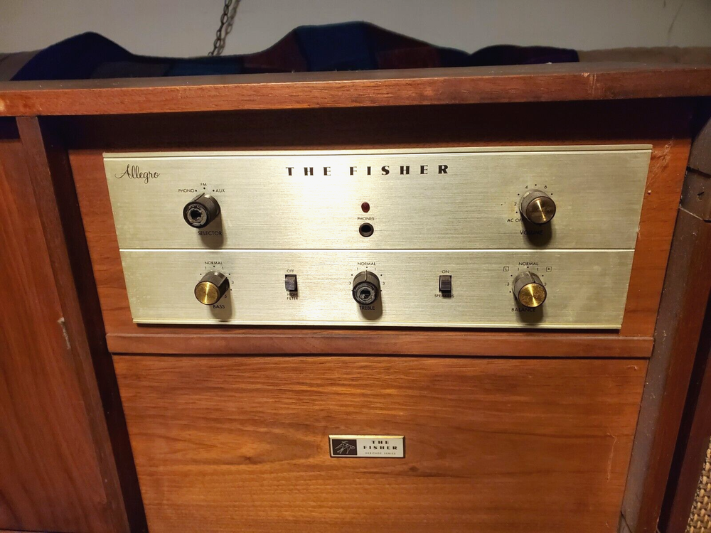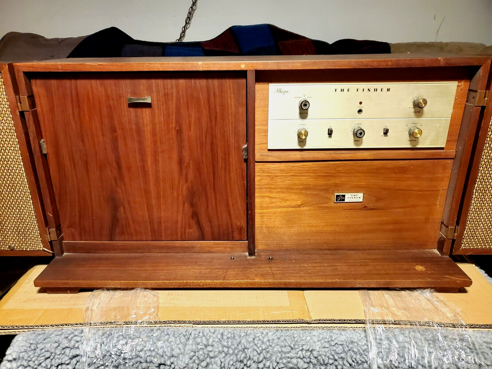 THE FISHER ALLEGRO A-19 PORTABLE TURNTABLE CONSOLE CABINET STEREO RADIO AS IS Up for your consideration is Very RARE Vintage The Fisher Allegro A-19 Portable Turntable Home Console circa the 1960's. This "model" of portable high fidelity stereo was a favorite of John F. Kennedy and he would travel the world with it! The stories say that an A-19 just like this unit was given to him by Avery Fisher and he would have it setup in hotels and houses for him when he traveled. At the time it was considered a "portable" unit which is funny to think about it now however back in the 1960's this was the cream of the crop in terms of record players and although heavy, when folded up it is a manageable size. It opens to reveal the hinged speakers and fold down turntable. The unit is in very good original condition and will be sold AS IS. It powers up, the red light comes on and the one speaker that is still wired makes a hiss or pop sound when turned on. The record player seems to be working, it did complete an automatic cycle by lifting the arm, moving it to the turntable, and lowering to a record HOWEVER we did NOT fidget with it too much and will leave that up to you or a professional. We have seen other examples where they have modified the cabinet by attaching legs to the bottom for added height however this unit comes in its original form with NO Legs, ready for customization. Please take a good look at the pictures and ask any questions. Overall a highly desirable unit so do not hesitate to add this to your collection. Please be sure to see the other antiques and collectibles items we have listed. ***PLEASE NOTE*** There is no shipping for this item. We will work closely with any private carrier you may hire through UShip, we will superficially wrap it for safer shipping. It can be viewed and/or Picked Up in Fox Lake IL 60020. Feel free to eBay mail me for more info. FEATURES: Vintage The Fischer Allegro Model A-19 Turntable Console Stereo Cabinet made with walnut wood grain finish. Comes AS IS....Unit powers up (Please see video and read condition carefully). Garrard Turntable. Adjustments for Bass, Treble, and Balance. Made in the USA. Same Unit John F. Kennedy used for travelling. RARE, Highly Desirable Unit Perfect for Music Collectors. ***** We prefer local pickup for this from Fox Lake, IL 60020 however we could hand deliver this to you up to 150 miles from that zip code for a fee to be determined at the time. Or there is a white glove service that will pick it up and deliver to your location for a reasonable fee. Please contact us for more information ***** Although this is sold for pick-up only, you can have a private transport service pick-up and deliver this item to your door. To find a mover and get a quote - you can use a service like U-ship. It's like eBay for the transport of bigger items that can't go through standard shipping service like FedEx or UPS. The way it works is you post a potential item/job on the site and wait for "bids" (a proposed cost to transport your item). You could post the information from our eBay listing, even the item number - so they can see the items you want moved - you would also enter the size and approximate weight, the pick-up and ship-to locations - and the time frame you need it by. Obviously allowing some flexibility to the transport service in scheduling the p.u. and delivery will get you a lower bid price. But that is about it, and soon after posting you will get proposals (quotes) from several different service providers. We are also happy to work with whatever shipping service you choose and will even help them prep the item for safer transport, (i.e. cover glass with cardboard, or stretch wrap corners with cardboard, or box attachments or loose parts separately, or assist in loading, basically whatever is necessary to help ensure a safer trip for this item to your home. We have had several happy customers that have used U-Ship in the past. You can find U-ship at www.uship.com Take a look and please feel free to message us if you have any questions. HISTORY: Avery Fisher was born in the Yorkville section of Manhattan into a family to whom music was an important part of recreational life. His father, Charles Fisher, a real estate specialist, owned one of the nation's biggest collections of acoustic horn gramophones. The boy Avery was allowed to study the violin as early as he wanted to, which was pretty early. As Fisher grew, so did his proficiency of the violin, often participating as a first or second fiddle at a nearby chamber music concert hall with visiting companies. Despite this musically-bent upbringing, he majored in biology at NYU, then took an entirely different direction for his first profession, a book and typographical designer at Dodd Mead Co, book publishers. Avery became very good at this, designing many successful books, although his desire for music & the ability to electronically reproduce it as accurately as possible got the best of him. After years of tinkering around with audio circuits in his free time, Avery successfully developed audio equipment capable of outperforming the professional equipment standards of the day. By 1937, his profession (book designing) and avocation (high fidelity) exchanged places, and he founded one of the first audio companies devoted to developing high-quality components for home use, Philharmonic Radio Corporation (PRC). At PRC, Avery produced components of uncommonly high quality, and his company was quite successful from the get-go. However, with the onset of WWII the entire consumer audio and radio industries came to a halt virtually overnight. Like so many other companies, PRC shifted its production to that of electronic mechanisms for war. At this time, Avery sold his company to a big corporation, although he continued to direct it through the duration of hostilities. Despite the many horrors the war brought to the world, one of the positive things it contributed was the technical know