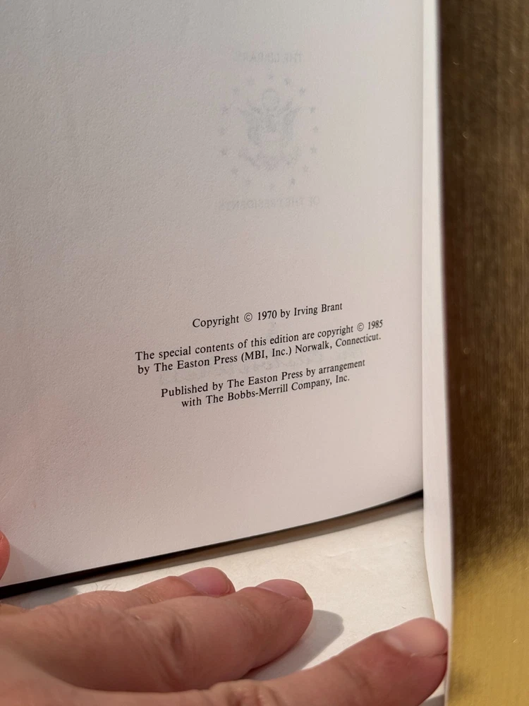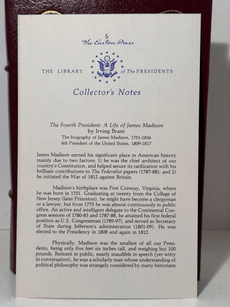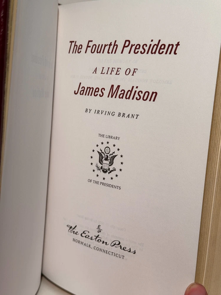 You are bidding on a very fine copy of a 1st Edition, 1st Printing of the Easton Press' THE LIBRARY OF THE PRESIDENTS series edition of Irving Brant's THE FOURTH PRESIDENT - A LIFE OF JAMES MADISON. This is a one-volume edition about the life and work of the fourth President of the United States, James Madison. Bound in beautiful genuine moroccan cowhide leather, the book features raised bars on the spine, gold tooling on the cover and spine, End-pages decorated with the seals of the U.S. Presidents, satin silk sewn-in bookmark, 22k gold dust on page ends on all 3 sides. Printed on archival quality acid-neutral paper, that will last for generations without diminishing in quality or looks. INCLUDES ORIGINAL, LIBRARY OF THE PRESIDENTS INSERT. LIMITED, COLLECTOR'S EDITION FROM THE SERIES OF THE LIBRARY OF THE PRESIDENTS. Free Shipping in all of Continental United States. All other buyers, please check with me for shipping rates before bidding. ***NOTE: If you are dissatisfied with your purchase for any reason, please contact me first directly, and I will do all in my power to make sure you are satisfied with your purchase. *** See my other listings. I have a large collection of rare and collectible books, most leatherbound, others of first edition, first printing, even unpublished manuscripts. I will combine them during shipping so you can receive them together. Just message me your intent to buy more than one book, and I will hold them to be shipped together. Abell Happy Buying!