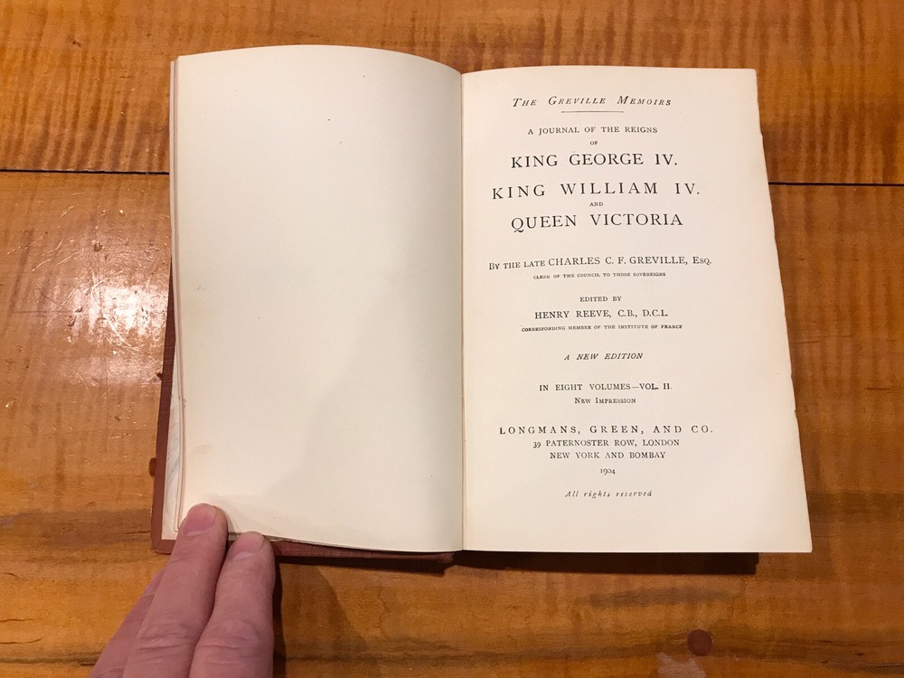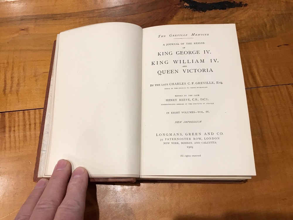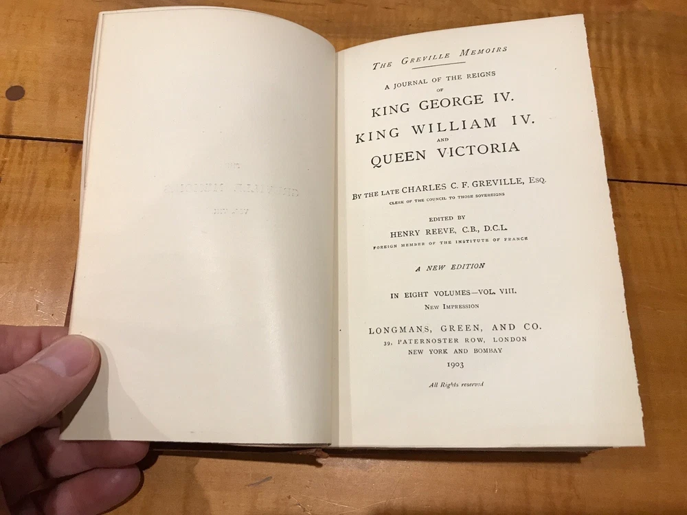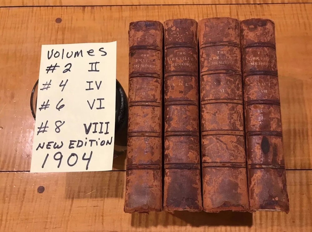 THE GREVILLE MOMOIRS A JOURNAL OF THE REIGNS OF KING GEORGE IV KING WILLIAM IV AND QUEEN VICTORIA A NEW EDITION DATED 1904 BY CHARLES C.F. GREVILLE Edited by HENRY REEVE 4 VOLUMES #2 , #4, #6, & volume #8 Printed in London by Longman’s Green, and company 1/4 BOUND LEATHER GILT TOP EDGES MARBLED END PAPERS ALL 4 VOLUMES ARE CLEAN WITH TIGHT BINDINGS NO RIPS TEARS OR MARKINGS. Just volume 6 has a cracked hinge but still solid and intact. ALL 4 VOLUMES SHOW MODERATE WEAR ON LEATHER SPLINES BUT NORMAL FOR THE AGE. CAN SAY ENOUGH ABOUT HOW EXCEPTIONALLY CLEAN THESE 4 VOLUMES ARE ON THE INTERIOR. LOOK OVER AND SEE ALL 12 PICTURES PLEASE LOOK OVER ALL THE PICTURES I GENERALLY TAKE 12 and USE PICTURE IN PICTURE TO SAVE SPACE AND PROVIDE AS MUCH DETAIL AS POSSIBLE. PLEASE JUDGE CONDITION FOR YOURSELF. I WILL ALWAYS POINT OUT ANYTHING AND DO MY BEST TO DESCRIBE AS MUCH AS POSSIBLE. NO RESERVE NEVER !! I WILL NOT END AUCTIONS EARLY. All the records radio parts pieces paper catalogs & phonograph items we list come from the estate of Dr. James M. Kinney of New Windsor, Maryland, one of the East Coast’s largest record collectors. Do not hesitate to make a reasonable offer on Buy-It-Now items. Your satisfaction is my goal. If you want additional information, or more pictures, please contact me. INVOICING: If you'd like combined shipping rates, or if you'd like any shipping changes (upgraded shipping, insurance, or signature confirmation), PLEASE ASK SHIPPING: INTERNATIONAL SHIPPING: Please do not ask me to circumnavigate custom and duty laws. I will do everything to provide the most economical & safest shipping i possibly can.