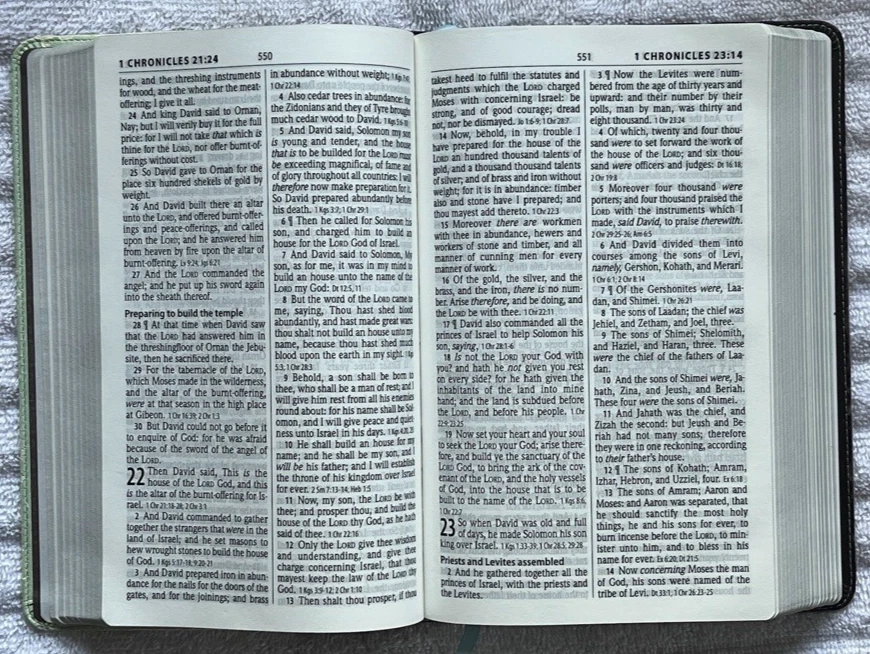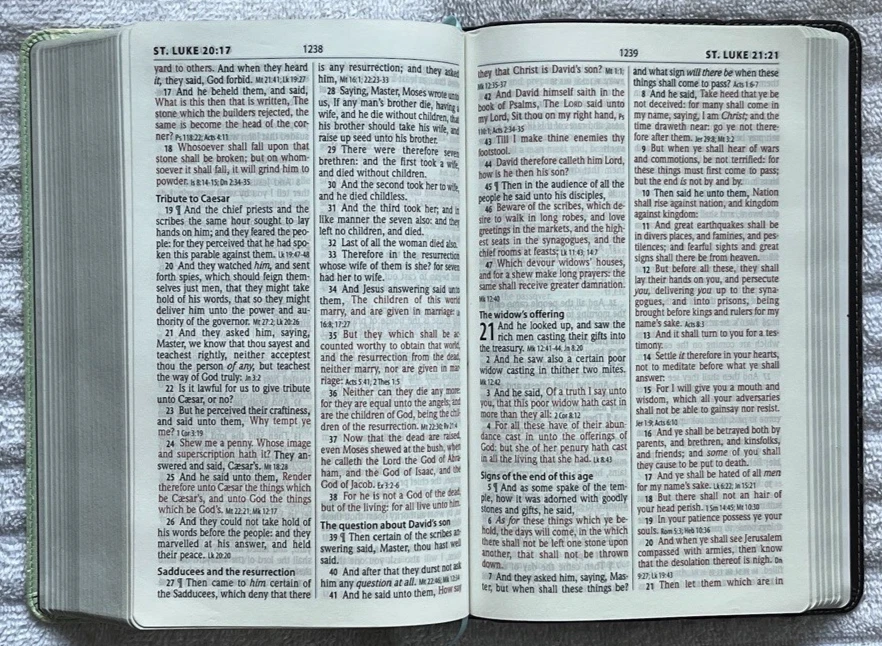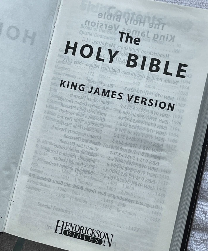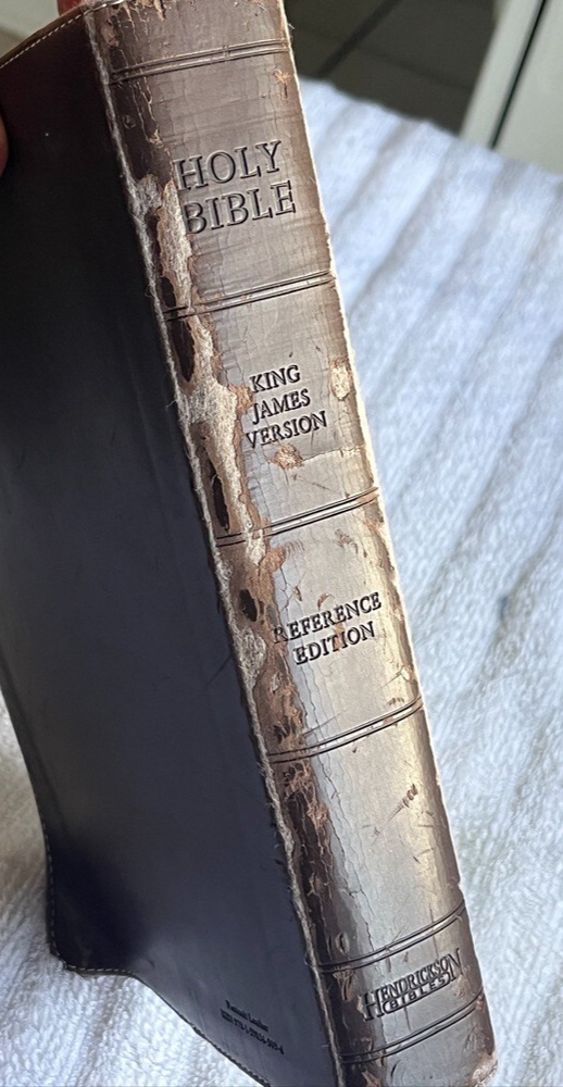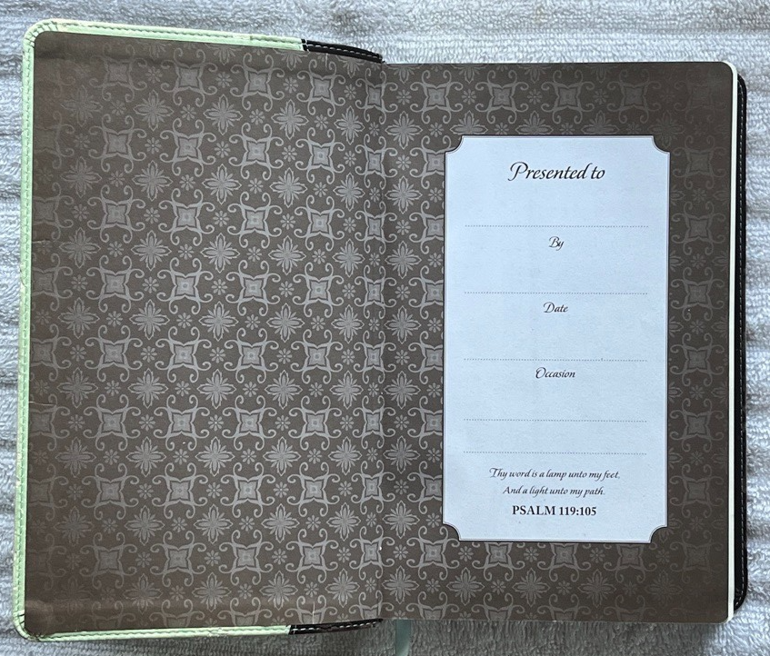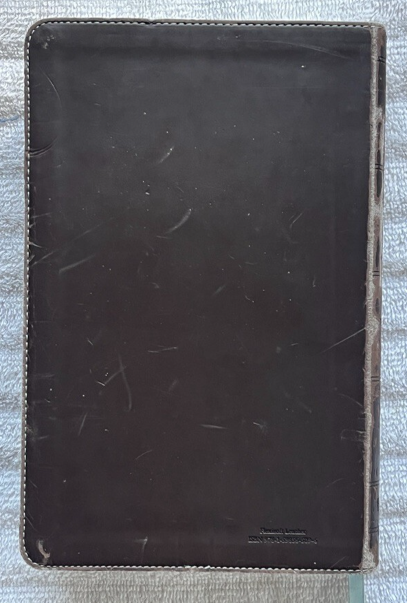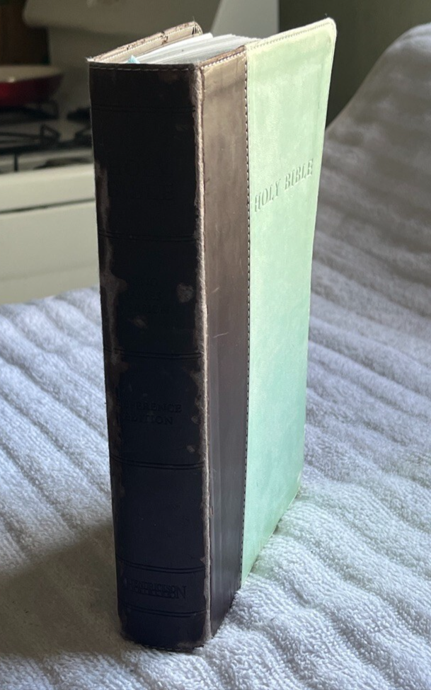 “THE HOLY BIBLE — KING JAMES VERSION — REFERENCE EDITION”. PUBLISHED IN MAY, 2013 BY HENDRICKSON PUBLISHERS / CHOCOLATE AND MINT COLORED FLEXISOFT LEATHER COVERS / SEWN-IN SILVER CLOTH BOOKMARK / COLOR MAP SECTION / ILLUSTRATED PRINT ENDPAPERS / 1622+ PAGES. BOOK IS IN TERRIFIC SHAPE — CLEAN AND TIGHT WITH LIGHT OVERALL STORAGE AND SHELF WEAR… WORN SPOTS ON THE FLEXISOFT COVERS, ESPECIALLY ON THE SPINE, BUT NOTHING EGREGIOUS. A HANDSOME COPY! WE HAVE OVER 23 YEARS EXPERIENCE SELLING COLLECTIBLE AND RARE RECORDS AND BOOKS, AS WELL AS POP CULTURE COLLECTIBLES, EPHEMERA, AND EFFLUVIA!!! ALL OUR ITEMS ARE PERSONALLY INSPECTED AND CONSERVATIVELY GRADED! SO, BUY WITH CONFIDENCE!!!