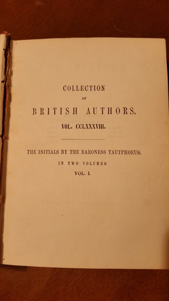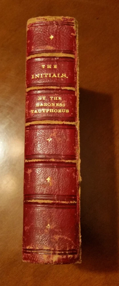 "THE INITIALS" BARONESS TAUTPHOEUS , 1854 Two volumes in one: 346 + 347 pp. 3/4 leather with marbled paper covered boards. The front hinge is loose but attached. Binding is good, square except Boards are edgeworn. Written by the Baroness von Tautphoeus (nee Jemina Montgomery), a native of Dublin, Her husband was Chamberlain to the King of Bavaria. As one would expect of a 150 year old book, it's quite worn but despite that it is a lovely volume. The images shown are of this book.