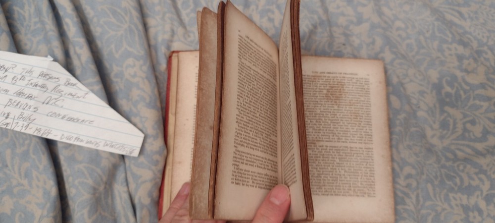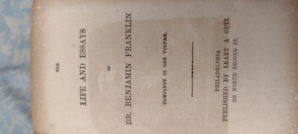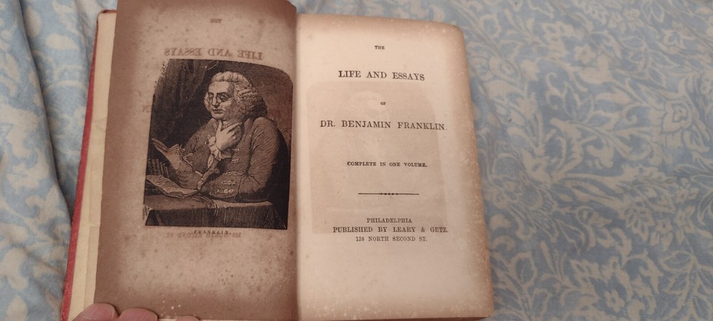 VERY RARE Publishing of this book (Leary & Getz) that is also hard to find with dates before 1860. Also, In all my research I was unable to find even ONE copy with no date and with this Leary & Getz red cover.AND, it may have had a known confederate soldier (Smiling Billy) from Halifax N.C. as its owner a few years before he was killed in the Civil War. I just bought this book at an estate sale with NO history other than THEY SAID it was an 1854 printing but I wonder why there is no date--first or much earlier printing MAYBE?? I couldn't find a printed date in this book and there definitely is NOT one where all the other older books I saw DO.. Please ask ALL questions and examine the photos closely BEFORE BUYING because there are NO returns and NEVER ANY partial refunds. Shipping is FREE and there is a physical signature required on the buyers end.I would also be VERY happy to hear anything any Franklin book expert can tell me about this book on whether I have it priced too high or low and why.