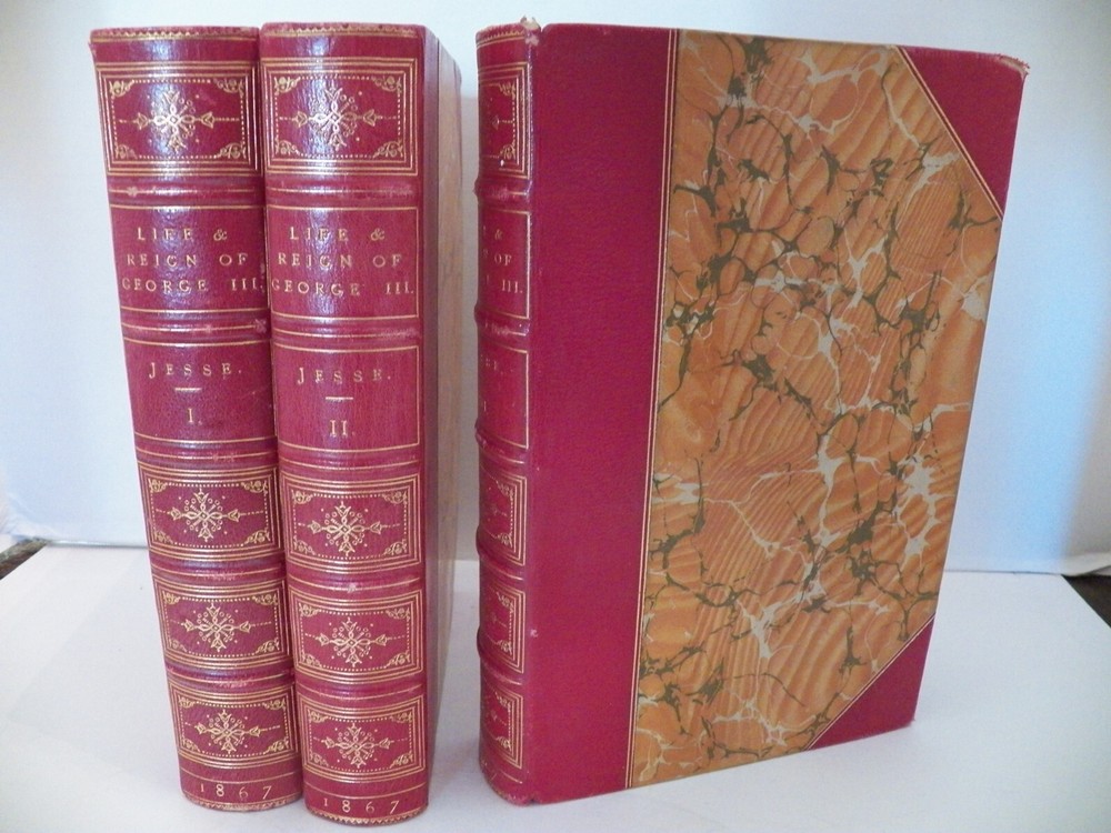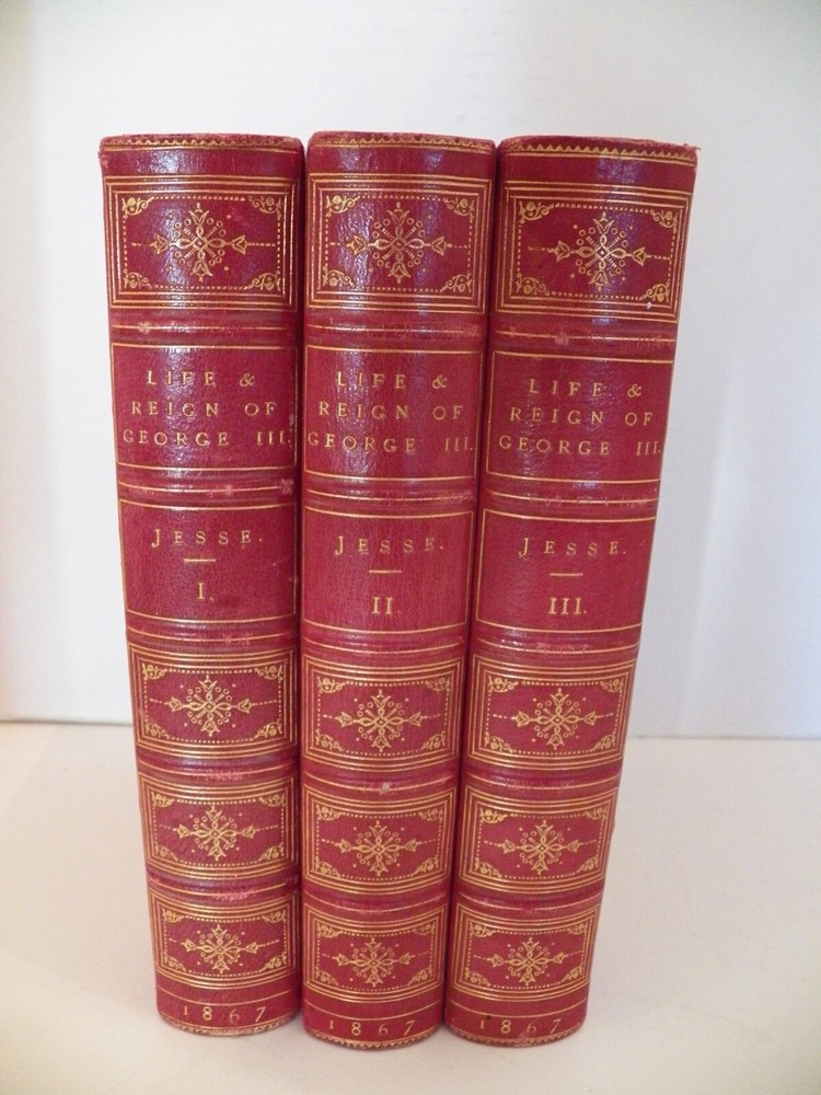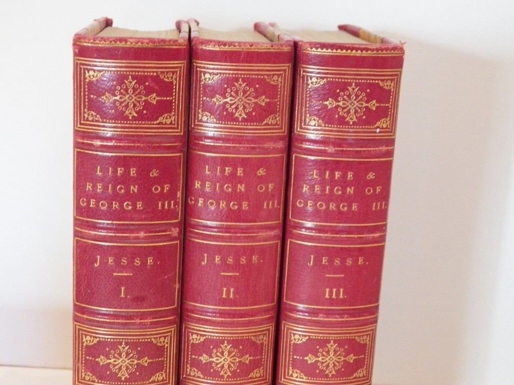 LIFE AND REIGN OF KING GEORGE THE THIRD, 3 VOLUMES IN 1/4 RED LEATHER AND CORNERS BY J. HENEAGE JESSE, 2ND EDITION. THESE ARE IN NICE CONDITION FOR THEIR AGE, JUST A FEW RUBS AND BUMPS ON THE LEATHER EDGES. THERE IS A PERSONALIZED BOOK PLATE INSIDE VOLUME I Dimensions: 9" X 6" Please email early with questions.