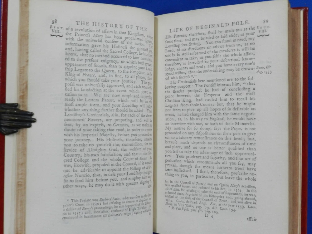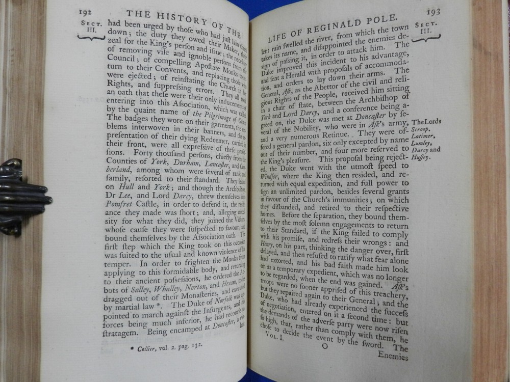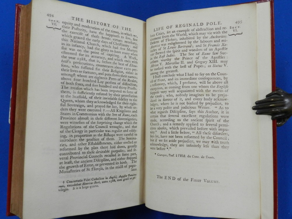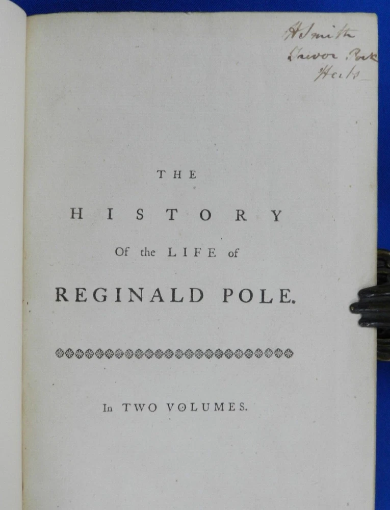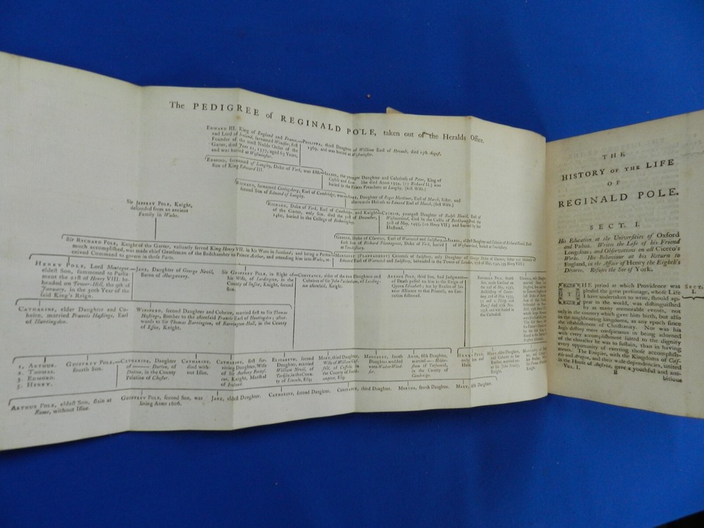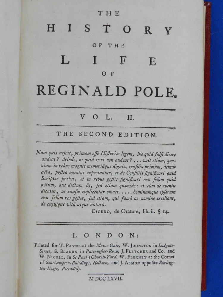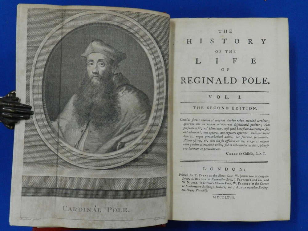 The is the 1767 Complete 2-Volume Second Edition (First published in 1764) of THE HISTORY OF THE LIFE OF (Cardial) REGINALD POLE, by Thomas Phillips (1708-1774) Published in London in octavos measuring 5" x 8.25". Both volumes retain their original half-titles with new endpapers supplied when rebound. Volume I has a folding frontispiece portrait of Pole after Raphael and engraved by Major followed by [xxxii], 495 pp. with a folding table of the "Pedigree" of Pole facing p. 1. Volume II contains xii, 340 pp. and both are uniformly bound in modern gilt-paneled red leather titled and decorated in gilt on the spines. Per Wikipedia: Reginald Pole (12 March 1500 – 17 November 1558) was an English cardinal and the last Catholic archbishop of Canterbury , holding the office from 1556 to 1558, during the Counter-Reformation . Early life Pole was born at Stourton Castle , Staffordshire , on 12 March 1500, the third son of Sir Richard Pole and Margaret Pole, 8th Countess of Salisbury . He was named after the now beatified Reginald of Orleans, O.P. His maternal grandparents were George Plantagenet, 1st Duke of Clarence , and Isabel Neville, Duchess of Clarence ; thus he was a great-nephew of kings Edward IV and Richard III and a great-grandson of Richard Neville, 16th Earl of Warwick . Accounts vary as to where Pole received his early education: either Sheen Priory , Christchurch or Canterbury . Shortly thereafter, he matriculated at Magdalen College, Oxford , in 1512. At Oxford he was taught by William Latimer , his principal tutor, and Thomas Linacre , who taught him at some point between 1518 and 1520. In 1512, Henry VIII had paid him a pension of £12, renewed the following year; intended to go towards his education. Pole graduated with a BA degree on 27 June 1515. In February 1518, King Henry VIII granted him the deanery of Wimborne Minster , Dorset . He went on to be Prebendary of Salisbury , and Dean of Exeter in 1527. On 19 March 1518 he was appointed prebend of Ruscombe Southbury, Salisbury , only to exchange that on 10 April 1519 for Yetminster secunda . He was also a canon in York , and had several other livings, albeit not yet ordained a priest. Assisted by Bishop Edward Foxe , he represented Henry VIII in Paris in 1529, probing general opinion among theologians of the Sorbonne on the annulment of Henry's marriage with Catherine of Aragon . In 1521, with a £100 stipend from King Henry VIII, Pole went to the University of Padua . It was here that he met leading Renaissance figures, including Pietro Bembo , Gianmatteo Giberti (formerly Pope Leo X 's datary and chief minister), Jacopo Sadoleto , Gianpietro Carafa (the future Pope Paul IV ), Rodolfo Pio , Otto Truchsess , Stanislaus Hosius , Cristoforo Madruzzo , Giovanni Morone , Pier Paolo Vergerio the younger , Peter Martyr Vermigli and Vettor Soranzo. The last three were eventually to be condemned as heretics by the Catholic Church. As a protestant theologian widely known, Vermigli contributed significantly to the Reformation in Pole's native England. Pole's studies in Padua were partly financed by his election as a fellow of Corpus Christi College, Oxford . More than half of the cost was met by Henry VIII himself, on 14 February 1523. This allowed him to study abroad for three years. While in Padua, Reginald's brother, Henry, Lord Montagu, presented to him the living of South Harting, Sussex on 10 April 1526. Three months later, Pole returned home, arriving from France escorted by Thomas Lupset . He was appointed prebend of Knaresborough in York Minster on 22 April 1527. On 25 July 1527, Pole was presented a canonry in Exeter Cathedral , to be declared Dean just four days later. Pole was sent to Paris in October 1529, but returned home in the summer of 1530. For some of his time in England he lived in John Colet's former house at Sheen. Pole and Henry VIII Pole had most probably arrived back in England in 1527, but whatever political influence he had acquired was not documented until November 1528. By the following October, his being sent to Paris had been expressly to liberate from the university doctors an agreeable opinion on Henry VIII’s annulment. It is possible that Pole started learning Hebrew from Robert Wakefield after he returned home from France, which would suggest that Henry might have wanted to deploy Pole in the annulment project. Henry offered him the Archbishopric of York or the Diocese of Winchester if he would support the annulment of his marriage to Catherine of Aragon . It is likely that in May or June 1531 Pole furnished Henry with an analysis of the political difficulties with regard to a divorce, particularly the dangers this would bring to the succession. Pole withheld his support and went into self-imposed exile in France and Italy in 1532, where he continued his studies in Padua and Paris . After his return, he held the benefice of vicar of Piddletown , Dorset, between 20 December 1532 and sometime around January 1536. In May 1536, Reginald Pole finally and decisively broke with the King. Five years earlier, he had warned of the dangers of the Boleyn marriage; he had returned to Padua in 1532 and received a last English benefice that December. Eustace Chapuys , the imperial ambassador to England , had suggested to Emperor Charles V that Pole marry Henry's daughter Mary and combine their dynastic claims; Chapuys also communicated with Reginald through his brother Geoffrey. At this time Pole was not definitively in Holy Orders. The final break between Pole and Henry followed upon Thomas Cromwell , Cuthbert Tunstall , Thomas Starkey and others addressing questions to Pole on behalf of Henry. He answered by sending the king a copy of his published treatise Pro ecclesiasticae unitatis defensione , which, besides being a theological reply to the questions, was a strong denunciation of the king's policies, refuting Henry's position on marrying his brother Arthur's widow and denying the royal supremacy. Pole also