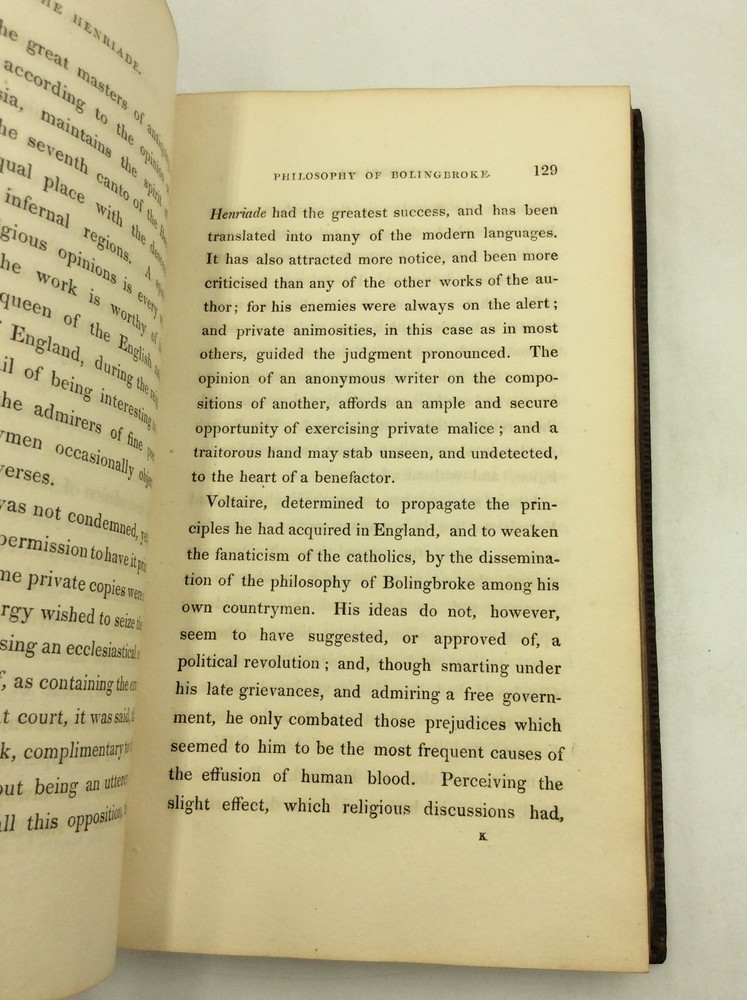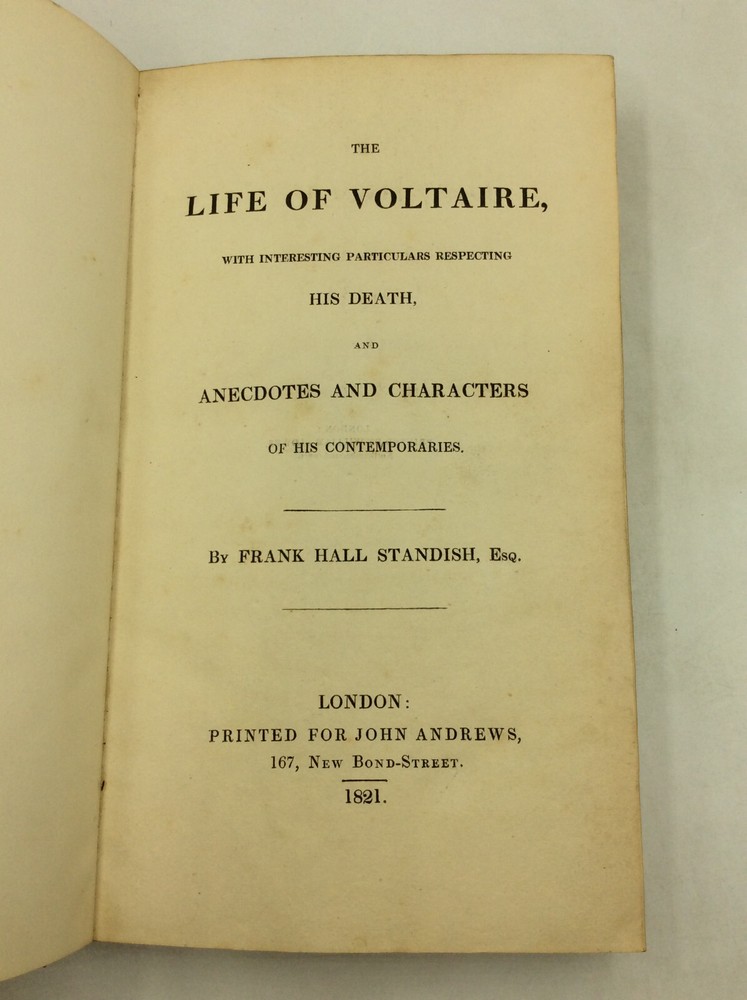 Frank Hill Standish THE LIFE OF VOLTAIRE, with Interesting Particulars Respecting His Death, and Anecdotes and Characters of His Contemporaries. London: John Andrews, 1821. First Edition, First Printing. Leather. 393p. A hardcover book bound in full brown leather with gilt borders and gilt decorations on the spine. Excellent condition for its age! The corners are lightly rubbed and darkened; very light chafing slong the edges as well. Fairly unobtrusive foxing on endpapers and main pages; otherwise, text clean and binding tight. A handsome volume for the antiquarian collector! Item #181510 A scarce biography of the Enlightenment philosopher.