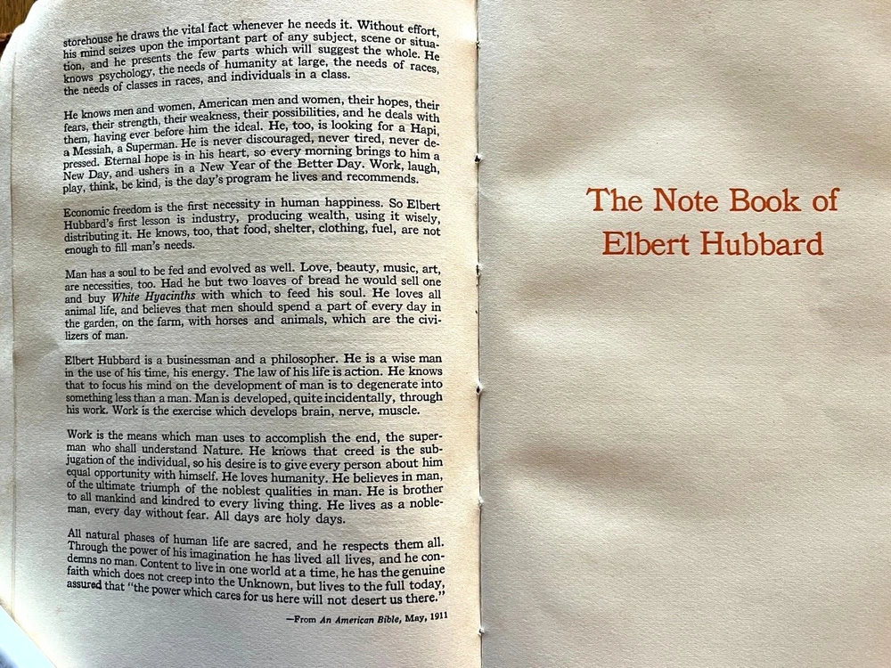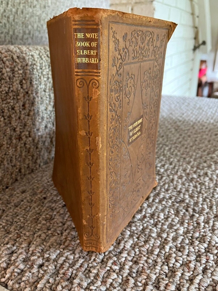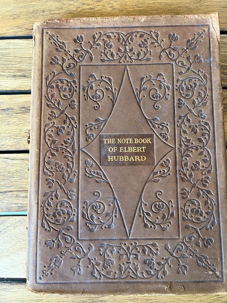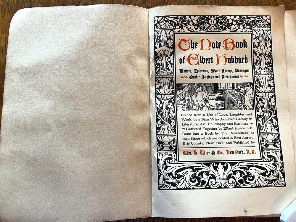 THE NOTE BOOK OF ELBERT HUBBARD The Note Book of Elbert Hubbard: Mottos, Epigrams, Short Essays, Passages, Orphic Sayings and Preachments Elbert Hubbard Written by Elbert Hubbard. 1927, first edition. Printed by The Roycrofters, East Aurora. William Wise & Co., Roycroft Distributors, New York City. Elbert Green Hubbard (1856 – 1915) was an important force in the American Arts and Crafts Movement, inspired by the work of William Morris, and in 1895 he founded the Roycroft artists' community in East Aurora, NY. The Note Book of Elbert Hubbard, collected posthumously by his second wife, is an excellent example of the Roycroft printmakers' craft, utilizing handmade papers and block printing. 17 x 24 x 2cm, 18oz, indexed, 214pp mb