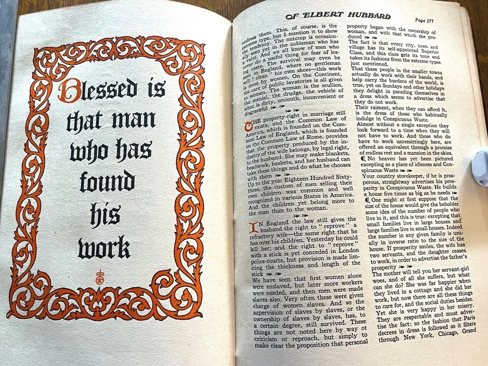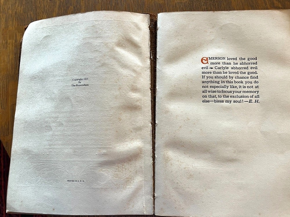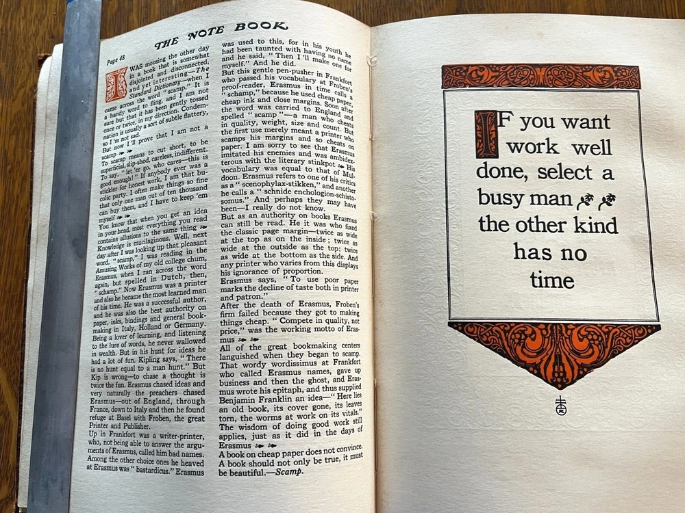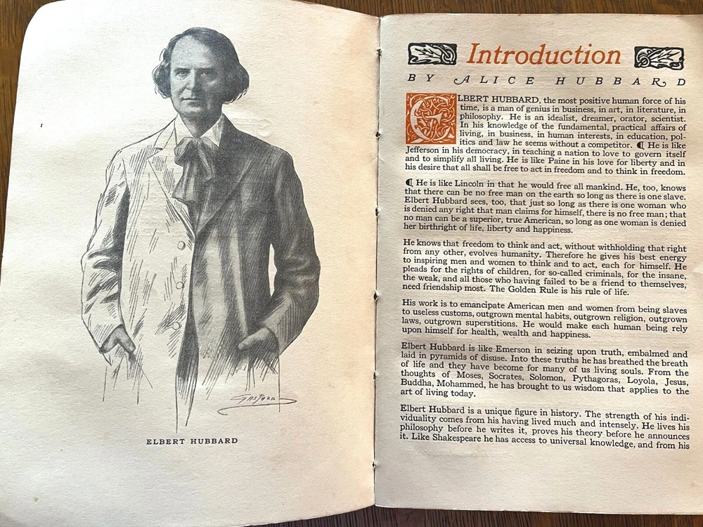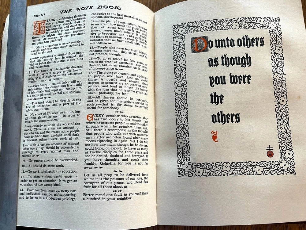 THE NOTE BOOK OF ELBERT HUBBARD The Note Book of Elbert Hubbard: Mottos, Epigrams, Short Essays, Passages, Orphic Sayings and Preachments Elbert Hubbard Written by Elbert Hubbard. 1927, first edition. Printed by The Roycrofters, East Aurora. William Wise & Co., Roycroft Distributors, New York City. Elbert Green Hubbard (1856 – 1915) was an important force in the American Arts and Crafts Movement, inspired by the work of William Morris, and in 1895 he founded the Roycroft artists' community in East Aurora, NY. The Note Book of Elbert Hubbard, collected posthumously by his second wife, is an excellent example of the Roycroft printmakers' craft, utilizing handmade papers and block printing. 17 x 24 x 2cm, 18oz, indexed, 214pp mb