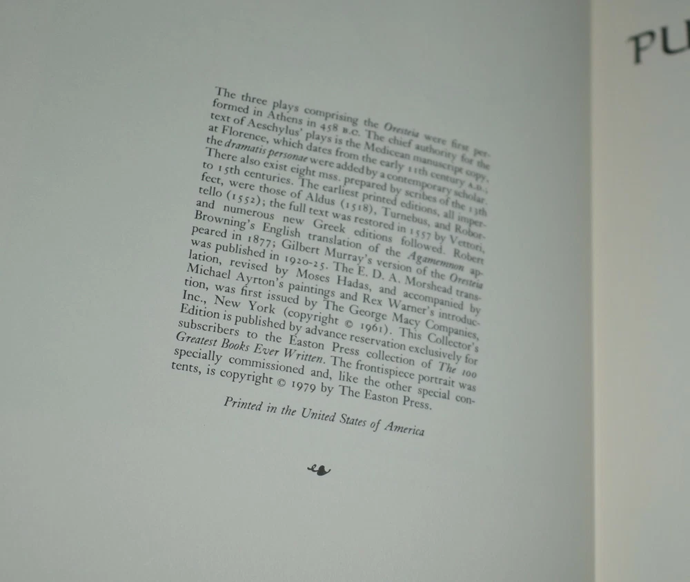 THE ORESTEIA Aeschylus Illustrated by Michael Ayrton Easton Press Leather Bound In great condition, bought then placed on my bookshelf for decades. Please see my many photos. Check out my many other listings, many more Easton Press books coming.