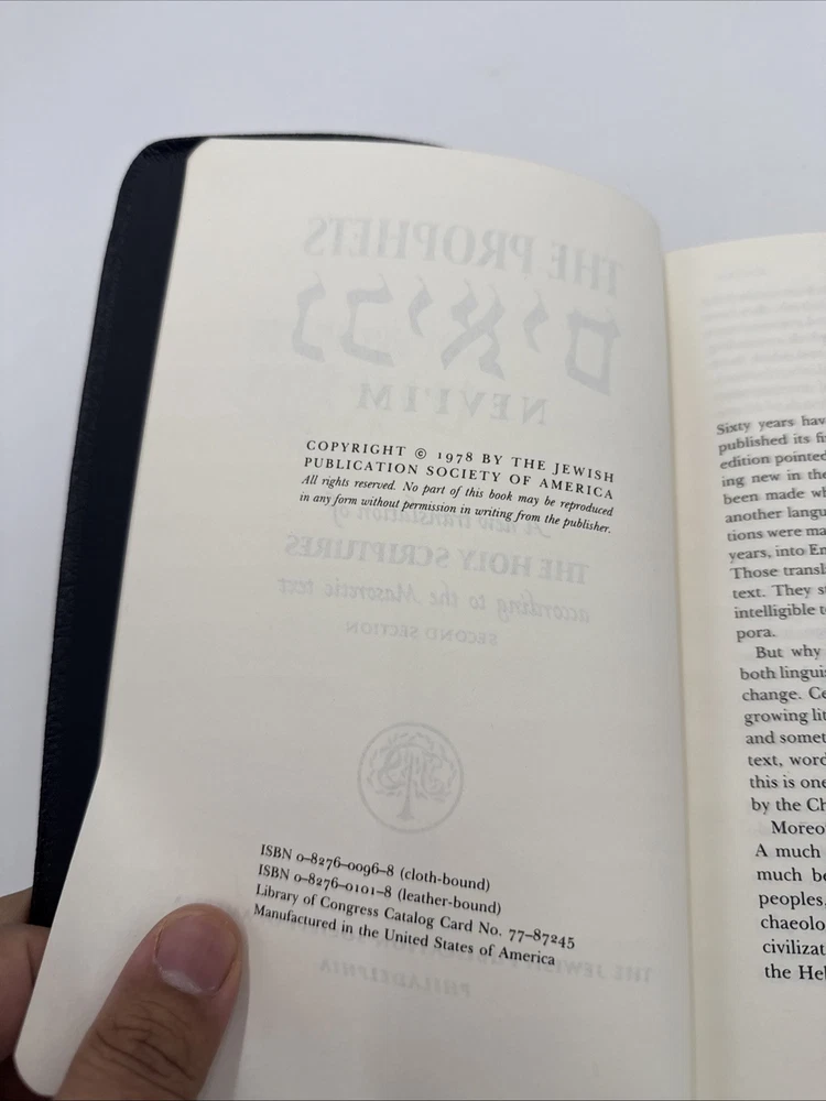 This leather-bound edition of THE PROPHETS - NEVI'IM is a beautiful find! The Masoretic translation is clear and the condition is impressive for its age—just minor wear. The photos accurately show its quality. A must-have for scripture study or collectors. Very satisfied!