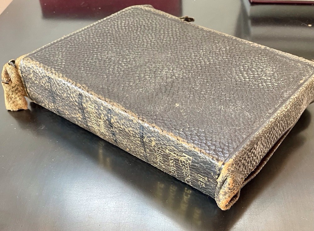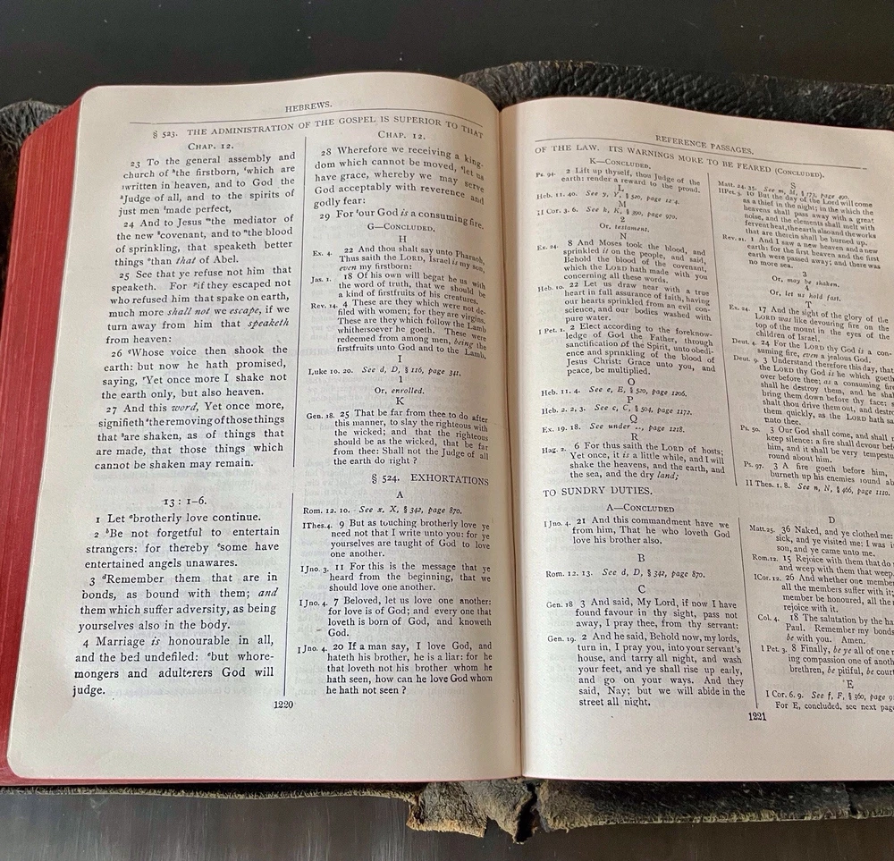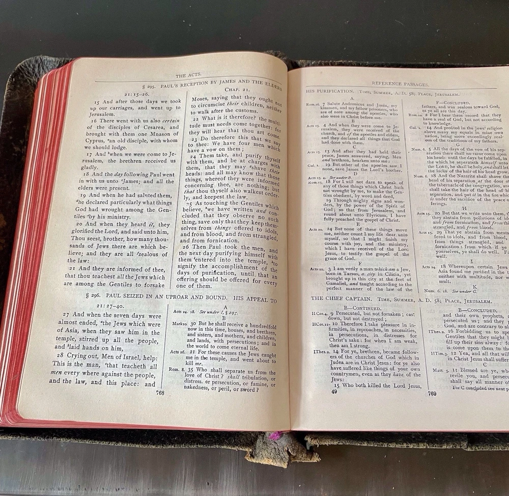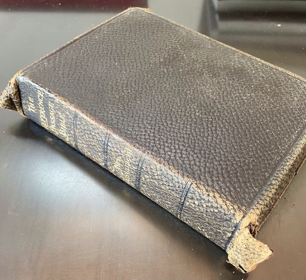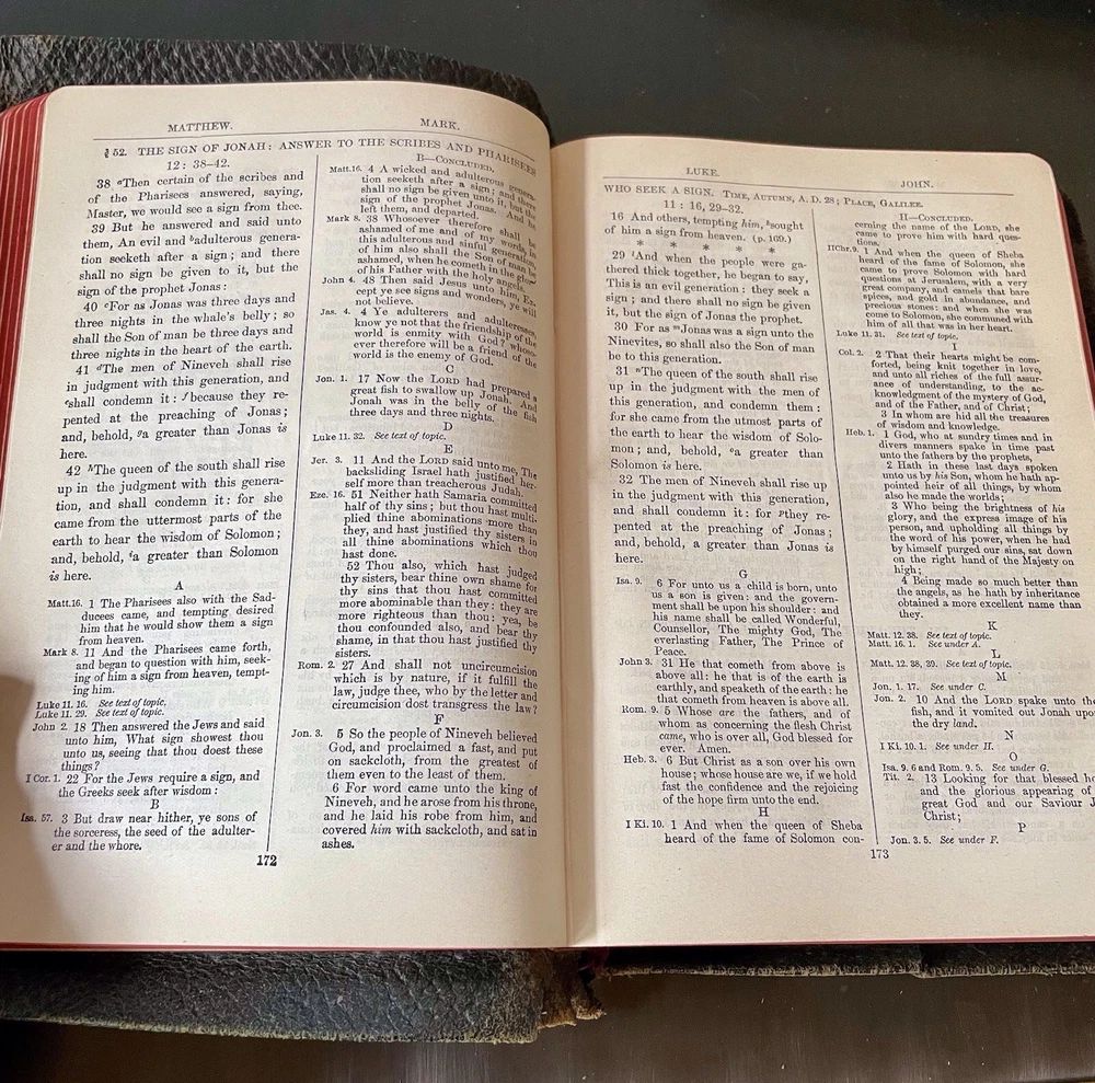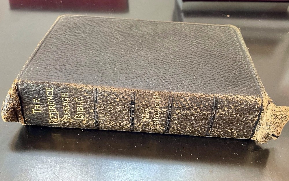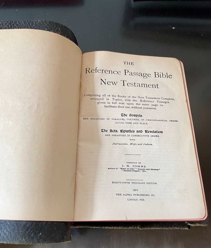 This is a great old Bible in good condition. The oversized leather cover is a bit ragged at the corners, but the binding id good. This unique Bible comprises the New Testament, with the four gospels written in parallel columns, moving through the stories together in chronological order. From Acts on, cross referenced verses are written along side the text, making study, and ministry easier and more fun. This bible was printed in 1912, and has been lovingly used. It still has some life left in it for anyone wishing to expand their study of the New Testament. It would also make a wonderful addition to a collection of antique books, or your Bible collection.