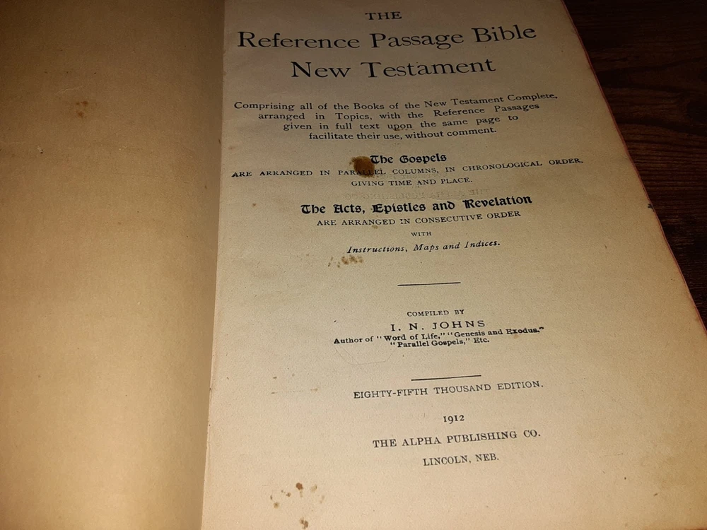 THE REFERENCE PASSAGE BIBLE - NEW TESTAMENT 1912 Leather Alpha Publishing. ships priority see photos for condition as bible is antique and has lots of wear...and some tape. also see stickers of previous owner