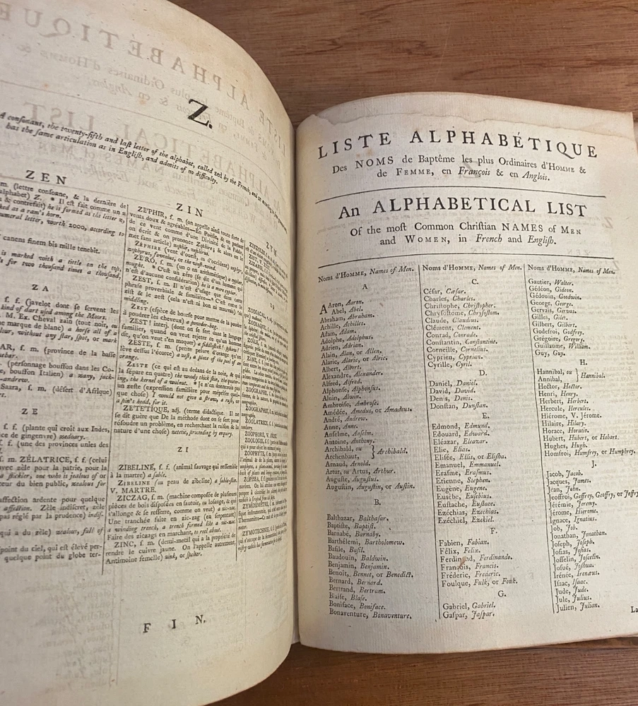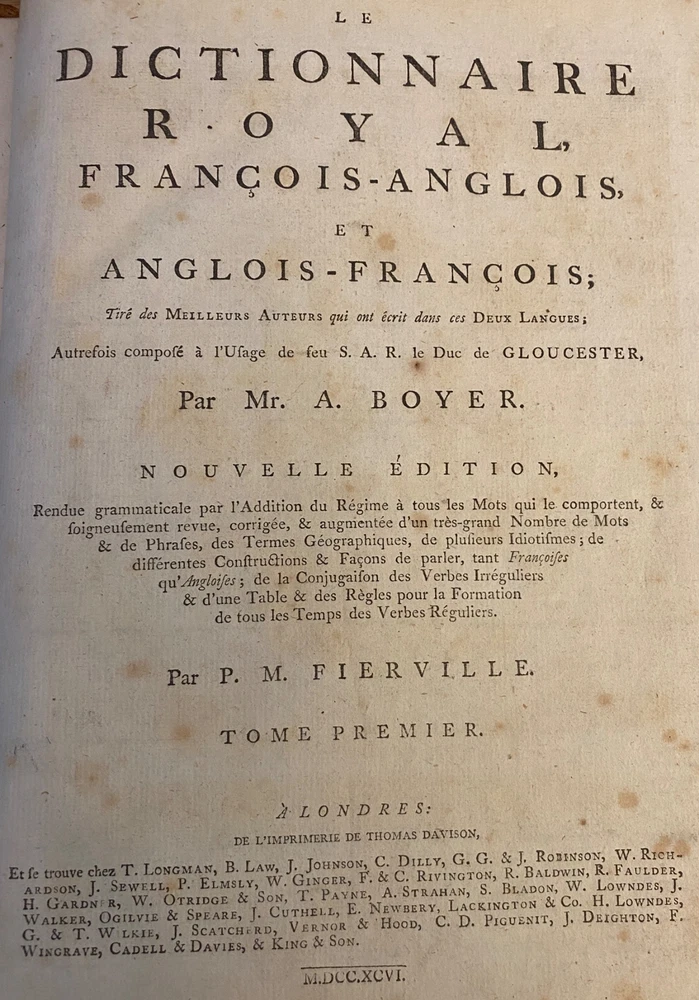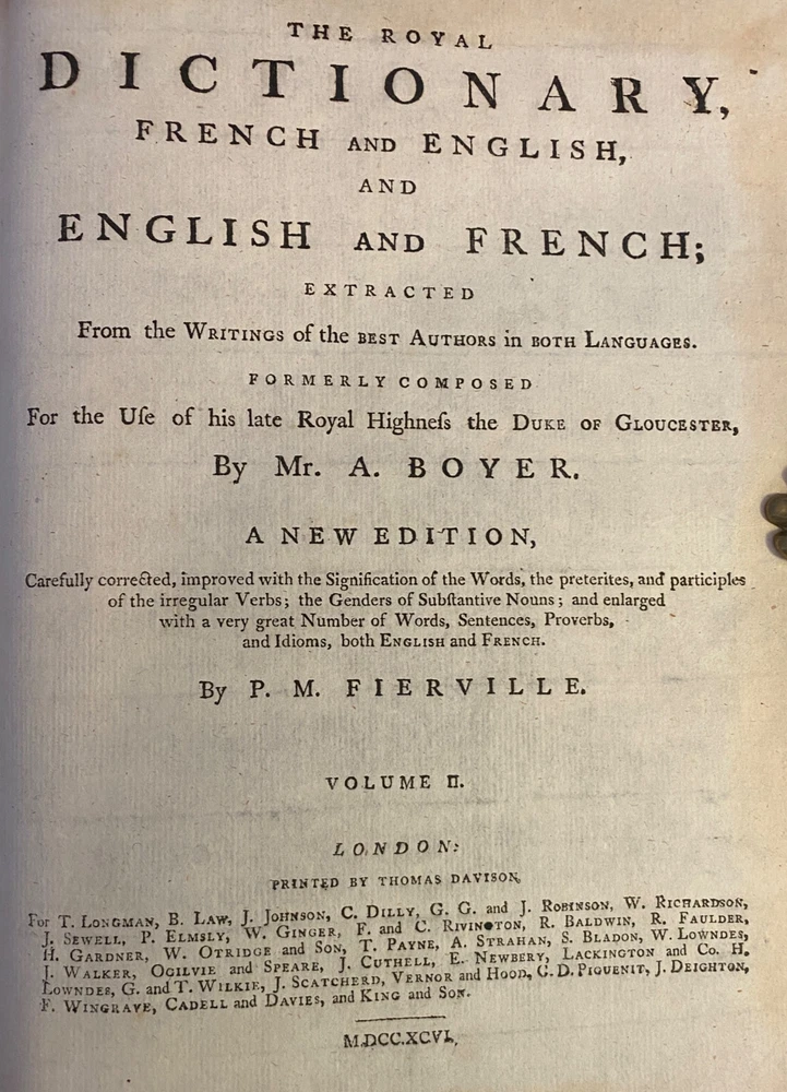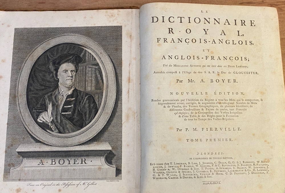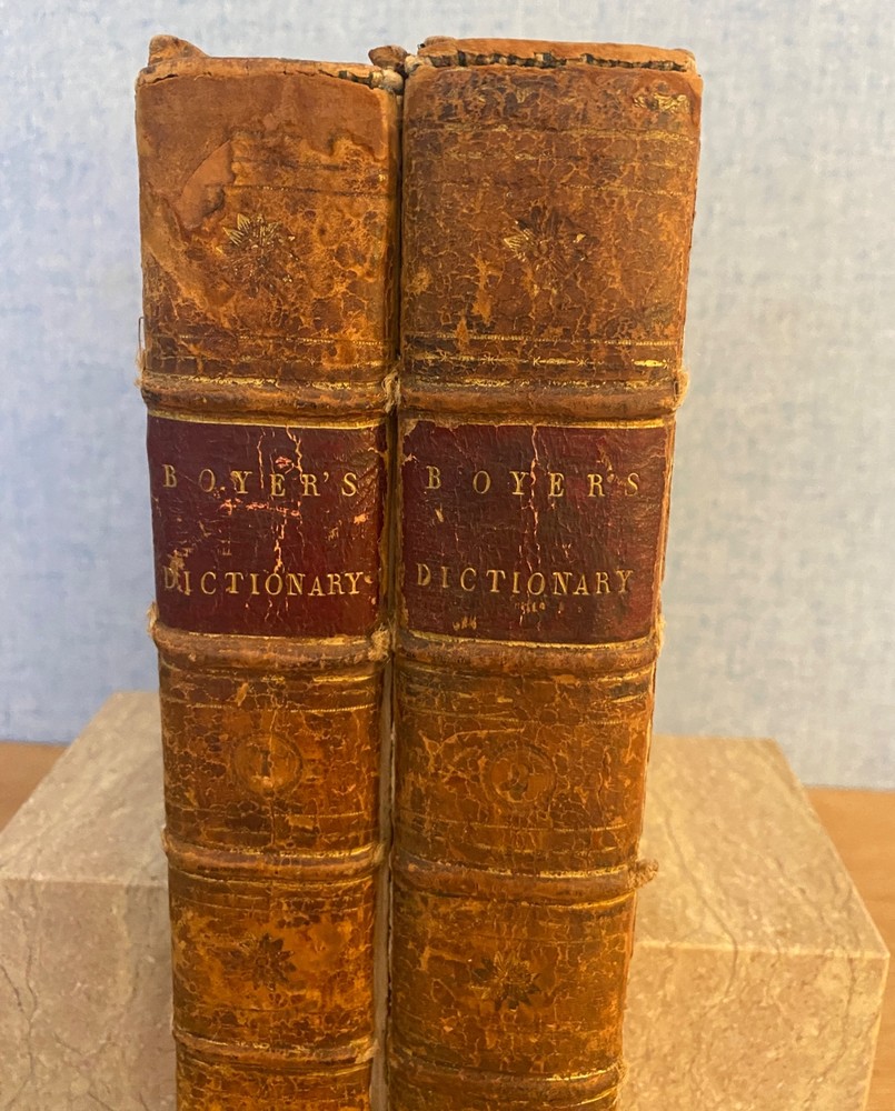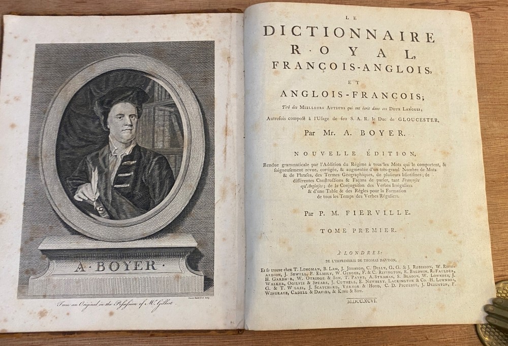 THE ROYAL DICTIONARY French-English & English-French by Abel Boyer 1796 New Ed. THE ROYAL DICTIONARY French-English & English-French by Abel Boyer 1796 New Ed. POB#45402 TITLE: Le dictionnaire royal, françois-anglois, et anglois-françois : tiré des meilleurs auteurs, qui ont écrit dans ces deux langues The Royal Dictionary, French and English and English and French [2 vol.] AUTHOR: Abel Boyer; P M Fierville PUBLISHER: London: De l'imprimerie de Thomas Davison : Et se trouve chez T. Longman, B. Law, J. Johnson, C. Dilly, G.G. & J. Robinson, W. Richardson ... [and 26 others], DATE: M. DCC. XCVI. [1796] EDITION: Nouvelle édition DESCRIPTION: 2 volumes. Unpaginated quartos [Vol.1 308 leaves, Vol.2 332 leaves], 29cm . Volume 1) French to English; Volume 2) English to French. . Both volumes include the same preliminary articles and charts - 1) French language preliminaries in volume 1 and 2) English language preliminaries in volume 2. . One preliminary chart: "Liste alphabétique des noms de Baptême les plus ordinaires d'homme & de femme, en françois & en anglois" is an list of informal nicknames and their translations. Foldout charts of conjugations are tipped into both volumes. . COLLATION: Gathered in 4's with first two signed, except for end pages in Volume 1 (in 2s). Vol 1 pi2-a-d4,A-3Y4, 3Z2 [308 leaves] Vol 2 pi-A-4K4 [332 leaves], . Engraved portrait of author opposite t.p. Abel Boyer (1667?-1729) was a French-English lexicographer, journalist, theater producer and historian. His French-English Royal Dictionary met with obvious success with dozens, if not hundreds, of editions appearing in the BnF catalog. This edition was published nearly 100 years after the first one. CONDITION NOTES: ACCEPTABLE Complete, but front covers detached and back joints weak. BINDING: Full period calf. . Engraved portrait of author opposite title page, Volume 1. Abel Boyer (1667?-1729) was a French-English lexicographer, journalist, theater producer and historian. His French-English Royal Dictionary met with obvious success with dozens, if not hundreds, of editions appearing in the BnF catalog. The present edition, edited by P. M. Fierville was published nearly 100 years after the first edition of Boyer's Dictionary. Listing and template services provided by inkFrog