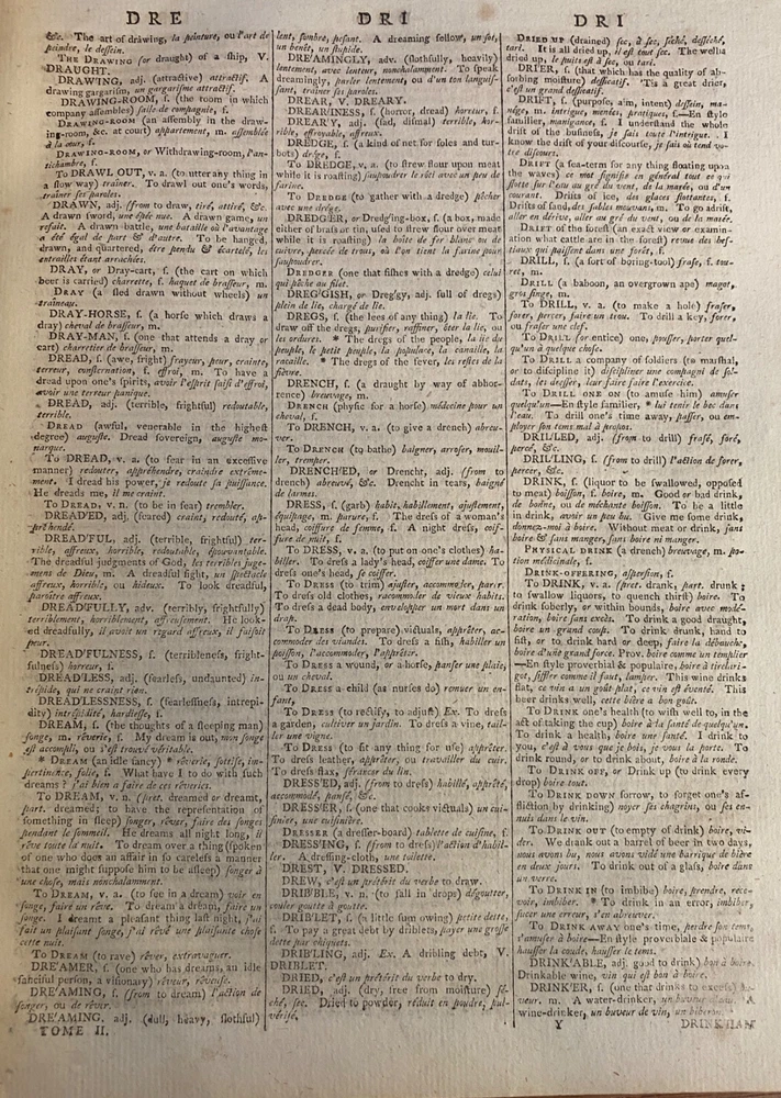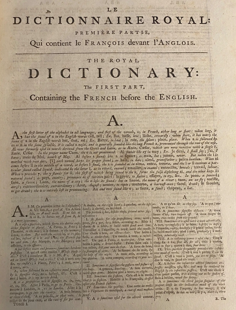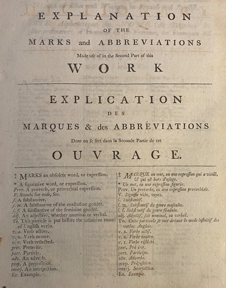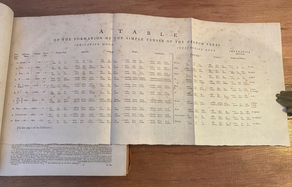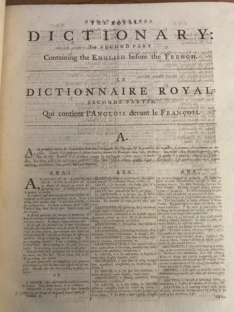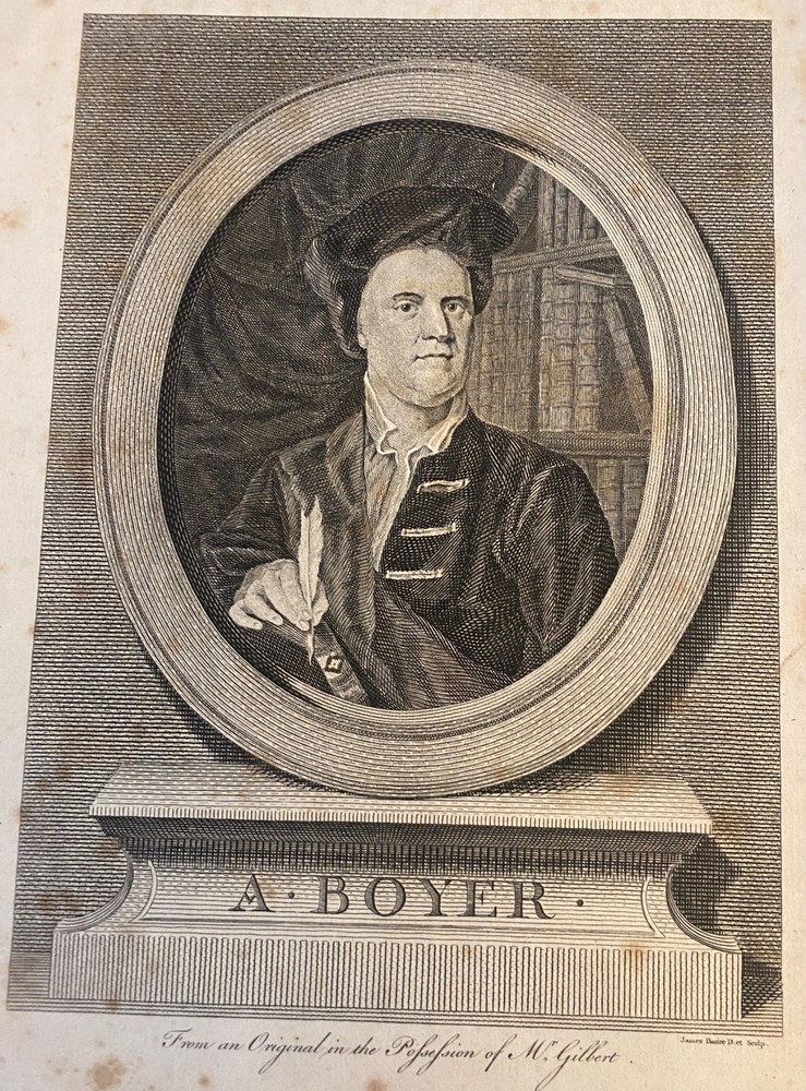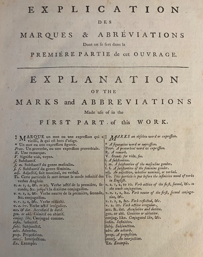 THE ROYAL DICTIONARY French-English & English-French by Abel Boyer 1796 New Ed. THE ROYAL DICTIONARY French-English & English-French by Abel Boyer 1796 New Ed. POB#45402 TITLE: Le dictionnaire royal, françois-anglois, et anglois-françois : tiré des meilleurs auteurs, qui ont écrit dans ces deux langues The Royal Dictionary, French and English and English and French [2 vol.] AUTHOR: Abel Boyer; P M Fierville PUBLISHER: London: De l'imprimerie de Thomas Davison : Et se trouve chez T. Longman, B. Law, J. Johnson, C. Dilly, G.G. & J. Robinson, W. Richardson ... [and 26 others], DATE: M. DCC. XCVI. [1796] EDITION: Nouvelle édition DESCRIPTION: 2 volumes. Unpaginated quartos [Vol.1 308 leaves, Vol.2 332 leaves], 29cm . Volume 1) French to English; Volume 2) English to French. . Both volumes include the same preliminary articles and charts - 1) French language preliminaries in volume 1 and 2) English language preliminaries in volume 2. . One preliminary chart: "Liste alphabétique des noms de Baptême les plus ordinaires d'homme & de femme, en françois & en anglois" is an list of informal nicknames and their translations. Foldout charts of conjugations are tipped into both volumes. . COLLATION: Gathered in 4's with first two signed, except for end pages in Volume 1 (in 2s). Vol 1 pi2-a-d4,A-3Y4, 3Z2 [308 leaves] Vol 2 pi-A-4K4 [332 leaves], . Engraved portrait of author opposite t.p. Abel Boyer (1667?-1729) was a French-English lexicographer, journalist, theater producer and historian. His French-English Royal Dictionary met with obvious success with dozens, if not hundreds, of editions appearing in the BnF catalog. This edition was published nearly 100 years after the first one. CONDITION NOTES: ACCEPTABLE Complete, but front covers detached and back joints weak. BINDING: Full period calf. . Engraved portrait of author opposite title page, Volume 1. Abel Boyer (1667?-1729) was a French-English lexicographer, journalist, theater producer and historian. His French-English Royal Dictionary met with obvious success with dozens, if not hundreds, of editions appearing in the BnF catalog. The present edition, edited by P. M. Fierville was published nearly 100 years after the first edition of Boyer's Dictionary. Listing and template services provided by inkFrog
