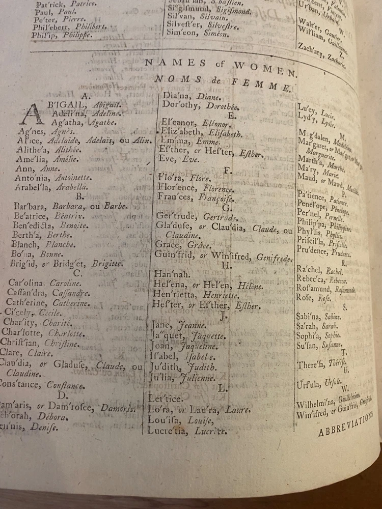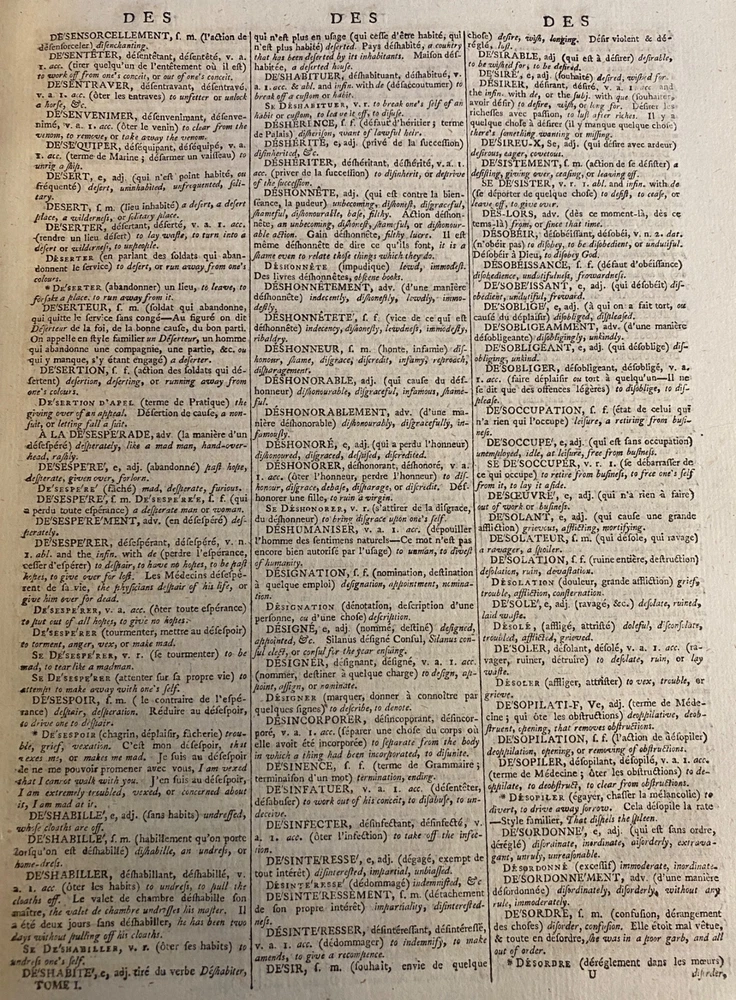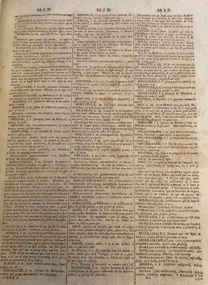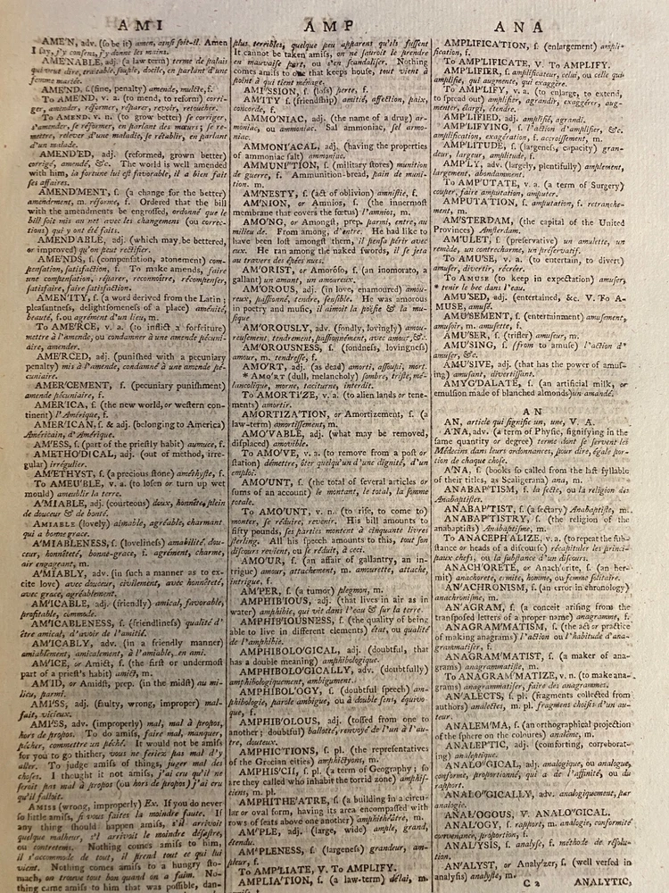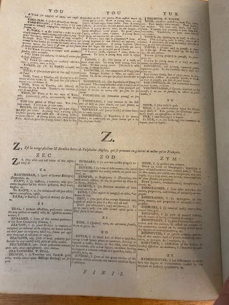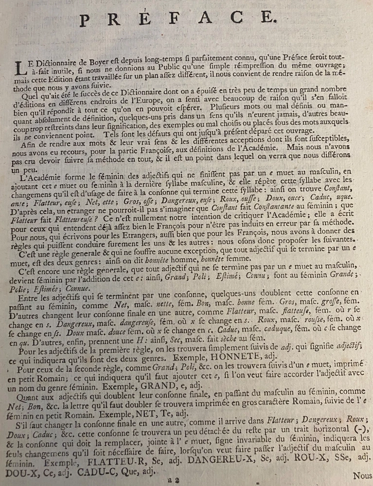 THE ROYAL DICTIONARY French-English & English-French by Abel Boyer 1796 New Ed. THE ROYAL DICTIONARY French-English & English-French by Abel Boyer 1796 New Ed. POB#45402 TITLE: Le dictionnaire royal, françois-anglois, et anglois-françois : tiré des meilleurs auteurs, qui ont écrit dans ces deux langues The Royal Dictionary, French and English and English and French [2 vol.] AUTHOR: Abel Boyer; P M Fierville PUBLISHER: London: De l'imprimerie de Thomas Davison : Et se trouve chez T. Longman, B. Law, J. Johnson, C. Dilly, G.G. & J. Robinson, W. Richardson ... [and 26 others], DATE: M. DCC. XCVI. [1796] EDITION: Nouvelle édition DESCRIPTION: 2 volumes. Unpaginated quartos [Vol.1 308 leaves, Vol.2 332 leaves], 29cm . Volume 1) French to English; Volume 2) English to French. . Both volumes include the same preliminary articles and charts - 1) French language preliminaries in volume 1 and 2) English language preliminaries in volume 2. . One preliminary chart: "Liste alphabétique des noms de Baptême les plus ordinaires d'homme & de femme, en françois & en anglois" is an list of informal nicknames and their translations. Foldout charts of conjugations are tipped into both volumes. . COLLATION: Gathered in 4's with first two signed, except for end pages in Volume 1 (in 2s). Vol 1 pi2-a-d4,A-3Y4, 3Z2 [308 leaves] Vol 2 pi-A-4K4 [332 leaves], . Engraved portrait of author opposite t.p. Abel Boyer (1667?-1729) was a French-English lexicographer, journalist, theater producer and historian. His French-English Royal Dictionary met with obvious success with dozens, if not hundreds, of editions appearing in the BnF catalog. This edition was published nearly 100 years after the first one. CONDITION NOTES: ACCEPTABLE Complete, but front covers detached and back joints weak. BINDING: Full period calf. . Engraved portrait of author opposite title page, Volume 1. Abel Boyer (1667?-1729) was a French-English lexicographer, journalist, theater producer and historian. His French-English Royal Dictionary met with obvious success with dozens, if not hundreds, of editions appearing in the BnF catalog. The present edition, edited by P. M. Fierville was published nearly 100 years after the first edition of Boyer's Dictionary. Listing and template services provided by inkFrog