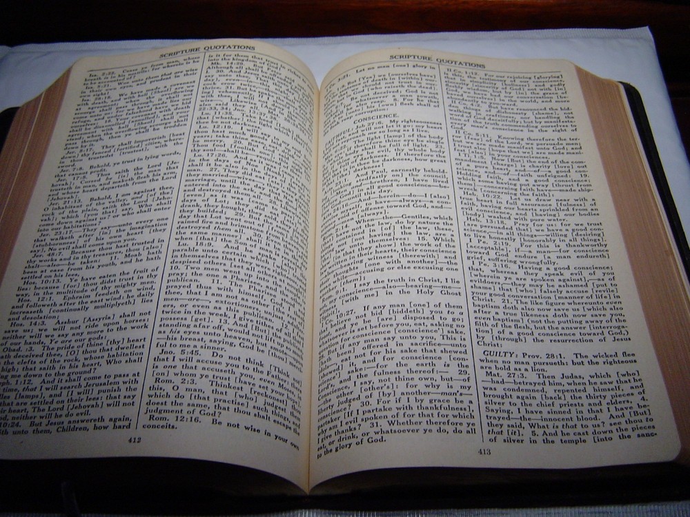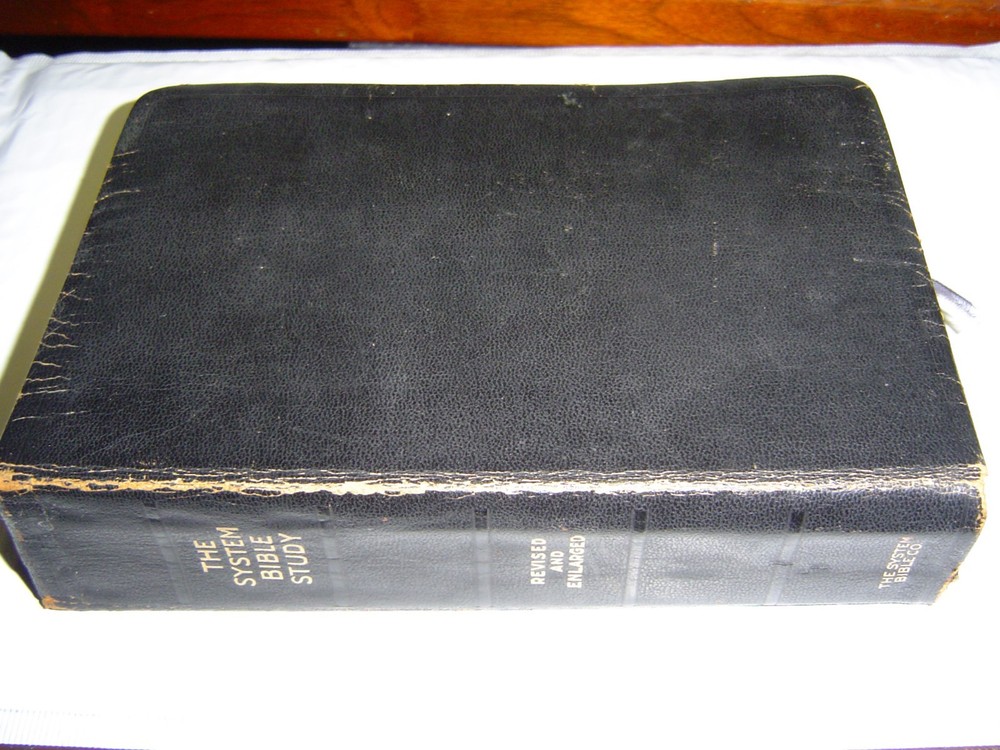 1952 REVISED AND ENLARGED BLACK LEATHER BOUND FROM THE SYSTEM BIBLE COMPANY RIBBON MARKER THERE ARE A FEW MARKINGS IN BOOK WELL BOUND VERY USABLE COPY 6" X 9" 786 PAGES 41 OZ