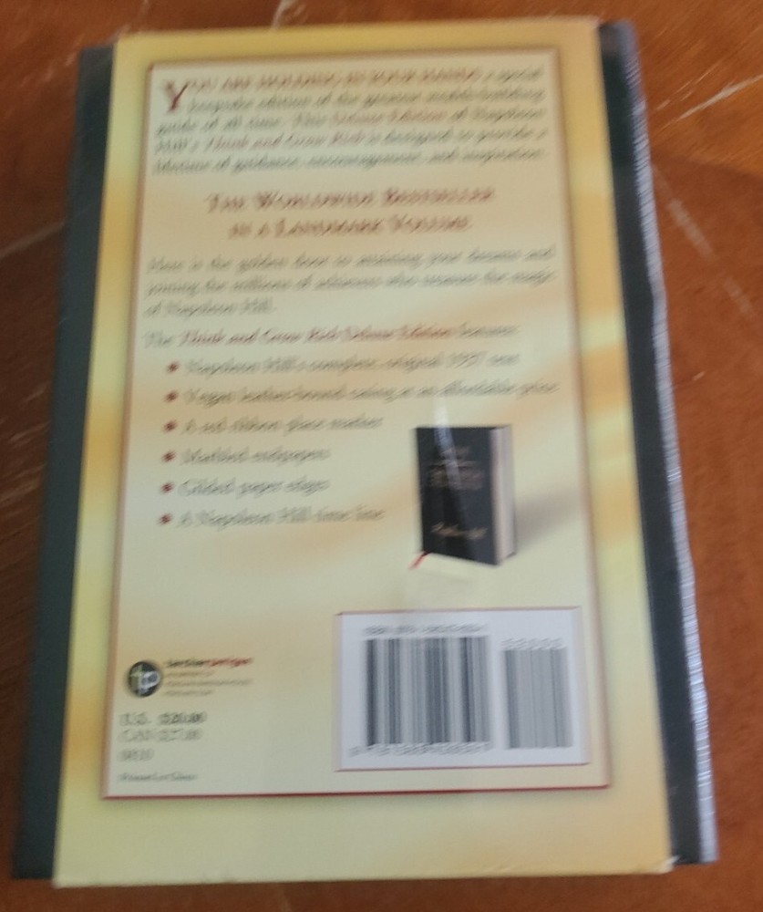 Will ship as soon as possible. This is a vegan leather bound deluxe edition of the classic text, "Think and Grow Rich" by Napoleon Hill. The book measures 7.5 inches in length, 5.3 inches in width, and 1.4 inches in height, with a weight of 20.5 ounces and a total of 400 pages. It was published by Penguin Publishing Group in 2008, and the language of the book is English. The book's genre includes self-help, biography & autobiography, body, mind & spirit, and business & economics, with topics covering personal success, personal growth, general, and business. The book features a timeless text that has helped many readers achieve their goals.