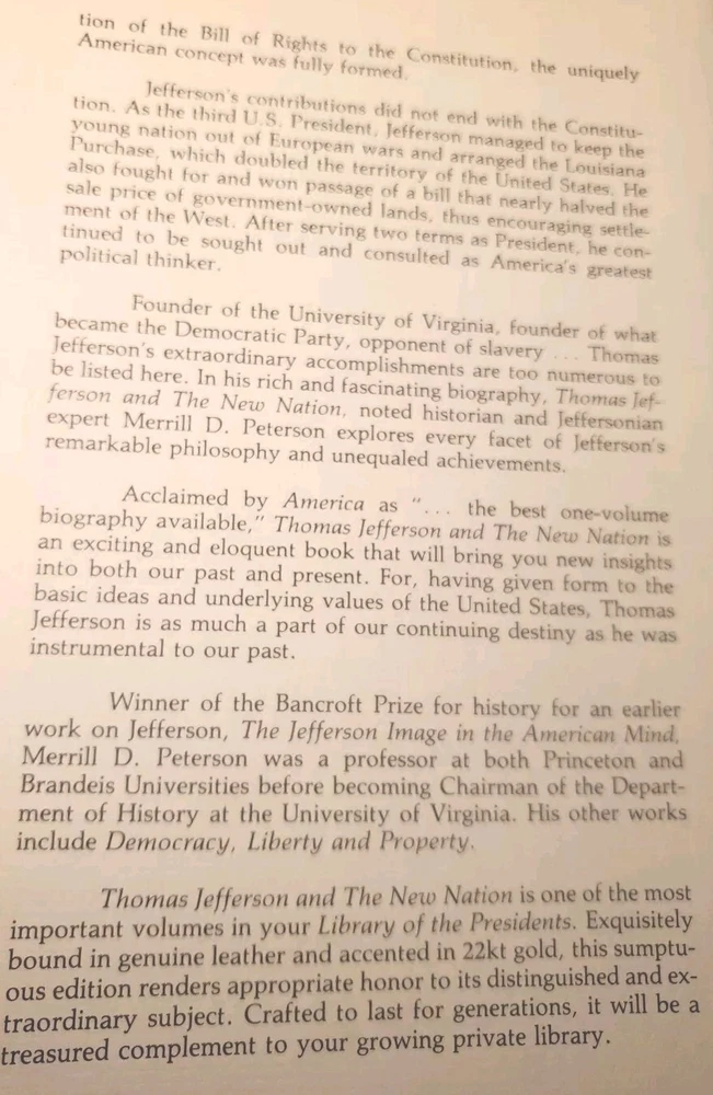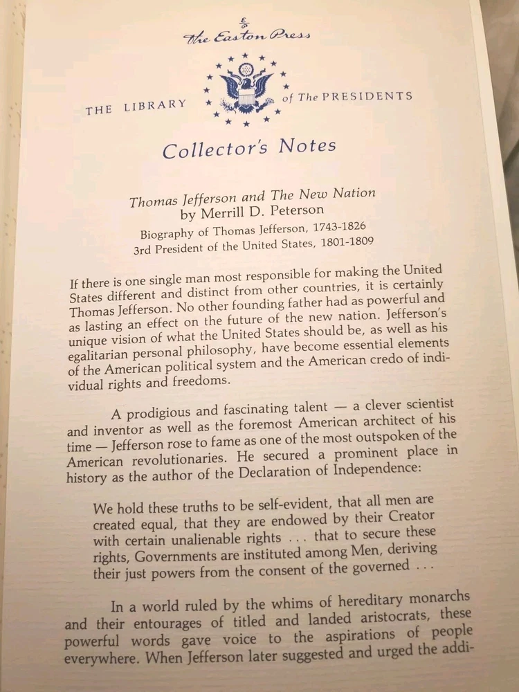 This Easton Press leather-bound edition is a stunning collector's piece! The craftsmanship is impeccable, with rich leather and elegant gold detailing. The content offers a deep dive into Jefferson's life and his impact on America, making it a must-have for history enthusiasts. The quality and presentation make it feel like a timeless treasure—perfect for any serious book collector or history buff. Absolutely worth adding to your library!