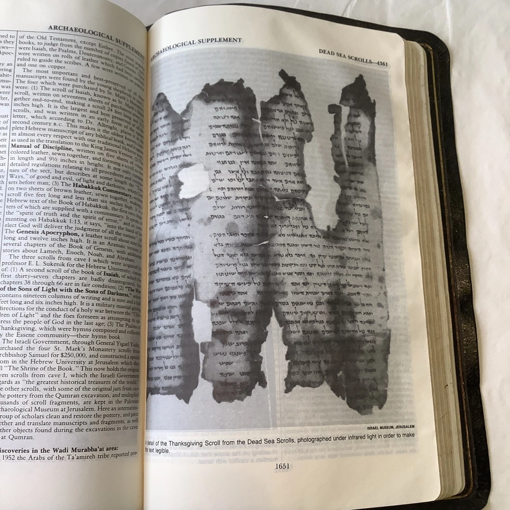 It has some writing inside and shows some age and wear. It’s still a nice Bible. It has a picture of the Dead Sea scrolls in the back.