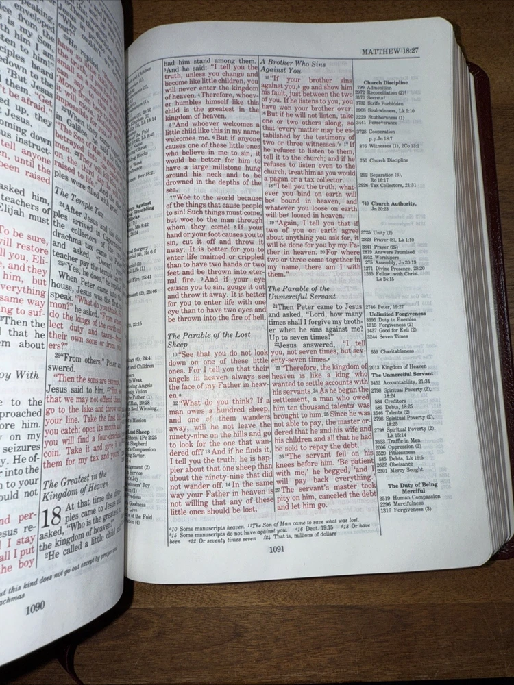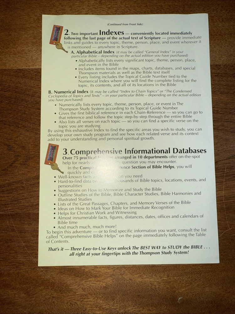 The Bible was as described and in very good condition, with no tears or markings inside. It was an amazing price compared to other Sellers and new copies. The Seller was very quick to respond to my question. It was package fairly well in a bubble wrap envelope that was taped down all the way around it, without a box, which made me a bit nervous but everything was great once opened. I would buy from this Seller again.