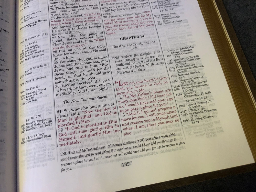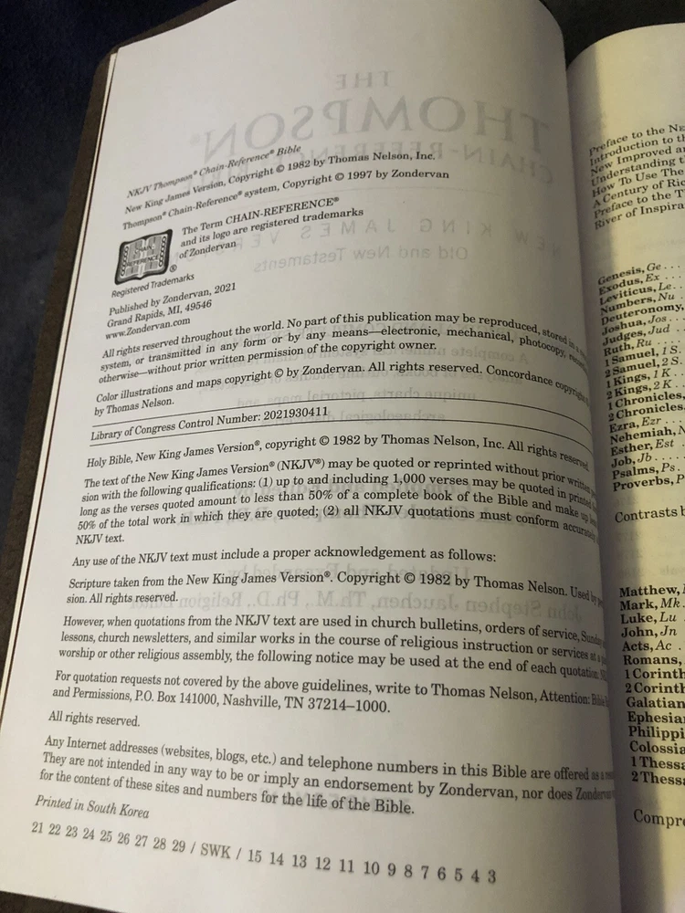 NKJV NEW KING JAMES VERSION thompson chain reference bible Cowhide Leather. Shipped with USPS Media Mail. Comes with genuine cowhide leather, the thickness of leather is 4 oz. the leather is very durable, ribs on spine for elegant look, 2 ribbons, this Bible has no markings or highlights whatsoever, plz examine pics carefully before purchasing and feel free to ask any questions, I do my best to respond quickly and also be sure to check out the other bibles that I have for sale, and if you want a certain Bible rebound let me know I can do that too, God bless.