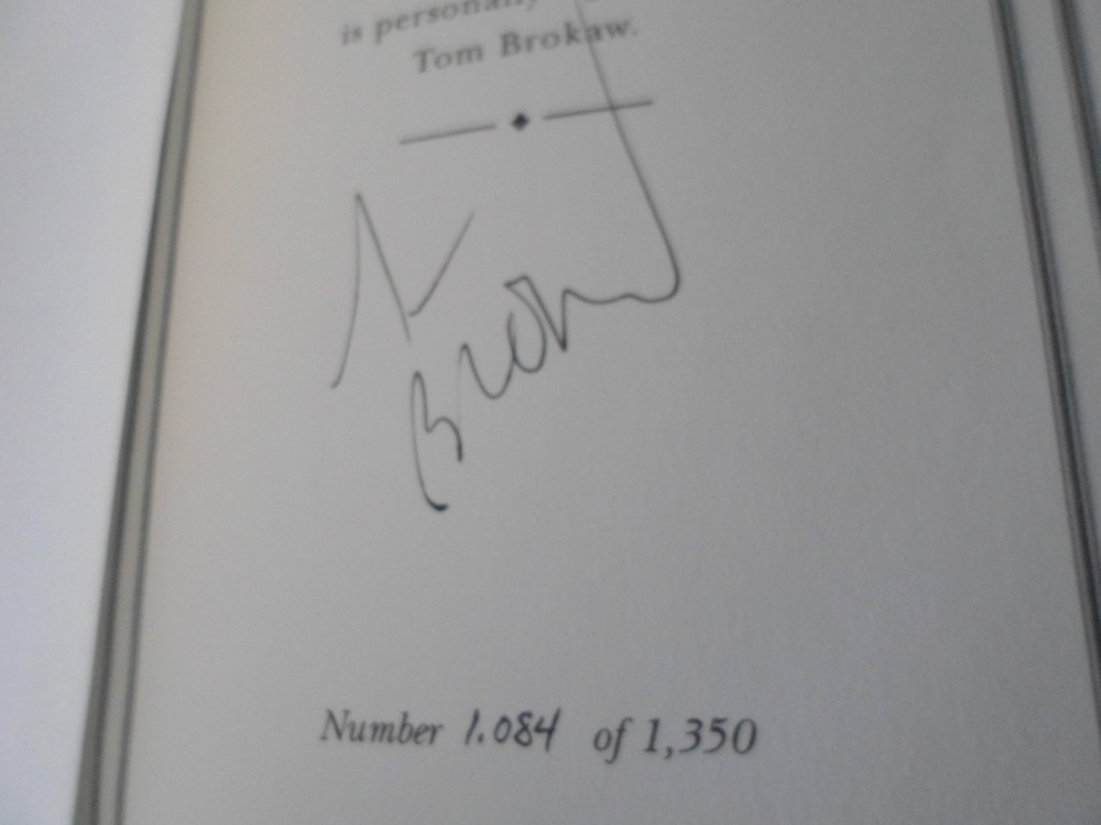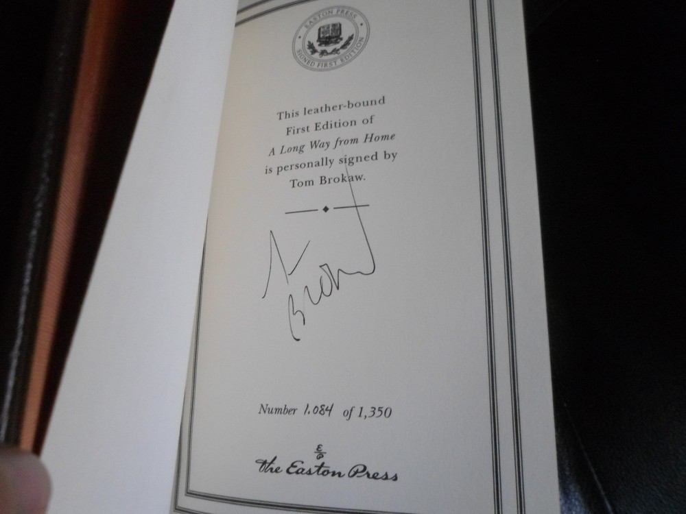 This is a leather bound signed first edition of Tom Brokaw's best selling memoir - "A Long Way From Home: Growing Up In The American Heartland" . In this beautiful memoir, Tom Brokaw writes of America and of the American experience. From his parents’ life in theThirties, on to his boyhood along the Missouri River and on the prairies of South Dakota in the Forties, into his early journalism career in the Fifties and the tumultuous Sixties, up to the present, this personal story is a reflection on America in our time. Tom Brokaw writes about growing up and coming of age in the heartland, and of the family, the people, the culture and the values that shaped him then and still do today. His father, Red Brokaw, a genius with machines, followed the instincts of Tom's mother Jean, and took the risk of moving his small family from an Army base to Pickstown, South Dakota, where Red got a job as a heavy equipment operator in the Army Corps of Engineers' project building the Ft. Randall dam along the Missouri River. Tom Brokaw describes how this move became the pivotal decision in their lives, as the Brokaw family, along with others after World War II, began to live out the American Dream: community, relative prosperity, middle class pleasures and good educations for their children. "Along the river and in the surrounding hills, I had a Tom Sawyer boyhood," Brokaw writes; and as he describes his own pilgrimage as it unfolded–from childhood to love, marriage, the early days in broadcast journalism, and beyond–he also reflects on what brought him and so many Americans of his generation to lead lives a long way from home, yet forever affected by it. The book is unread and in great condition, with just few slight scratches of the gold gild (see pictures). Signed by the author on the limitation page, this is copy number 1084 of only 1350 ever printed. It also has the signed and dated certificate of authenticity and the publisher's note card. Easton Press books are the golden standard in the publishing industry, highly collectible and lasting generations. Easton Press Full Genuine Leather Dubbed Spine Accented Wit 22 kt. Real Gold Satin Ribbon Page Marker Distinctive Cover Design Gilded Page Edges To Protect Against Humidity High Quality Acid - Free paper Smyth-Sewn Pages Silk-Moire Endleaves I combine multiple items for savings on shipping charges. I ship worldwide. Please ask about international shipping charges and/or different shipping options.Thank you!