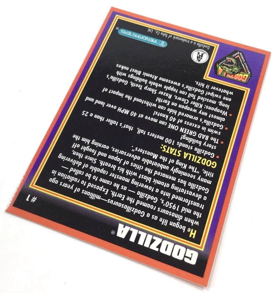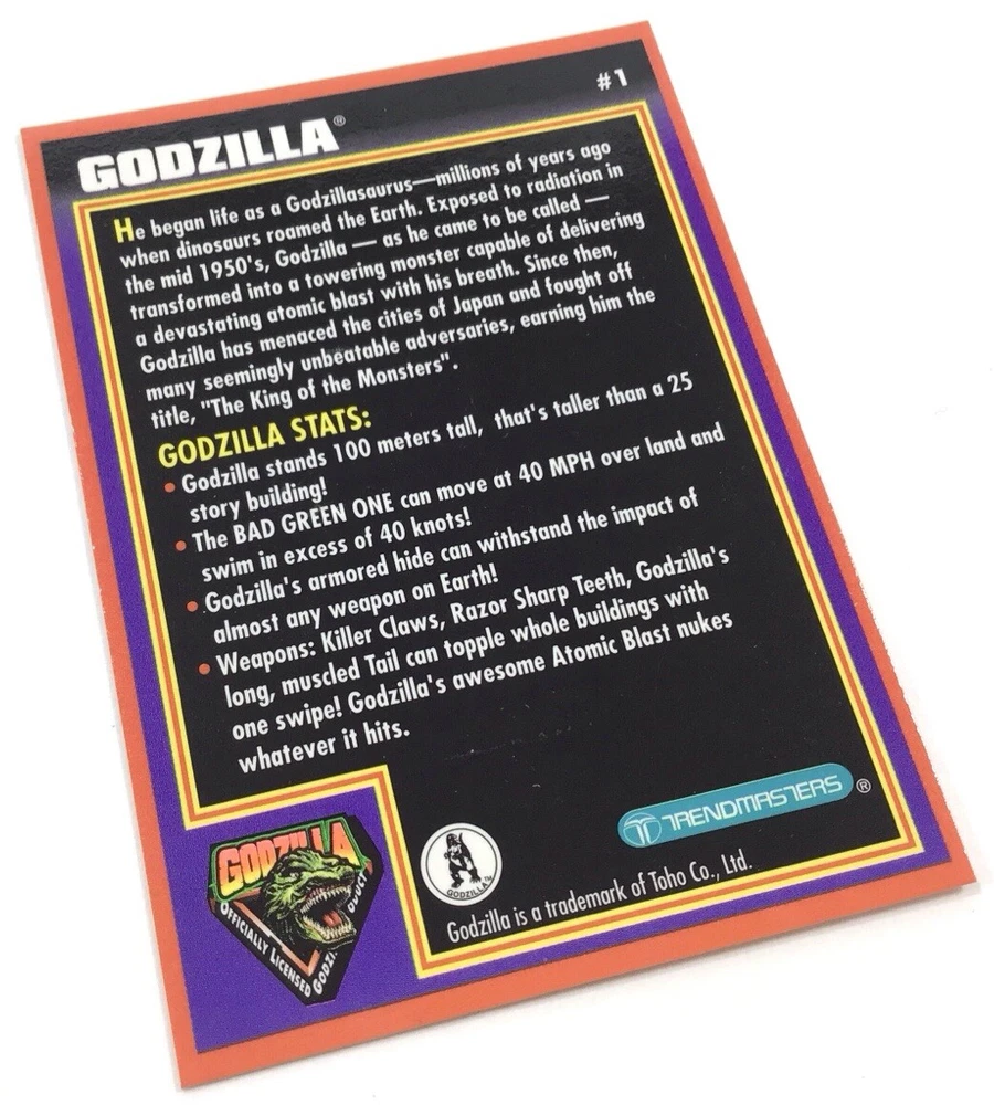 ITEM SPECIFICS AND CONDITION A Trendmasters action figure Godzilla trading card for your trading card collection. Minor wear ITEMS IN USED/PRE-OWNED CONDITION May have scuffs, blemishes, scratches, flaws, or imperfections. All items are described to the best of my ability. If you have a question please inquire before purchasing. Please look at all photos for condition. All cards have been stored and unused. Unless professionally graded, ungraded trading cards may still have small manufacturing scratches and imperfections not showing up in the photos. GENERAL BUYING INFORMATION All items that come from me are securely wrapped, packaged and treated with care. I use both new and/or clean recycled boxes. I can combine small and medium items to save on shipping. Large or heavy items can't be combined. Some items may be shipped with Signed Delivery Confirmation. I appreciate your business and strive to create a happy transaction for you. Thank you for viewing!