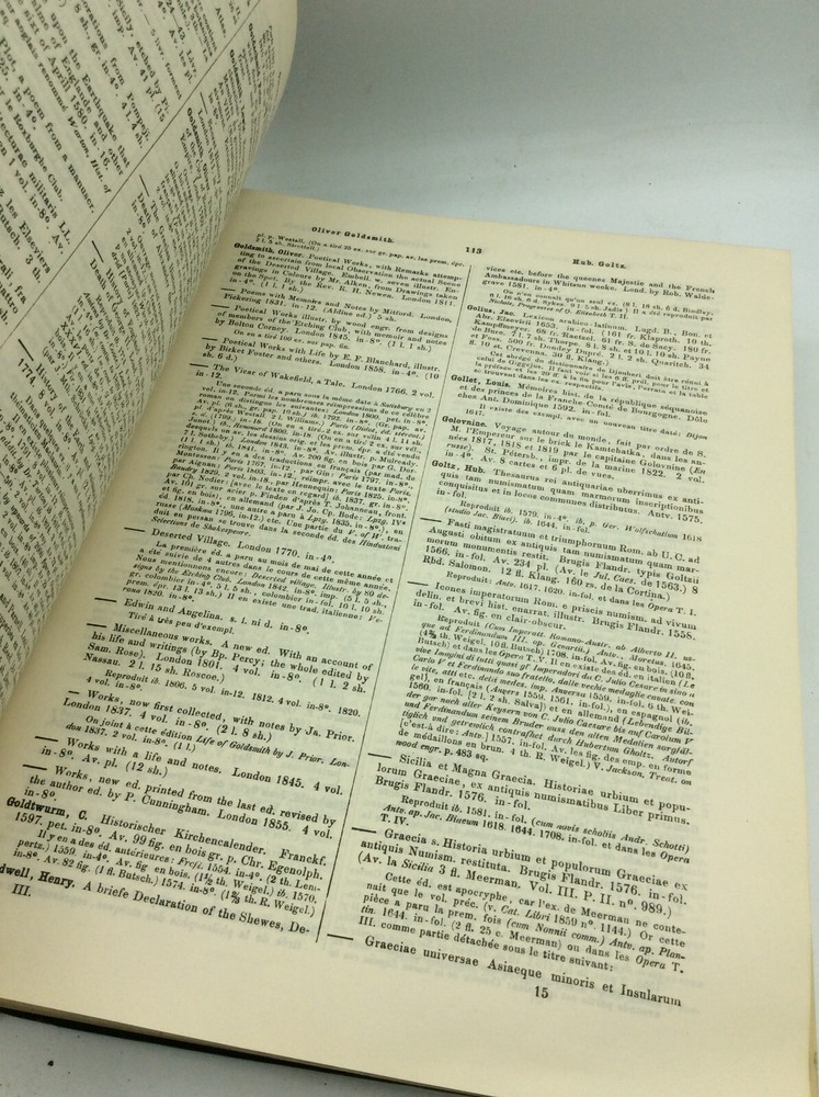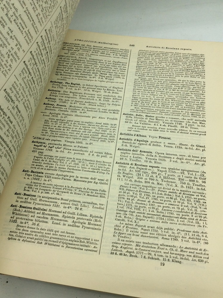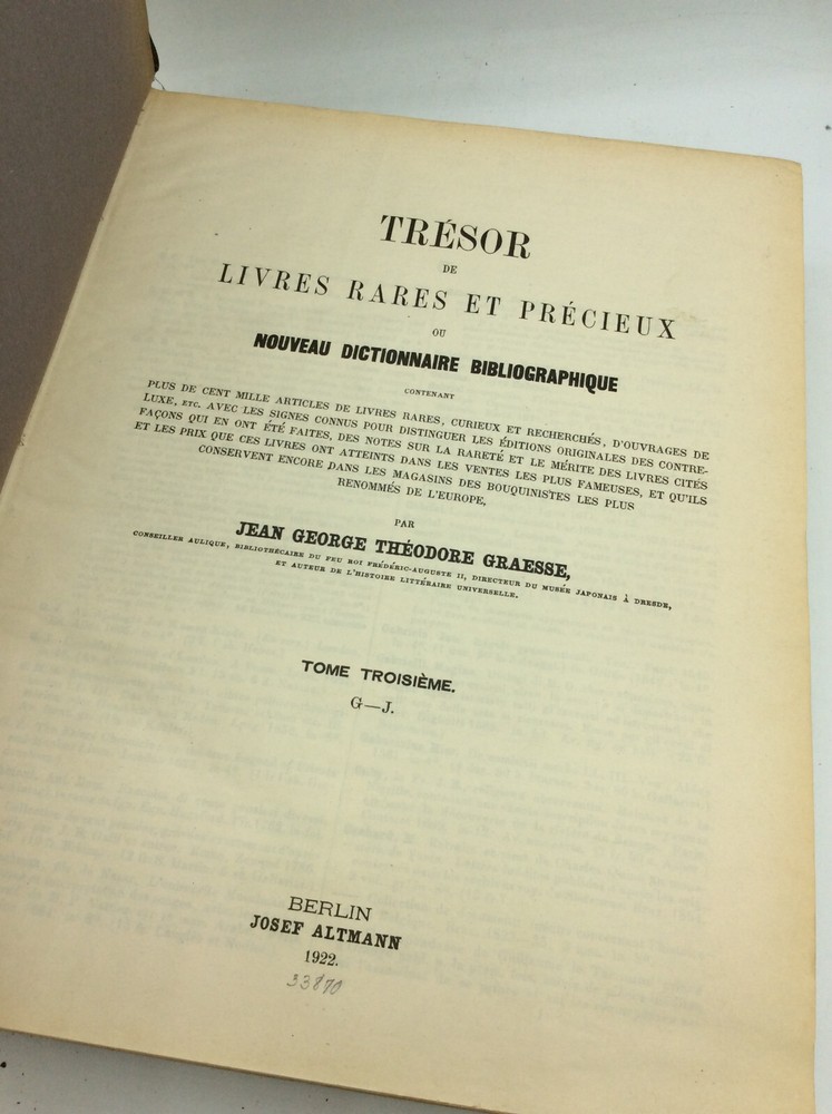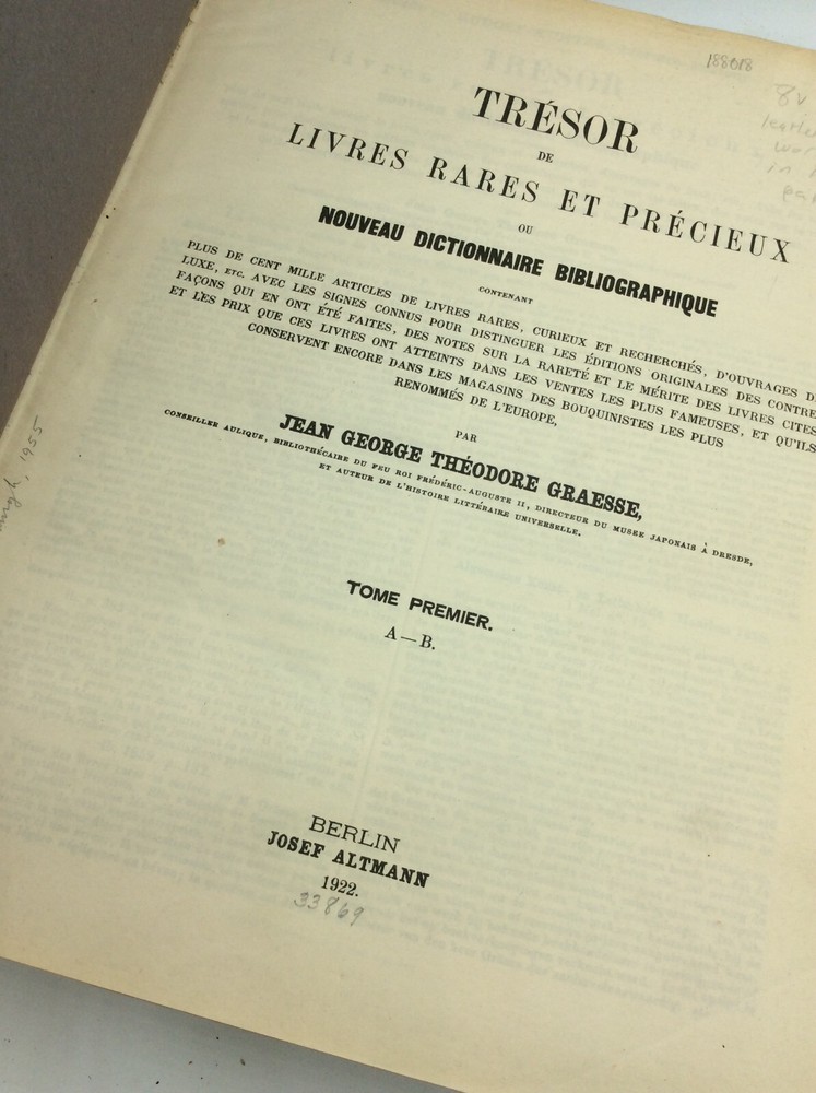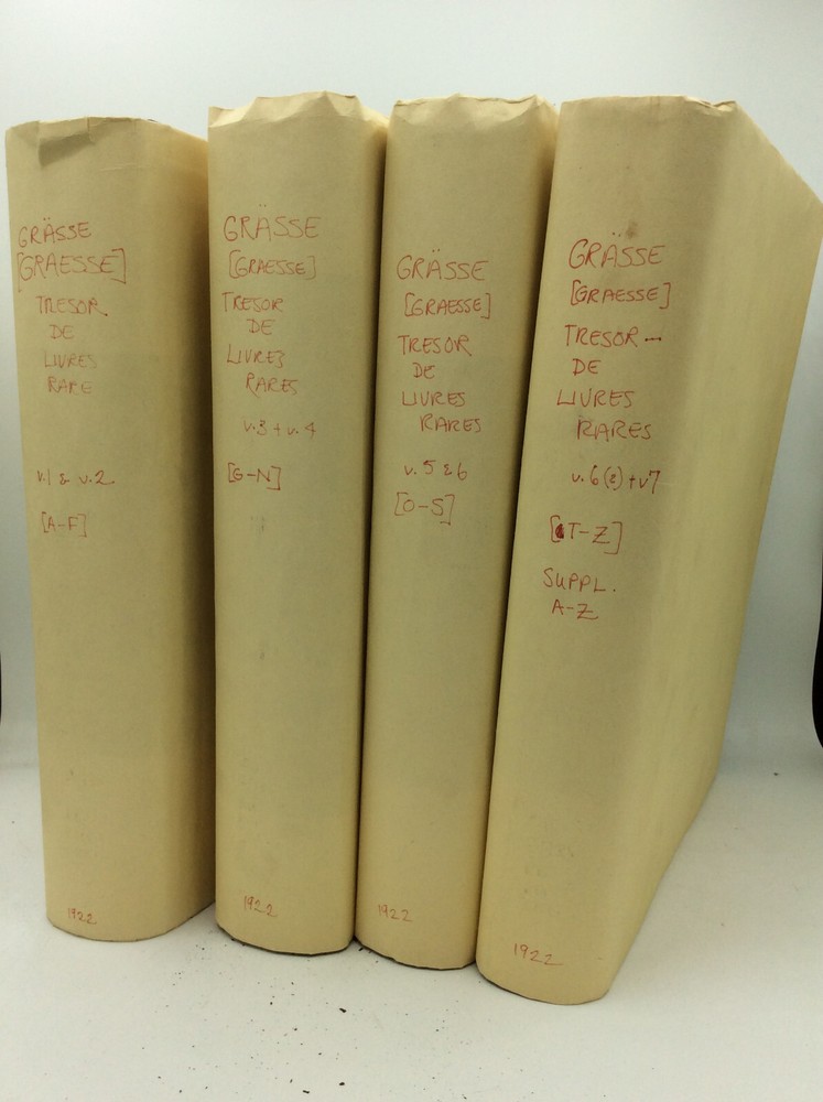 TRESOR DE LIVRES RARES ET PRECIEUX ou Nouveau Dictionnaire Bibliographique by Jean George Theodore Graesse Berlin: Josef Altmann, 1922. Leather. 8 vols in 4 books. Ex-library. A set of four large books with leather spines and black cloth boards. FAIR condition. The leather spines are cracking off; homemade paper dustjackets have been attached to each volume, helping to held the damaged bindings together and preventing further damage. Handwritten title on each jacket's spine. A few old library stamps and notations in each volume, but text itself is unmarked. Except for a few slightly loose pages in volume 2, the pages are tightly bound, despite the damaged covers. Suitable for reading and reference. Item #188018 Extensive bibliographical dictionary of rare books by a 19th-century German bibliographer. Eight volumes bound as four books, each measuring approx. 12.25" x 9.5". Includes 7 main volumes and supplement. Text is in French.