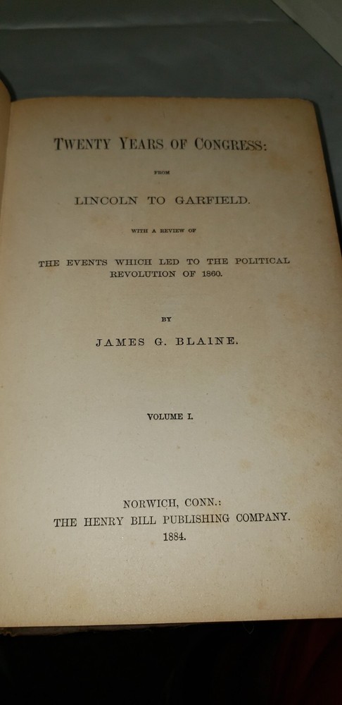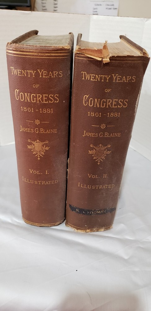 Written by James G. Blaine. Published by The Henry Bill Publishing Company, Norwich, Connecticut. Two Volumes. Volume 1 has an intact spine, but Volume 2 is weak.