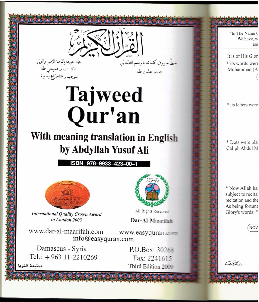 Tajweed Quran with Meaning Translation In English PLEASE NOT : TITLE COLOR OF QURAN DEPEND ON AVAILABILITY Description From Publisher This complete Colour Coded Tajweed Quran comes with a nice and beautiful hard cover, it includes Translations into English. Translation: meanings of the Quranic verses are translated into English and placed on the margins around the Arabic text. The idea behind the Color Coded Tajweed Holy Quran: Based on a practical understanding of phonology, we have color-coded the place of some letters to facilitate the correct recitation of the holy quran. This had enabled us to classify these letters within three possible categories to enhance the reader's knowledge and remembrance of Tajweed rules, they are: The letters which requires expanded vocalization: we used red color to highlight these letters . The letters which is nasalized: these letters are green in color . The dark blue color indicates the emphatic of the letter (R), the blue color indicates the unrest letters- echoing sound- (qualquala), while the letters which are written but are not pronounced are gray in color . The reader will very easily get used to reciting the quran by using colors just as he got used to stopping at red lights and passing though green lights. By engaging in this sublime act, the reader will find him/herself applying 24 rules of Tajweed with ease and precision while his/her mind is left free to contemplate and understand the meaning of Holy Quran. It is an honor for Dar Al-Maarifa to adopt and offer this methodology which has been accurately applied after examining the passages written at the end of it, and which was examined and accredited by the Committee of The Noble Quran. All our Tajweed Quran products -including this Quran- come with the following: Color coded letters: to present the Tajweed rules, very good and simple way to learn and apply Tajweed rules. Obvious script : extra spaces were added between the words in order to make it easier to read and recite the Quran. Permissible stops: long spaces were added at certain places where it is permissible to stop. It helps to avoid stopping at wrong places or times. A set of very useful indexes such as: Surahs Color Index, Subject Index. Tajweed rules explained in details with helpful illustration AUTHOR: Abdullah Yusuf Ali BINDING: Hardcover PAGES: 604 SIZE: 9.7 x 6.9 x 1.3 Inch PUBLICATION YEAR: 2007
