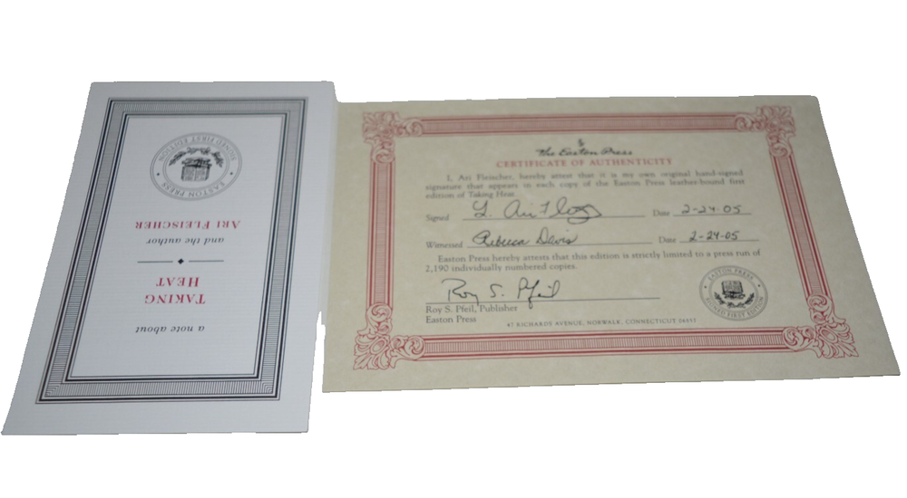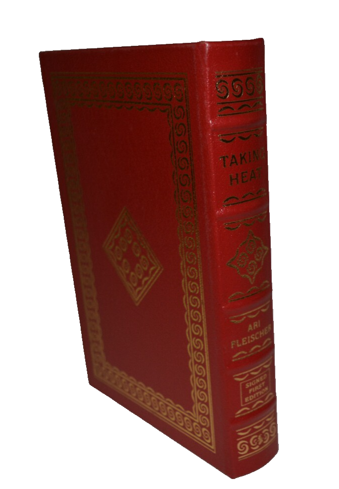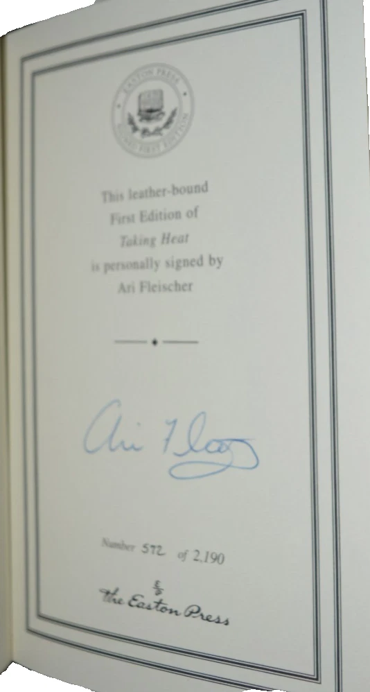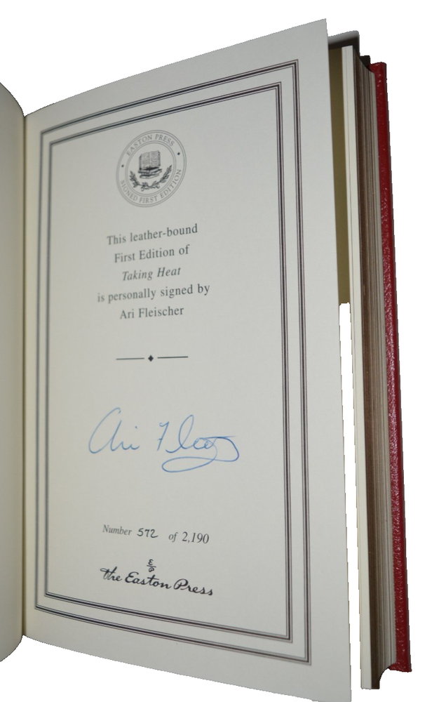 The product is a signed first edition leather book titled "Taking Heat" by Ari Fleischer, published by Easton Press in 2005. This limited edition collector's item includes a Certificate of Authenticity (COA) and is personalized by the author. The book falls under the genre of biography and autobiography, with a focus on political topics. It is a valuable addition to any collection of rare and signed books from the United States. Looks unread! No tears; no marks (other than signature); no bumped corners; no shelf rub Ship via USPS Media Mail Thanks!