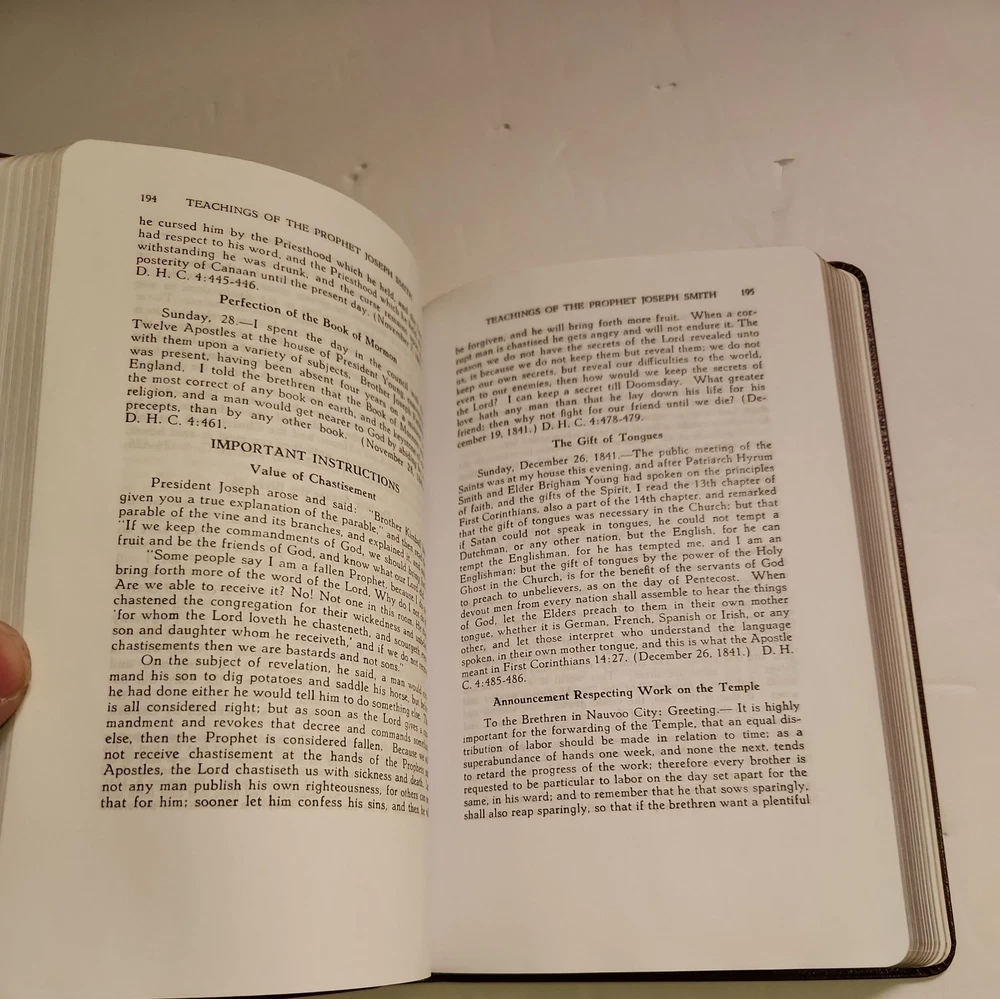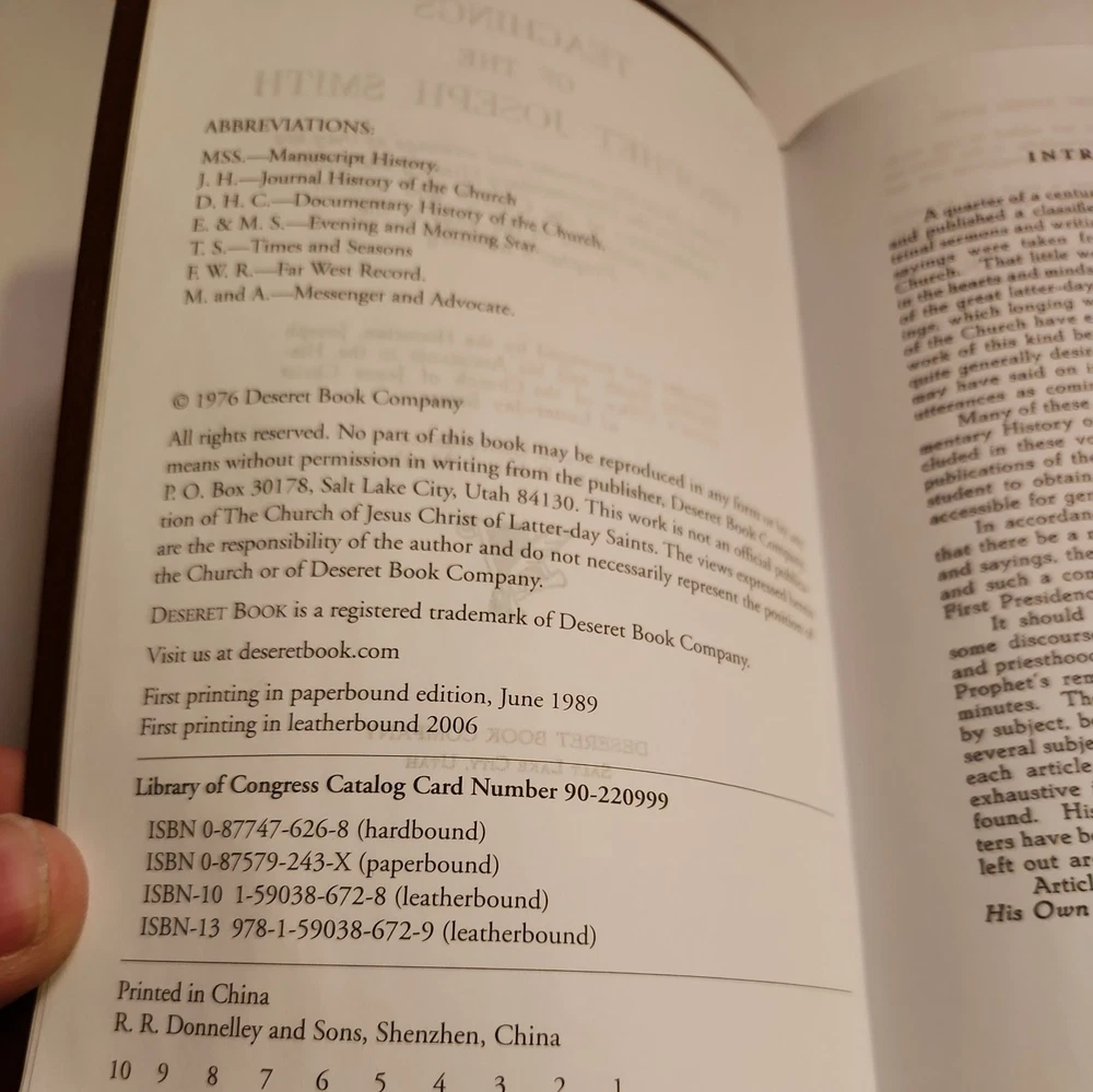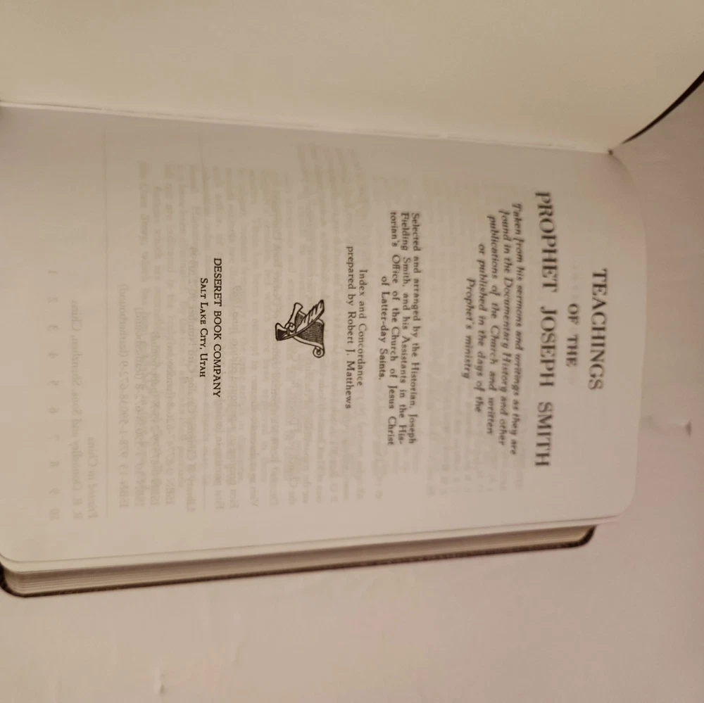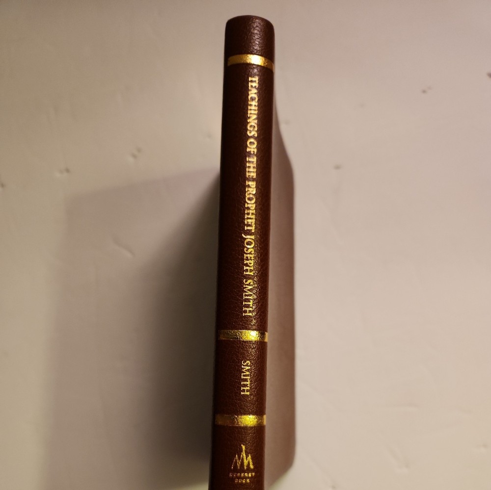 The product is a brown faux leather-bound book titled "Teachings of the Prophet Joseph Smith." Published by Deseret Book Company in 2006, this nonfiction historical book is intended for adults and features 438 pages. Written by the Church of Jesus Christ of Latter-day Saints, this biography & autobiography genre book explores religious teachings and topics related to the prophet Joseph Smith. clean text
