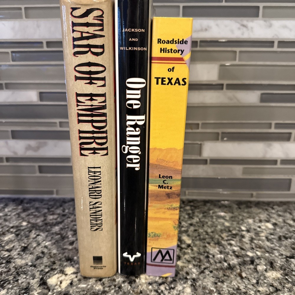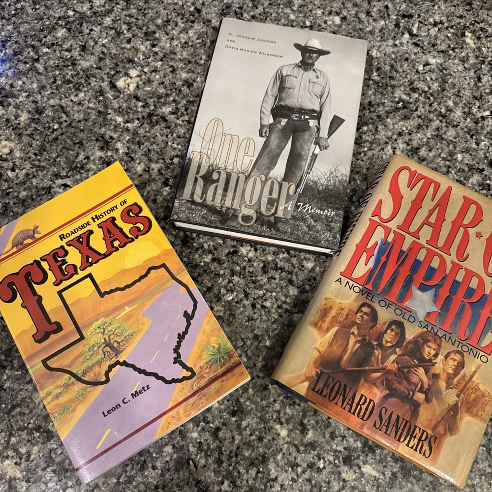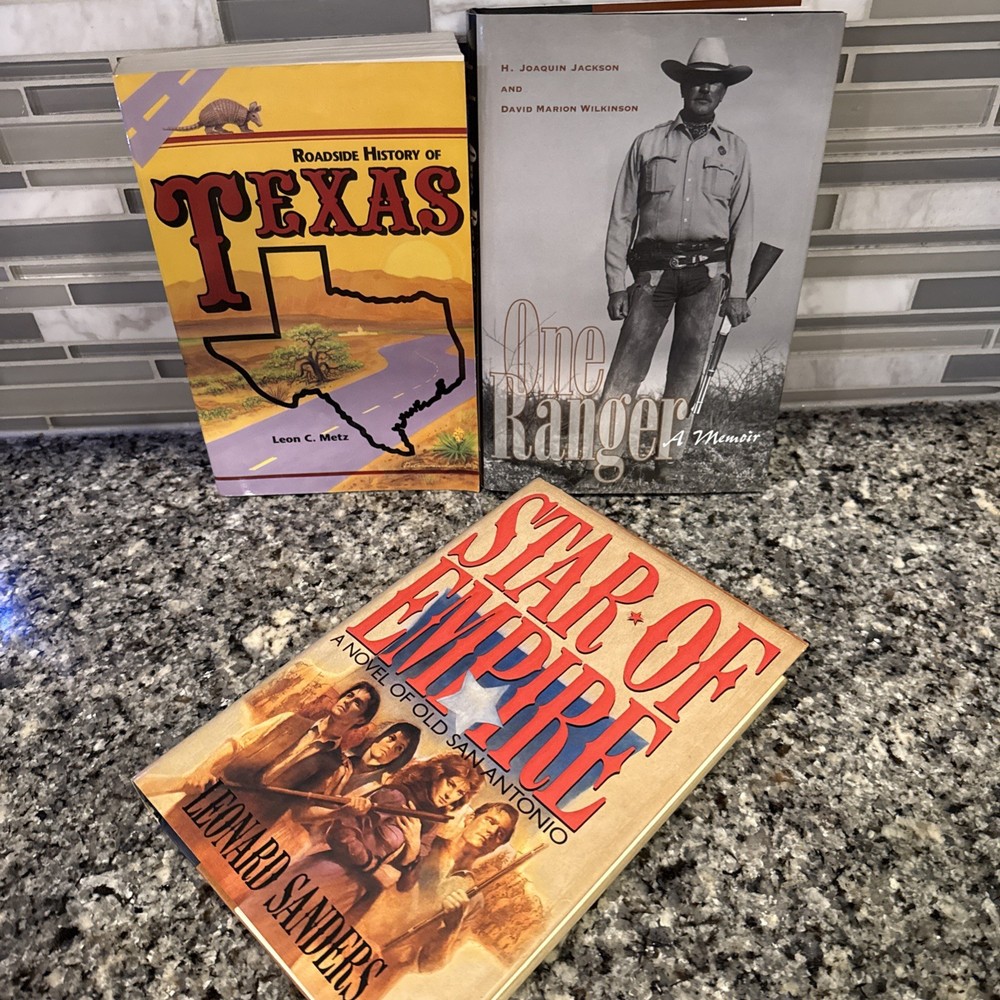 Texas Spirit Book Lot (3) | One Ranger Memoir, Roadside History, Star of Empire Novel | Western Americana Description: Immerse yourself in the heart and soul of Texas with this unique 3-book hardcover bundle — a powerful blend of memoir, folklore, and historical fiction. These volumes capture the grit, pride, and stories that shaped the Lone Star State, from its roads and rangers to its early frontiers. Included Titles: 1. One Ranger: A Memoir by H. Joaquin Jackson & David Marion Wilkinson • First-hand account of life as a legendary Texas Ranger • Hardcover with dust jacket; very good condition • Published by University of Texas Press 2. Roadside History of Texas by Leon C. Metz • A guided journey through Texas history by highway • Softcover in excellent condition • Packed with local legends, events, and regional charm 3. Star of Empire: A Novel of Old San Antonio by Leonard Sanders • Sweeping historical fiction set during Texas’ fight for independence • Hardcover with dust jacket; very good condition • Rich period detail and dramatic storytelling Genre & Subject Tags: • Texas History • Western Americana • Memoir & Biography • Historical Fiction • Travel & Roadside Folklore • Regional Collectibles Perfect For: • Texas history buffs and native Texans • Readers of American Western culture • Unique bookshelf or cabin/lodge décor • Gifts for lovers of frontier stories and state pride Condition Summary: All books in very good condition. Two are hardcovers with dust jackets, one is a softcover. No writing or major wear. Clean, collectible, and shelf-ready.