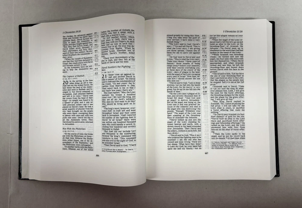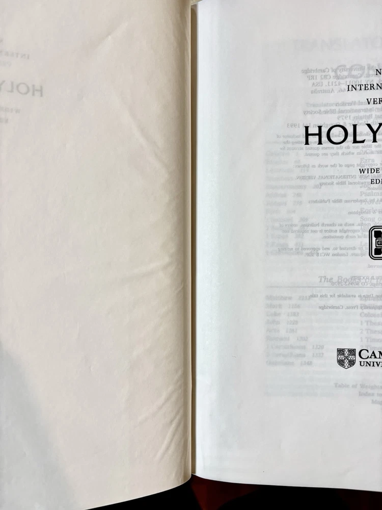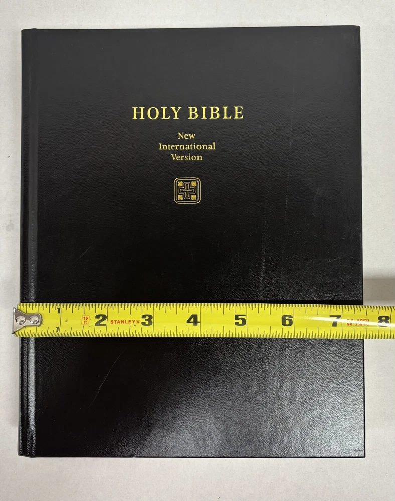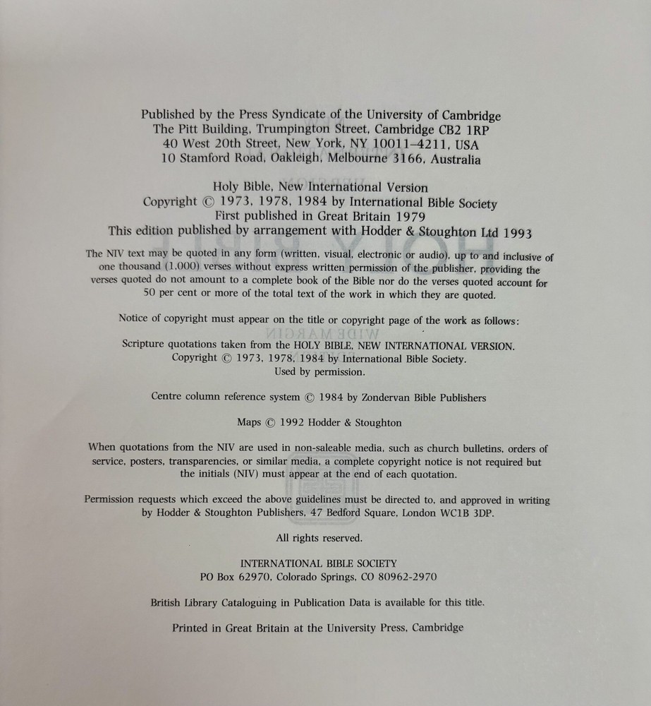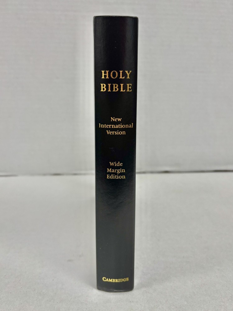 Pre-owned: Text Cambridge 1993 wide margin NIV Bible, black hard bound. Item is in overall very good condition. Some minor edge and general surface wear. Some blemishing to face. See photos for specific concerns. Includes: 1x Bible, as shown. From a smoke-free home. Other details: Please message me with any questions prior to bidding. Returns accepted within 30 days, refund given as money back, free return shipping. Thanks for looking!