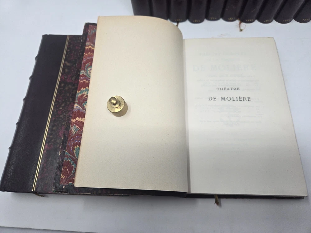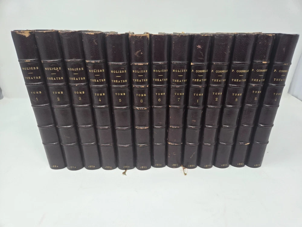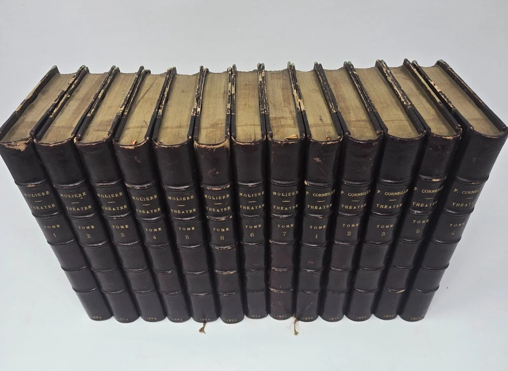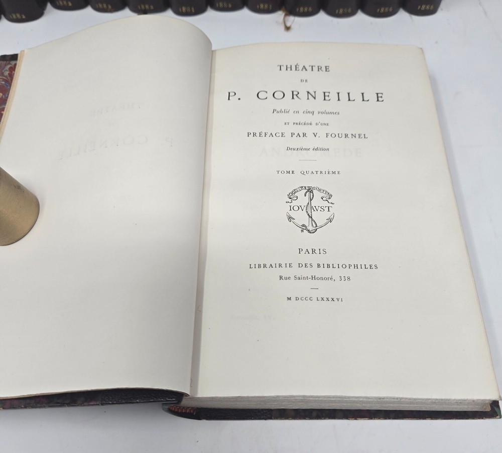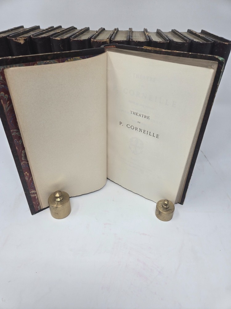 Theatre de P. Corneille, published in 1886 by the Librairie des Bibliophiles. Second edition, 5 volumes. Half leather. Marbled end papers and boards. Gilt top text block, deckled pages side and bottom. Some minor shelf wear to board edges as shown, otherwise in very good condition, solid boards and hinges, silk bookmark ribbon. NOTE: PHOTOS ABOVE SHOW IT COMBINED WITH SISTER SET OF MOLIERE. See that listing here: https://www.ebay.com/itm/196566547329 Five volumes.