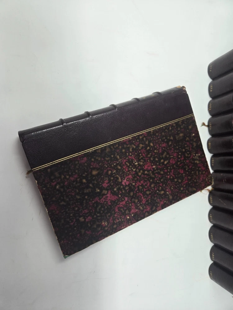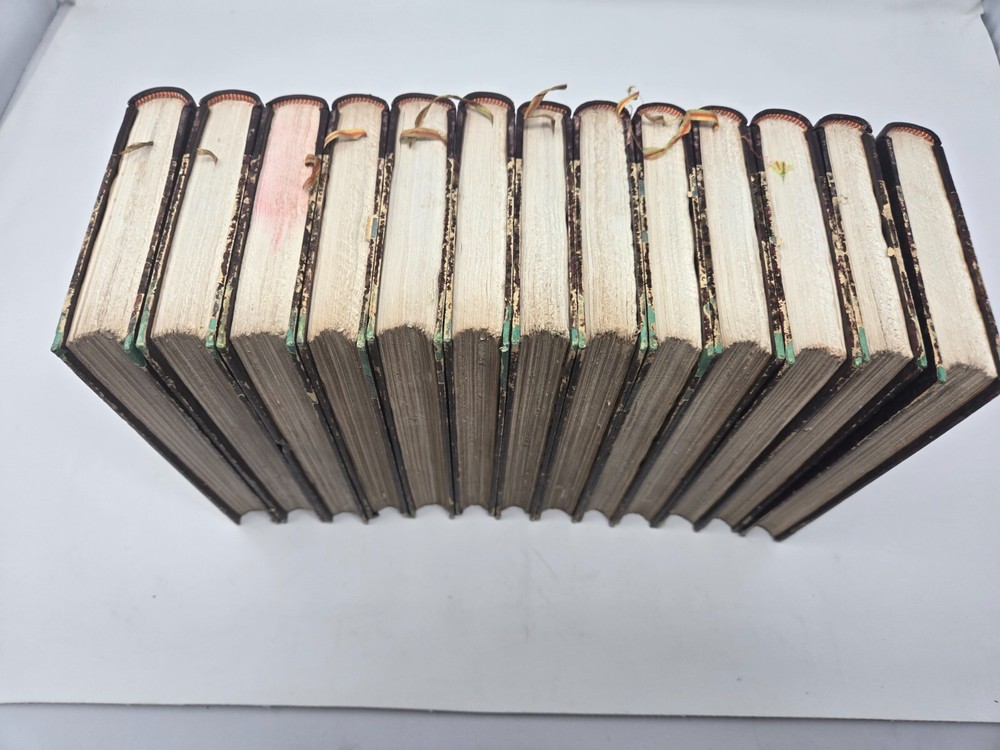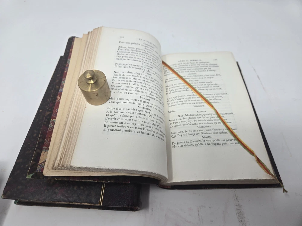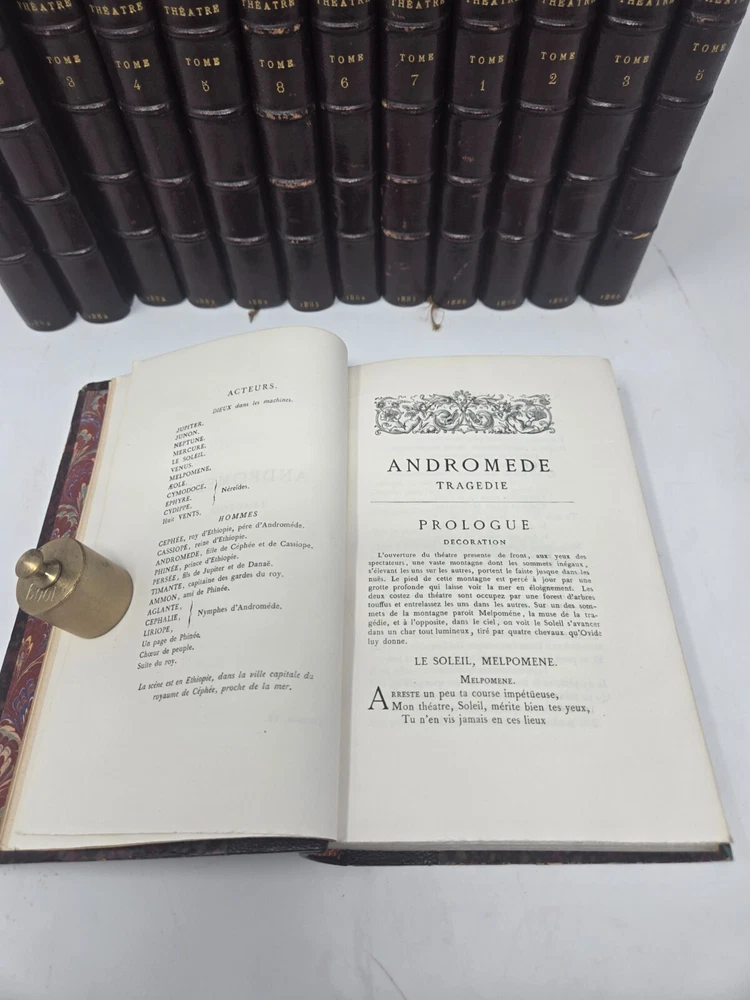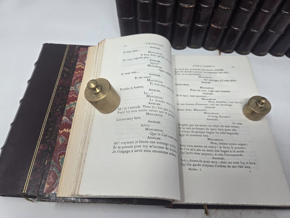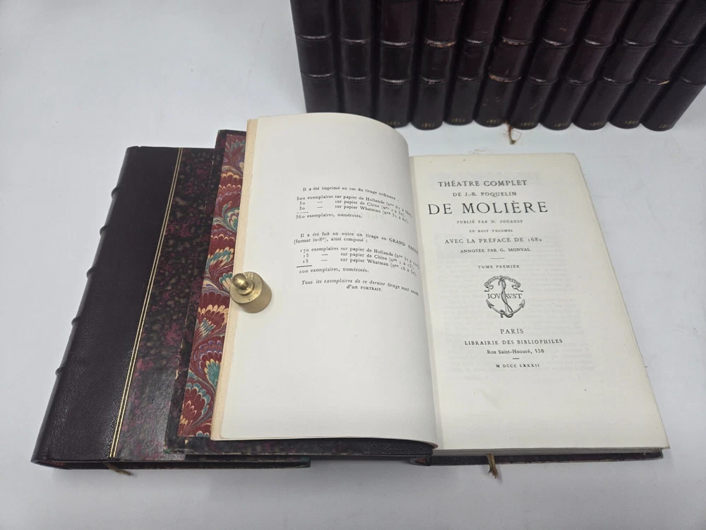 Theatre de P. Corneille, published in 1886 by the Librairie des Bibliophiles. Second edition, 5 volumes. Half leather. Marbled end papers and boards. Gilt top text block, deckled pages side and bottom. Some minor shelf wear to board edges as shown, otherwise in very good condition, solid boards and hinges, silk bookmark ribbon. NOTE: PHOTOS ABOVE SHOW IT COMBINED WITH SISTER SET OF MOLIERE. See that listing here: https://www.ebay.com/itm/196566547329 Five volumes.