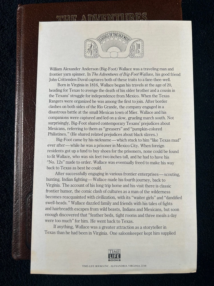 This vintage copy of *The Adventures of Big-Foot Wallace* is a gem for Old West enthusiasts! The book is in excellent shape—tight binding, unmarked pages, and even includes the original marker ribbon and series flyer. Minimal shelf wear, as shown in the photos, but it's been well cared for. Love that it ships securely in protective packaging, not just a flimsy bag. A fantastic addition to any collection! Thanks, Montana!