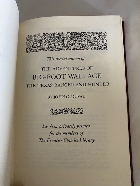 As a nineteen year old he had heard that one of his brothers had been killed in the Battle of Goliad, an early confrontation in the Texan war of independence with Mexico, and swore to travel West to “take pay of the Mexicans” for his brother’s death. In the following years he fought time and again against the Mexicans for the newly formed Republic of Texas and saw action at Salado Creek, Hondo River and during the Mier Campaign. After returning for the wars in Mexico he abandoned the Texan military and joined the Texas Rangers under the leadership of John Coffee Hays and served for a number of years defending Texans against Native American and border bandits along the frontier. This riotous narrative of the adventures of one of the saltiest and most individualistic pioneer Indian fighters that the state ever produced is told in a leisurely, satirical fashion that reflects a way of life long since lost. Duval's chronicle of one of Texas' greatest adventurers is filled with Wallace's humor and colorful speech. Wallace emerges from the book in all his vigor and robustness, and the reader is transported to a rugged, uncultivated frontier where a few men who were rough enough were carving out a new empire. The flavor and the spirit of early Texas have been captured for countless readers by John C. Duval's Big Foot Wallace. About one-fourth of Big Foot Wallace is devoted to a detailed account of Wallace's experiences in the Mier Expedition. The remainder of the book deals with his adventures on the frontiers of Texas as an Indian fighter, a soldier of fortune, and a member of the first company of Rangers. John C. Duval, the author of Big Foot Wallace, has been called the first man of letters in Texas. Earlier Texans devoted their time to writing about politics and land, but Duval wrote of the frontier and its people with a clarity of perception equaled by few writers in any period. Duval was a man of the camp and range. Civilization did not fit him very well, and he spent much of his time in the wilderness alone. Like his friend and companion, Big Foot Wallace, Duval was an adventurer whose experiences were varied and exciting. In Big Foot Wallace Duval relates a number of his experiences that had been shared with Wallace. Writing late in life, Duval set down memories of events that had mellowed with time. He strove for pictorial and dramatic effects, not historical accuracy. Still Big Foot Wallace has been acclaimed by historians for its amazing accuracy. This book was published in 1870. Duval passed away in 1897 and Wallace in 1899. 291 pages, hardcover. "Like new" condition. Well-Kept in smoke free, pet free home.