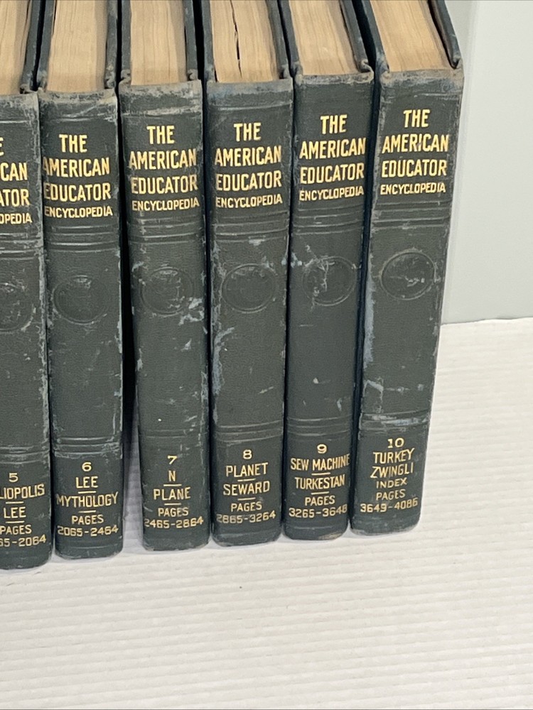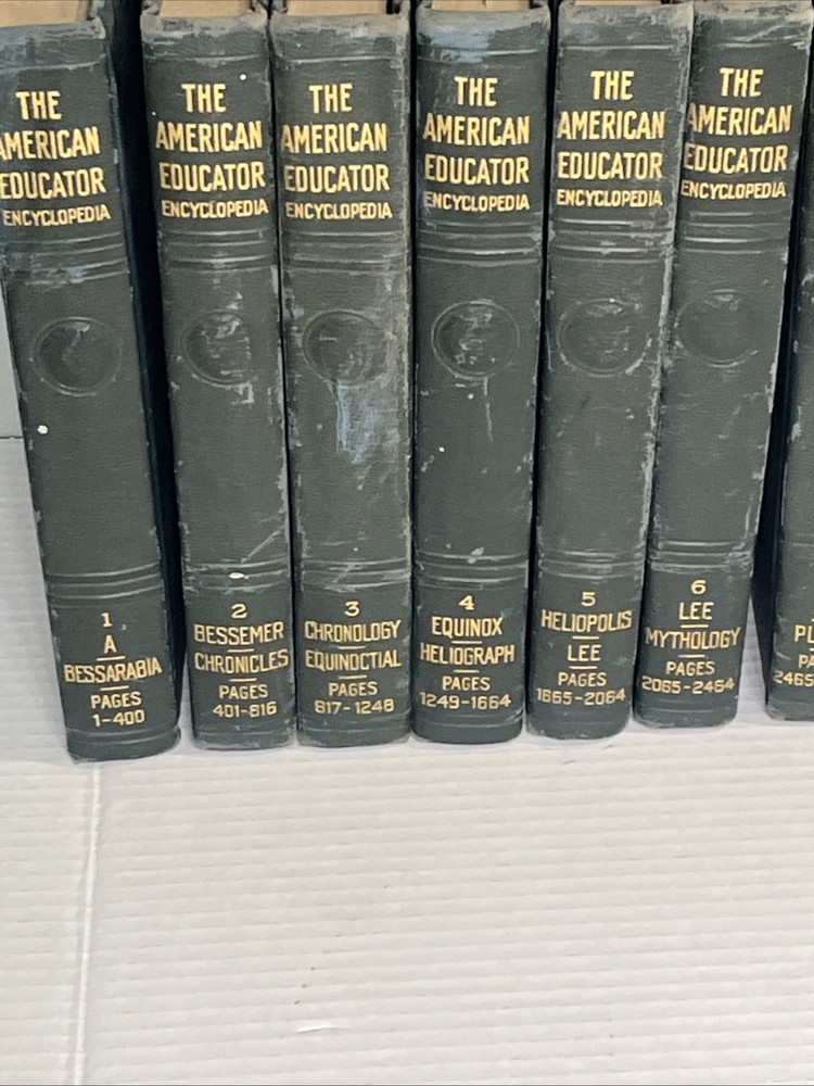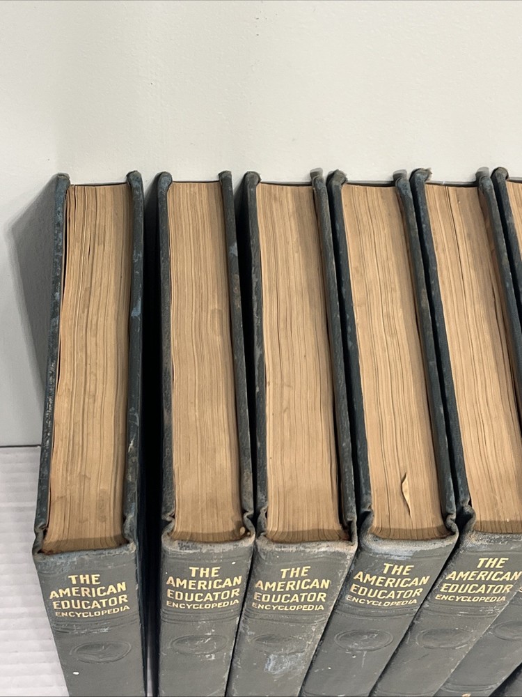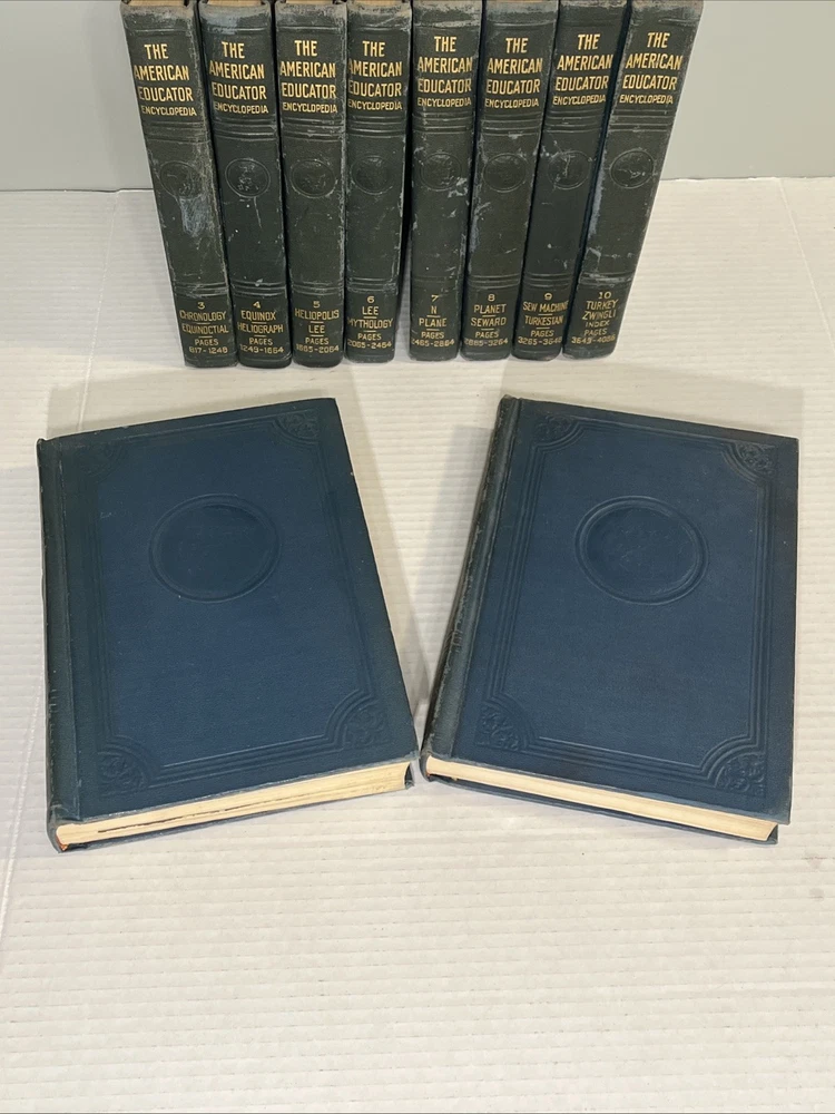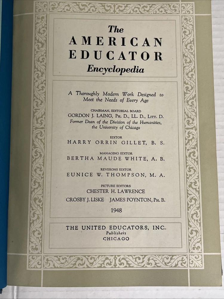 The American Educator Encyclopedia is a complete set of 10 volumes published by The United Educators, Inc. in 1948. The encyclopedias are bound in tooled leather with an embossed dark blue cover. The editors of the encyclopedia are the authors of this reference book. The book is written in English and is an original copy printed in the United States.