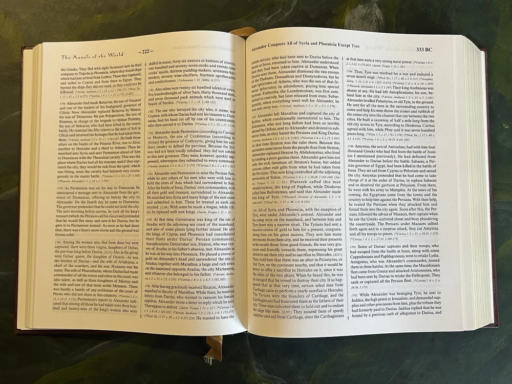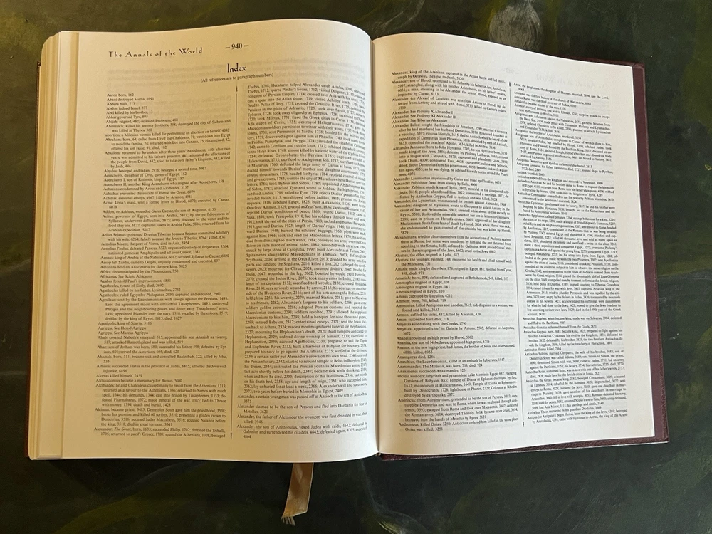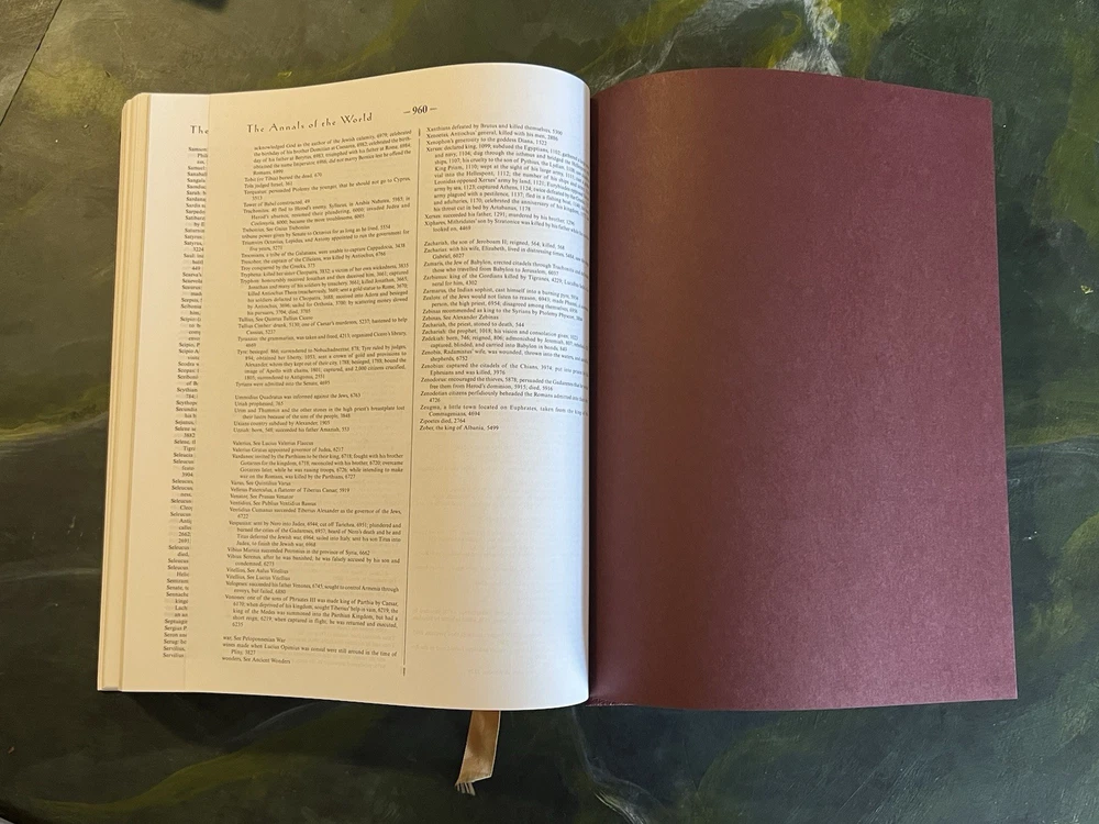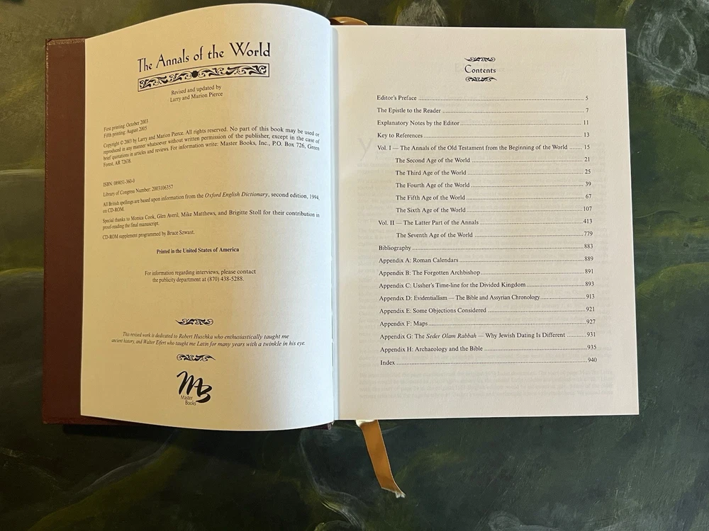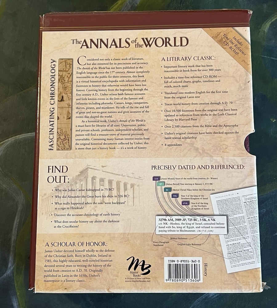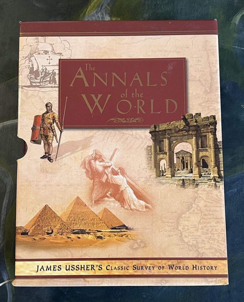 THE ANNALS OF THE WORLD, James Ussher's Classic Survey of World History Master Books, 5th Printing 2005, Oversize Hardback in a sleave. Gold Embossed Cover and Spine, Gilded Page Edges, Ribbon Bookmark, Book appears new. Proceeds benefit the Winter Haven, FL Public Library. Thank you for supporting this worthy cause. See photographs for condition and email any questions. From a private collection. L - 04/25