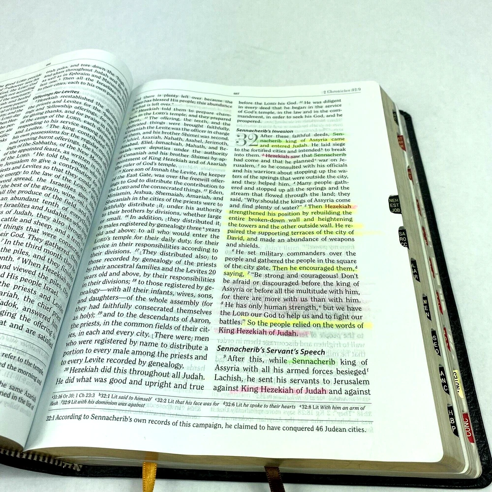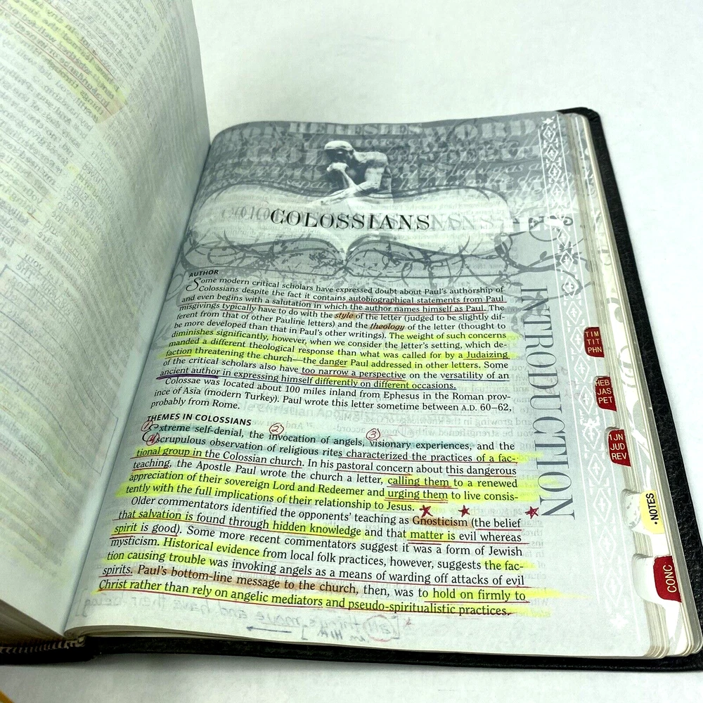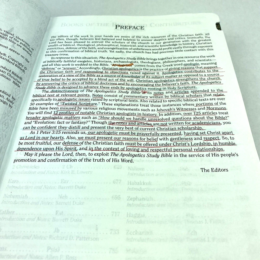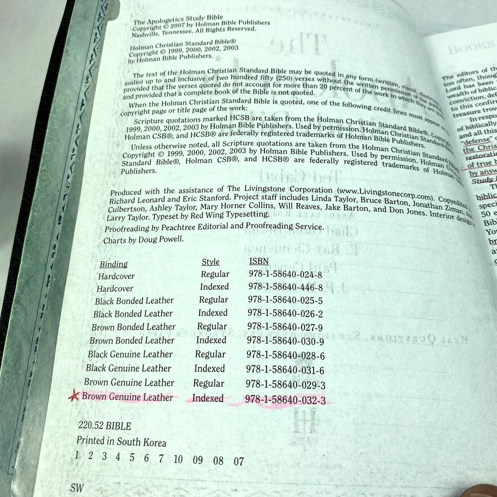 This Bible is a fantastic resource for deep study! The brown leather cover has a nice, broken-in feel, and the tabbed chapters make navigation easy. Though preowned, it's in solid condition with some shelf wear—perfect for anyone who loves a well-loved book. The highlighting and notes add character, making it feel like a personal study companion. The apologetics insights are incredibly helpful for understanding tough questions. Highly recommend for anyone looking to grow in their faith!