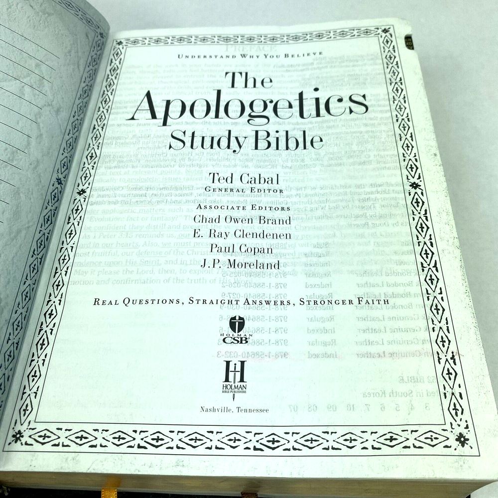 The Apologetics Study Bible Brown Leather Holman Bible Publishers Condition is Preowned. Has Shelf Wear. Please see Pictures for reference. Feel free to contact Us for any questions you may have. We Aim for 100% satisfaction. Highlights and underlining/note taking throughout book Great Copy Slipcover has Shelf Wear Chapter Books are Tabbed