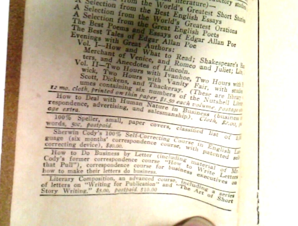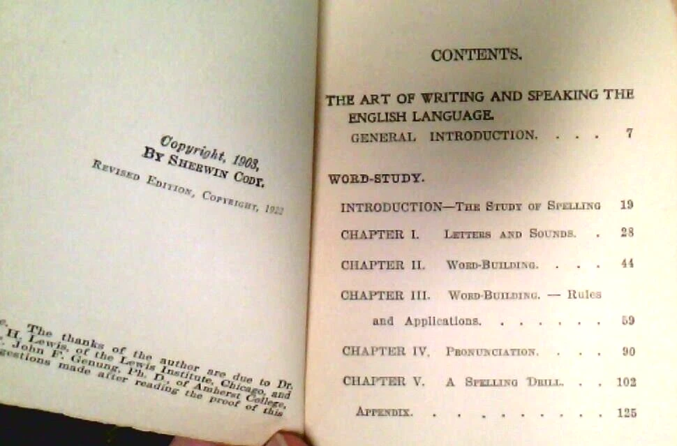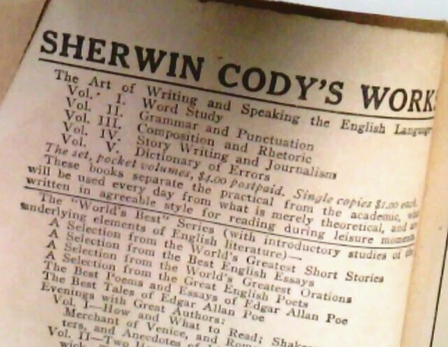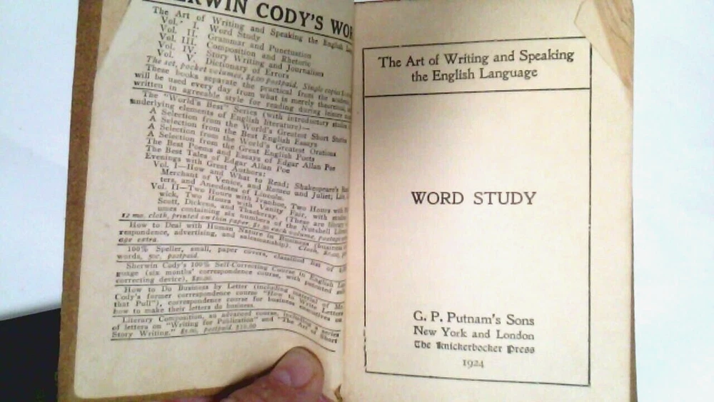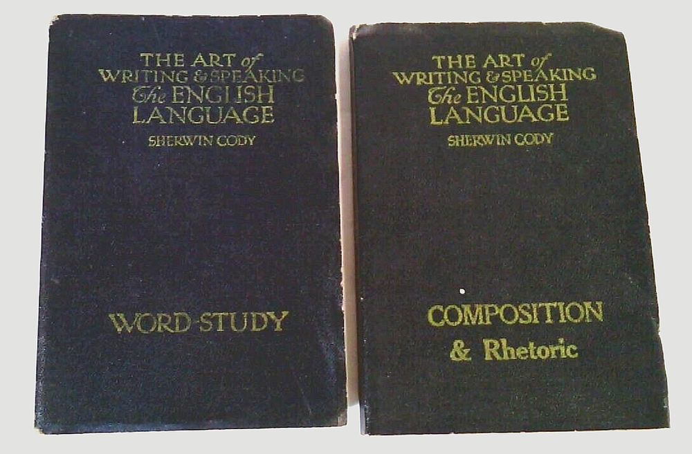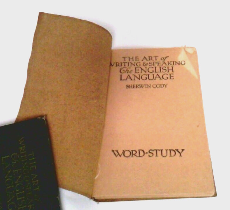 The Art Of Writing And Speaking The English Language ~Sherwin Cody ~1905 ~Set of 2 ~(1) Word-Study ~(2) Composition & Rhetoric ~ DESCRIPTION Format: Booklet, Softcover ISBN (International Standard Book Number)/ EAN (European Article Number)/ UPC (Universal Product Code): N/A Author(s): Sherwin Cody Date of Publication: 1922 Publisher: Sherwin Cody School of English Classification/ Genre: Education/ Academic Instruction Number of Pages: 124 Dust Jacket Cover: No Binding: Yes Art, Illustrations, Diagrams, Cartographical Representations (Maps), and/ or Photographs: No Notable Attribution: N/A