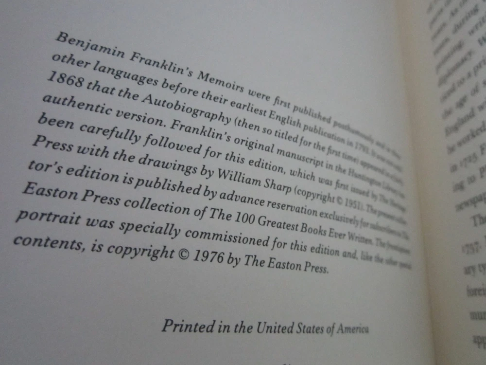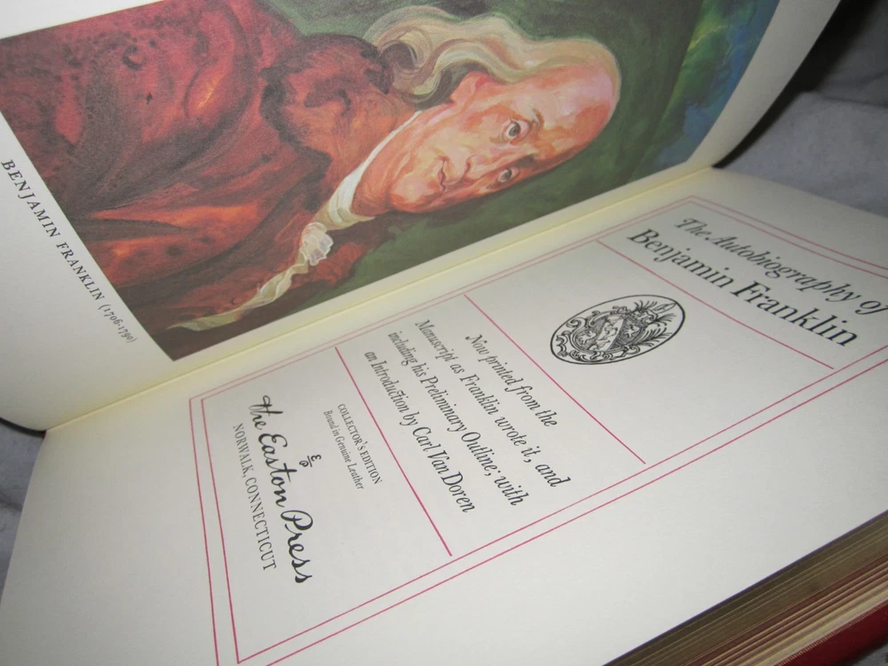 The Autobiography of Benjamin Franklin Collectors Edition Easton Press HC NM Leather 1976 in excellent condition like new, you will receive the one in the pictures. This will be shipped within 24 hours of receiving cleared payment or local pickup is available and I also combine shipping but do not pay until I send you a updated combined shipping invoice. NJ Residents sales tax will be added at checkout