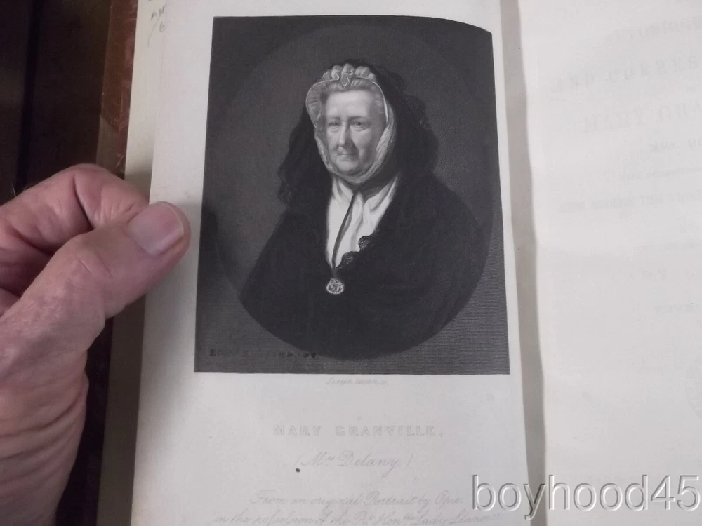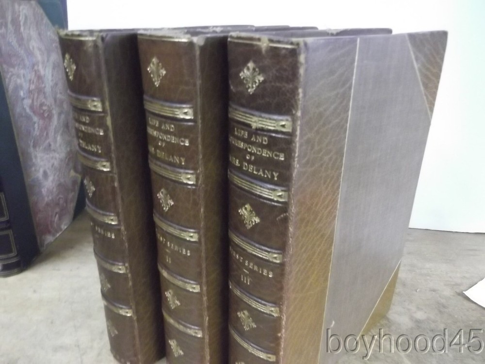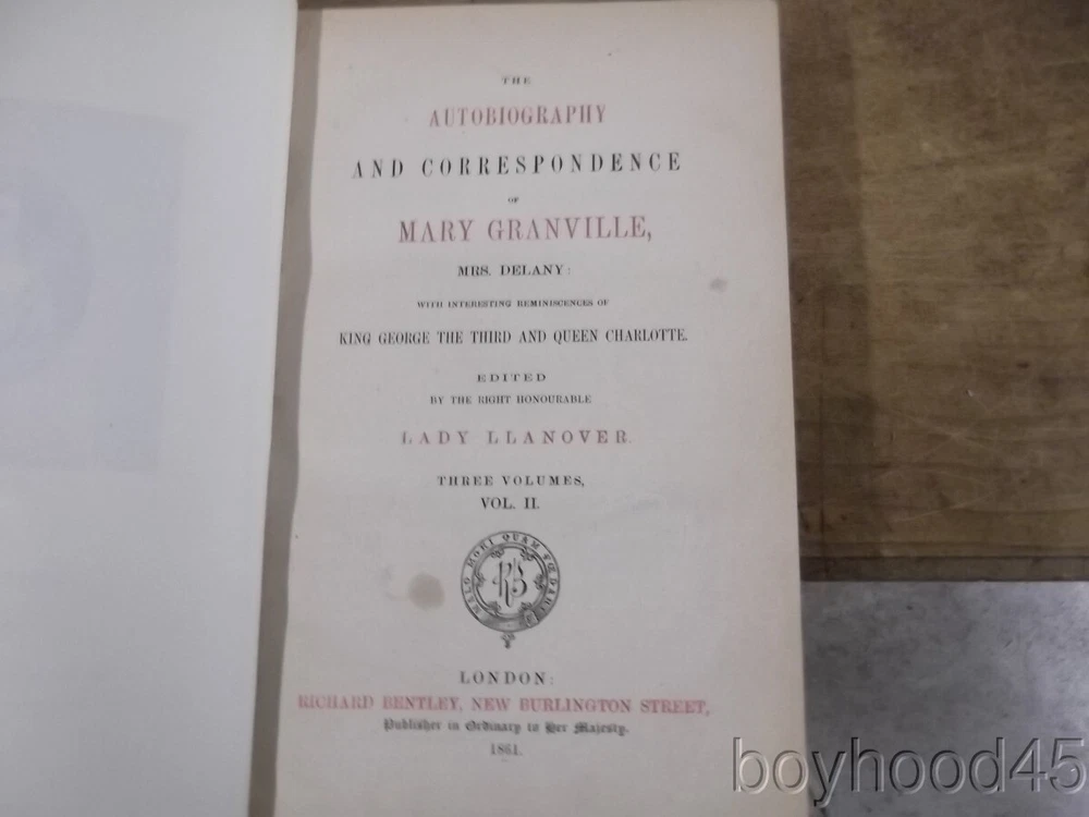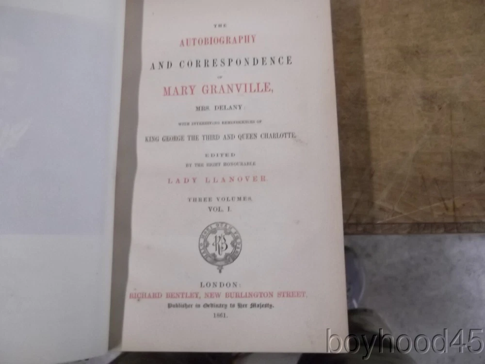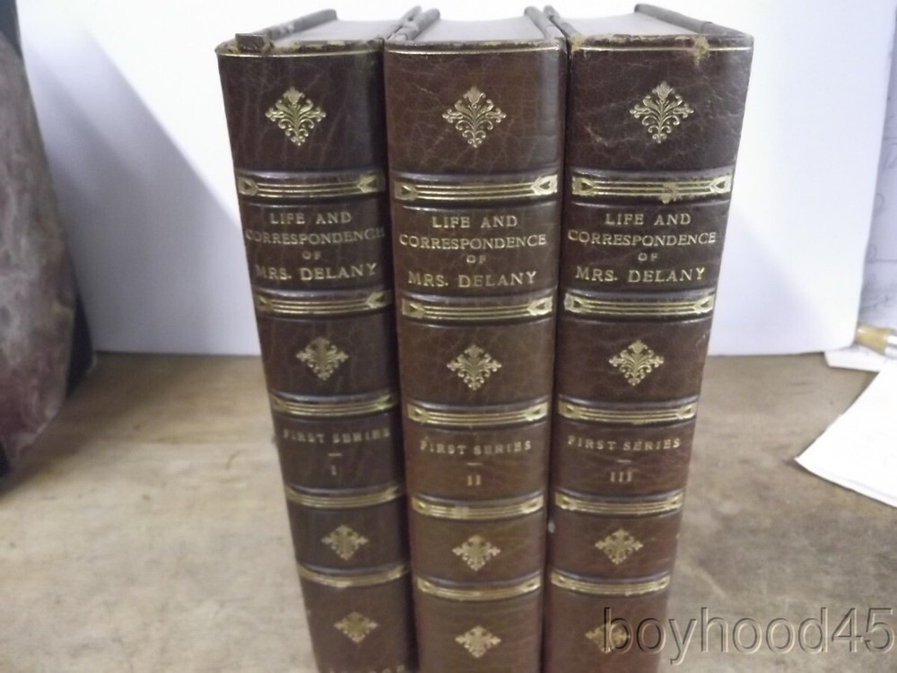 The Autobiography & Correspondence of Mary Granville, 3 Vols., LEATHER, 1861 The Autobiography & Correspondence of Mary Granville, 3 Vols., LEATHER, 1861 Click images to enlarge Description This is "The Autobiography and Correspondence of Mary Granville, Mrs. Delany: With Interesting Reminiscences of King George the Third and Queen Charlotte," edited by Lady Llanover. FIRST SERIES, PUBLISHED IN THREE VOLUMES. Published by Richard Bentley, London, 1861. First Edition. Bound in half leather. Shows light edgewear to head of spine area of Vol. I, light general wear--a Very Good set. Clean, tight, complete. Books measure 5 3/4 X 8 3/8, each volume over 600 pages. A SCARCE FEW copies of this set can be found on other internet booksites for upwards of $275, with individual volumes being offered for upwards of $86 EACH!!! I will offer this lovely 3-volume set for only $115 plus $10.00 S&H in the US. (Rm 2, L, Case 5, Shelf 2) Condition Notes: A clean and lightly-worn set!! Payment Paypal Shipping Domestic shipping: Fixed Shipping Charges. International shipping: Fixed Shipping Charges. Shipping Carrier Domestic International Shipping Locations Usps Book Rate $10.00 - - Usps Priority Intl - $90.00 Worldwide I will ship to: United States, Worldwide Vendio Images: More than just a pretty image. 250+ Mobile Responsive & Active Content Free Listing Templates with Vendio Sales Manager. Vendio provides powerful selling automation for sellers of all sizes. Get business information that counts! - Vendio Counters are active content free.